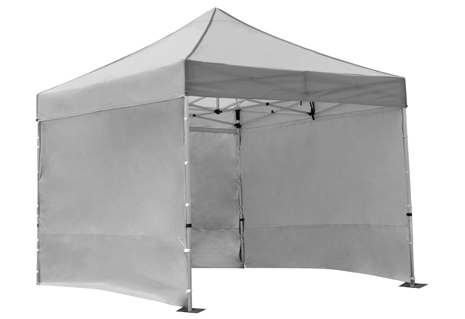 The new Handy Tent Profi folding tent is available in three different sizes (3 × 3 m, 4.5 × 3 m and 6 × 3 m). The folding tent for events and outdoor events convinces with its simple and quick setup. The hexagonal supports ensure high system stability. The structure of the outdoor tent is made of silver-colored, anodized aluminum. If the system is really damaged, it can be easily repaired, as the cross-scissors are bolted and not riveted. The roof tension of the tent is increased by a practical crank. The professional folding tent Handy Tent is available in 10 standard colors. Of course, an individual printing of the roof and the side panels is possible. This is done over the entire area via Termosublimationsdruck. The separation of the seams is covered with joint cover tape. This is available in white or black. All fabrics for walls and roof are made of 500D polyester, UV stabilized and B1 certified. The seams are waterproof up to 2,000 mmHg. Custom-made products such as doors and windows can be produced on request.