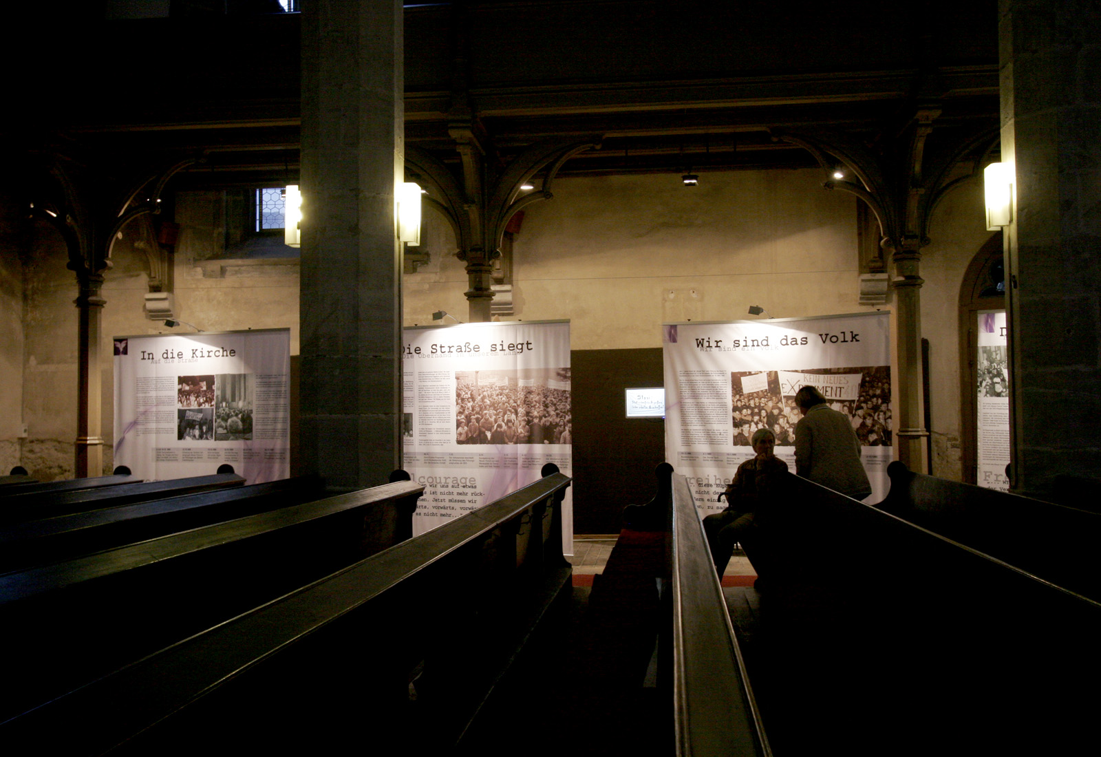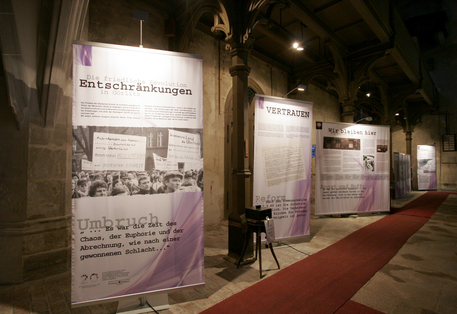 Gezeigt wird eine Ausstellung, die den Weg zur Deutschen Einheit von der friedlichen Revolution im Herbst 1989 bis zur Wiedervereinigung am 3. Oktober 1990 nachzeichnet. Mit freistehenden Präsenationssystemen von OCTANORM werden die verschiedenen Aspekte, die zur Wiedervereinigung Deutschlands geführt haben, dargelegt. Von dem gelieferten Datenmaterial wurden bei MARTINCOLOR großflächige Textildrucke gefertigt, die in der hauseigenen Näherei entsprechend konfektioniert wurden. Für die Ausstellung, entschied sich unser Kunde, der Freistaat Sachsen, für das Ausstellugssystem OCTApole, dass auch doppelseitig mit textiler Grafikbespannung eingesetzt werden kann. Anders als bei den bekannten Scherengittersystemen oder Ausstellungswänden ist es mit OCTApole möglich, eine komplette Wandabwicklung oder auch einzelne Systemelemente leicht und komfortabel aufzubauen, zu transportieren und für weitere Einsätze oder mit neuer Grafikbespannung wiederzuverwenden. Da das System komplett aus Aluminium gefertigt ist, verfügt es natürlich auch über eine Brandschutzzertifizierung, was für den Ausstellungseinsatz unerlässlich ist.