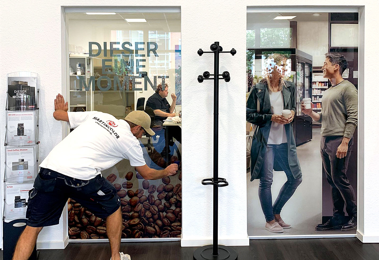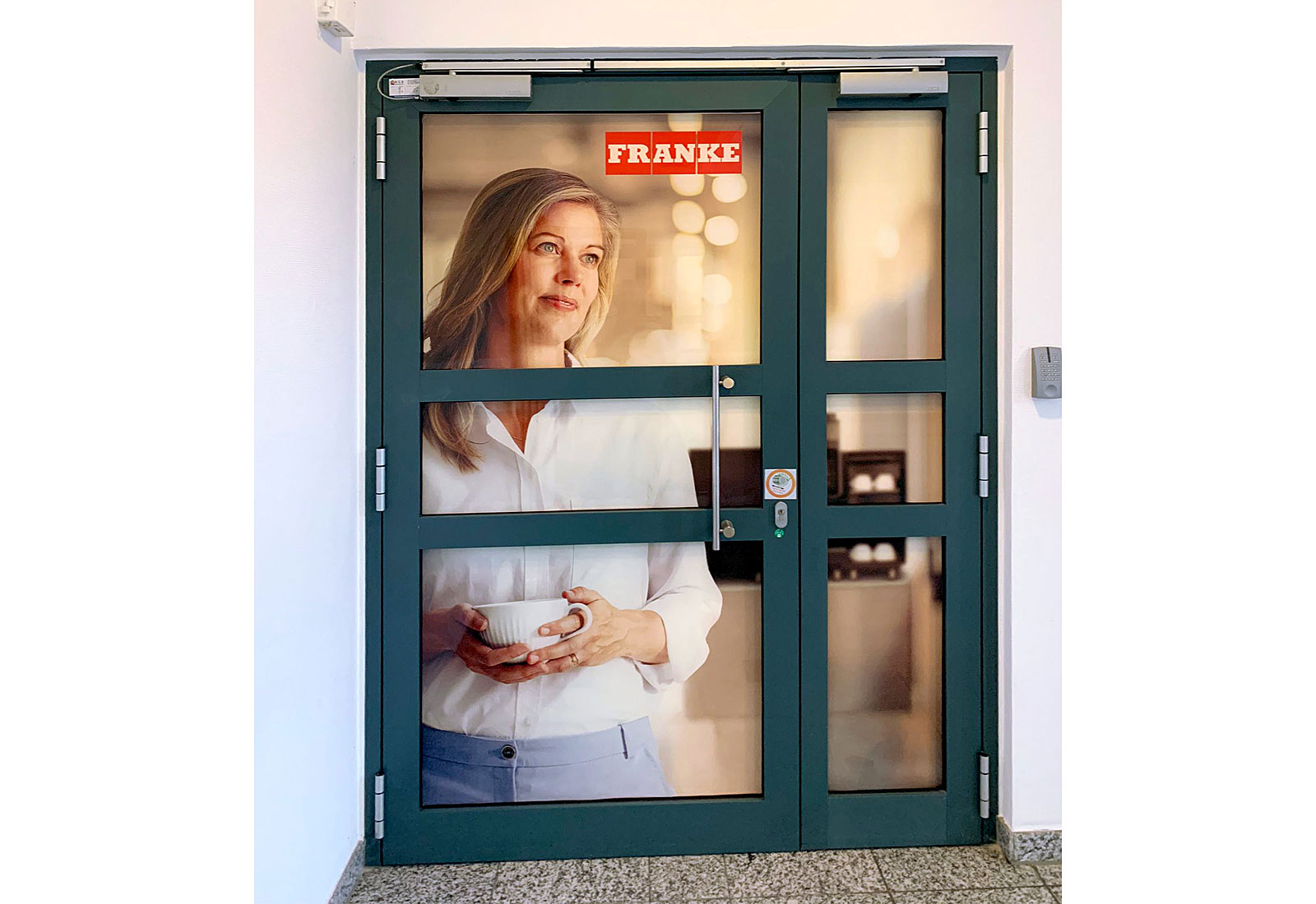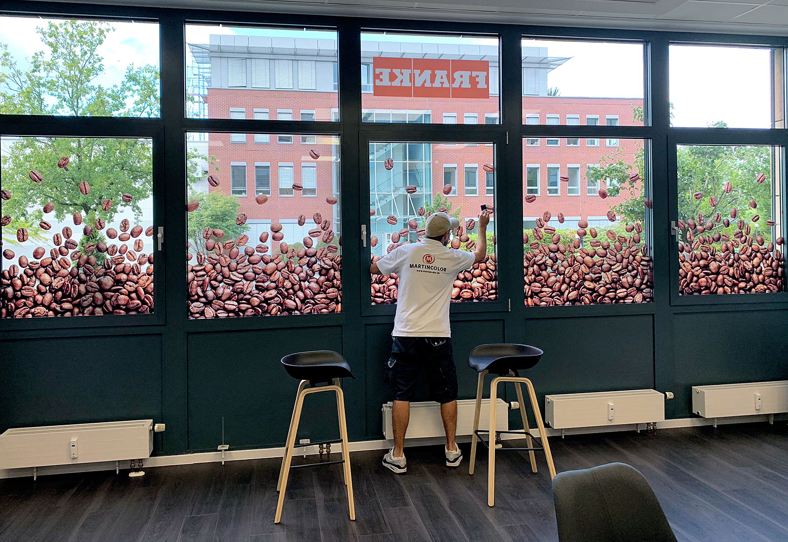 Martincolor produzierte mehrere Tür- und Fensterfolien für „Franke Coffee Systems“ mit individuellem Design zur Ausstattung derer Räumlichkeiten. Diese wurden dann von unserem professionellen Montage-Team angebracht. Die nackten Glasfronten der Fenster und Türen von Büroräumen wurden verkleidet und erhielten somit eine ganz persönliche Note, die das Unternehmen widerspiegelt. Der Sichtschutz, der dabei entsteht, bringt eine gewisse Ruhe zwischen die Räumlichkeiten und schirmt das Personal von parallel ablaufenden Geschehnissen ab.