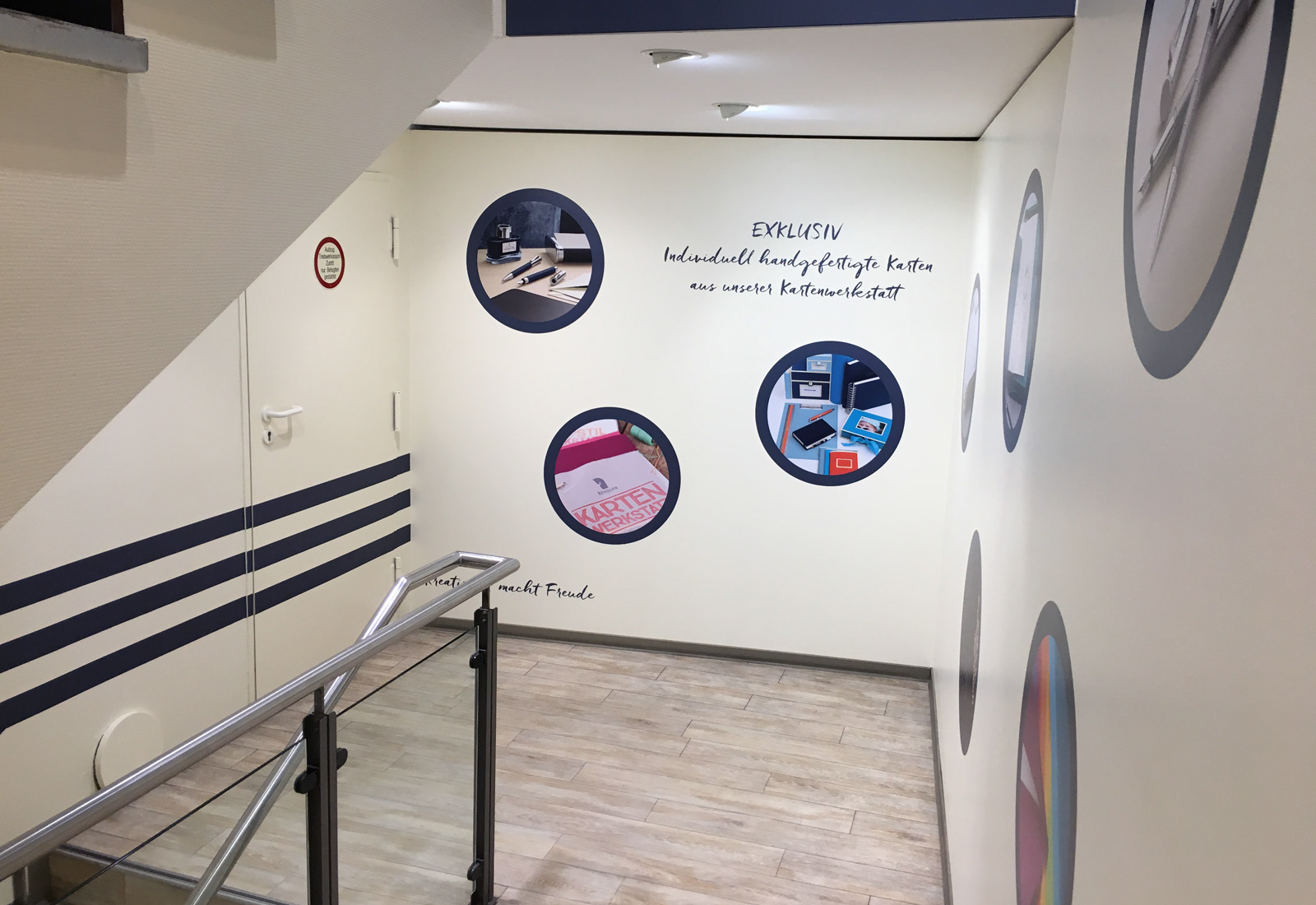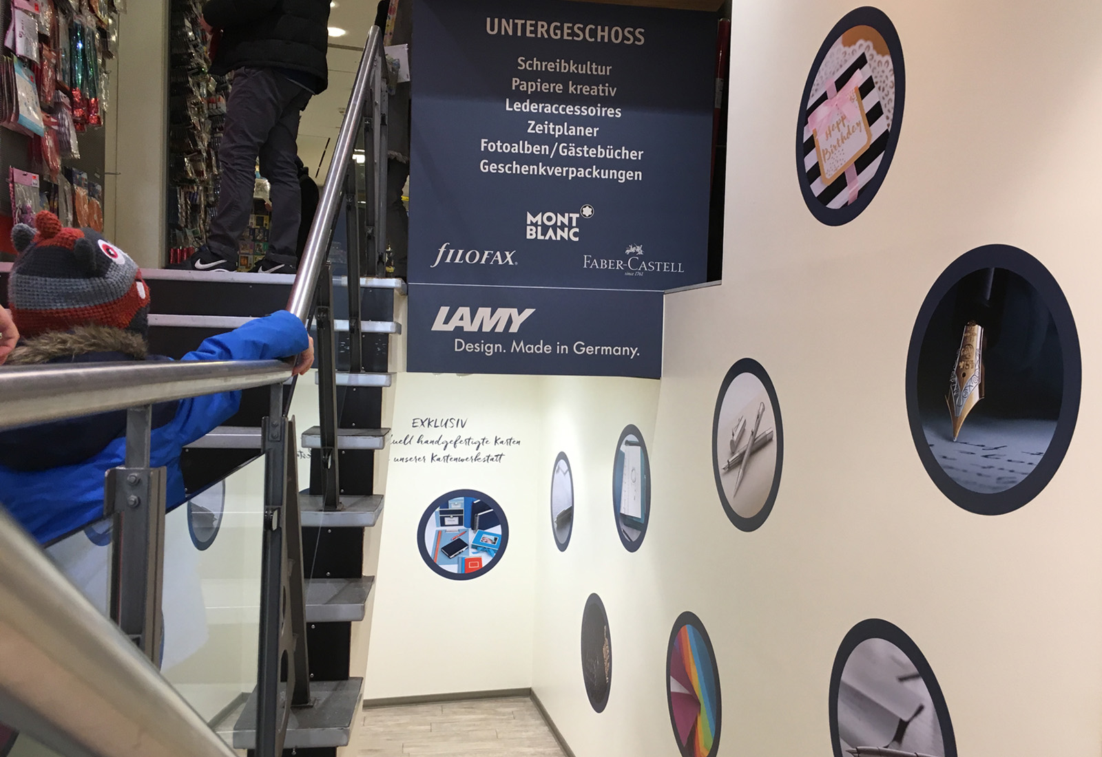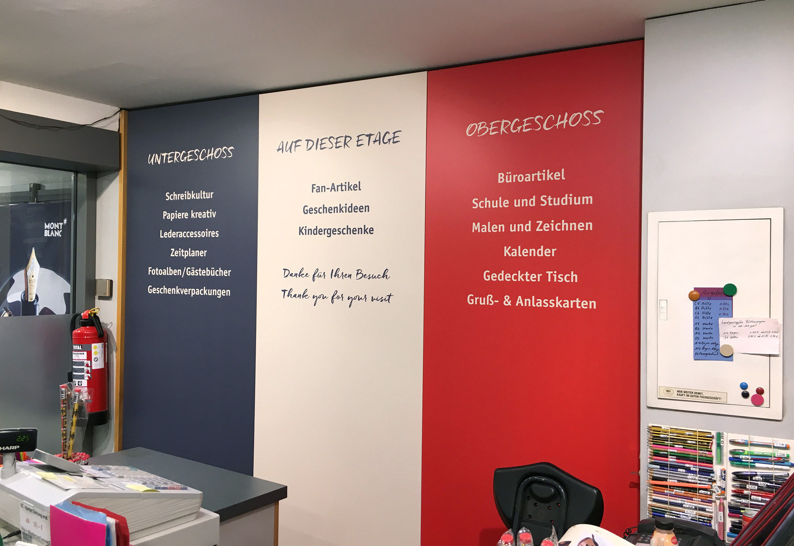 Für das Frankfurter Ladengeschäft des Papierwaren-Spezialisten Papier-Kraemer fertige MARTINCOLOR zahlreiche Wandbebilderungen & -verkleidungen, Wandtattoos, Aufkleber, Firmenschilder und das ladeninterne Leitsystem. Sowohl die grafischen Vorarbeiten als auch die komplette Montage vor Ort wurde von MARTINCOLOR übernommen.