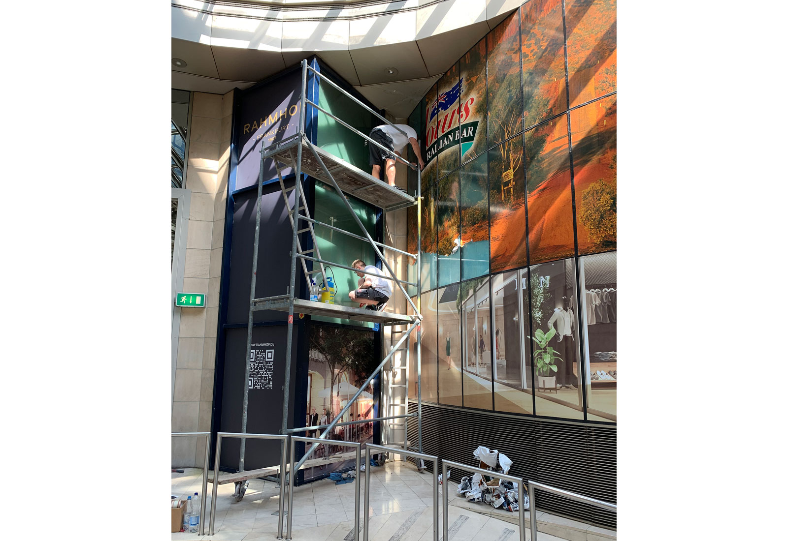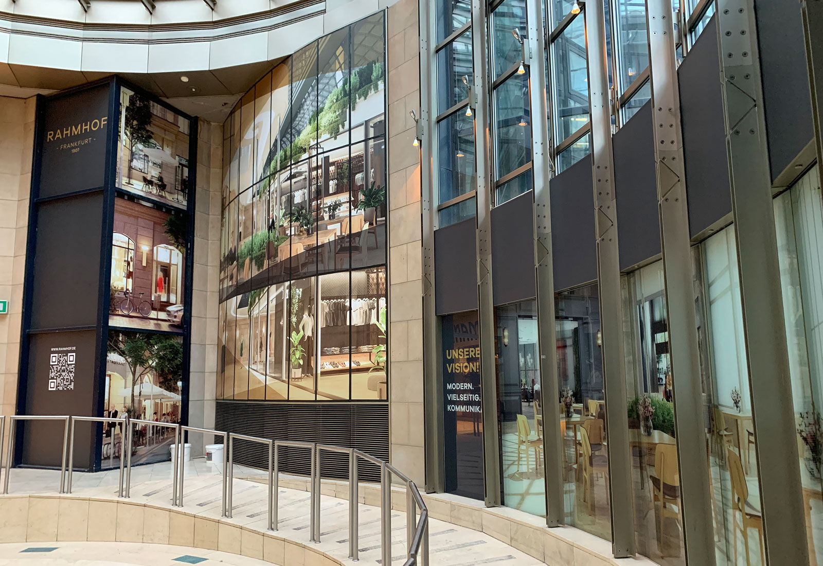 Während der Umbauarbeiten in der Schillerpassage, die sich im Herzen von Frankfurt befindet, durfte MARTINCOLOR für dieses Projekt großflächige Klebefolien produzieren. Die Beklebungen und Montagen erfolgten auf den Schaufenstern der zur Zeit frei stehenden Einkaufsläden, die sich zur Passage hin öffnen. Zusätzlich wurden innerhalb der Passage die Geschäftsfassade, die aus Glastüren besteht, der Aufzugsschacht sowie das Treppenhaus mit großformatigen Bildern beklebt. So entsteht der Eindruck, dass sich die Schillerpassage während des Umbaus komplett "im Einsatz" befindet. Die Motive verleihen der gesamten Passage eine elegante Ausstrahlung und beeindruckende Wirkung. Unser professionelles Montageteam montierte vor Ort sämtliche Beklebungen. Zusätzlich wurden Tapeten und Wandtattoos für die „Rahmhof“-Büroetage produziert und ebenfalls vor Ort montiert.