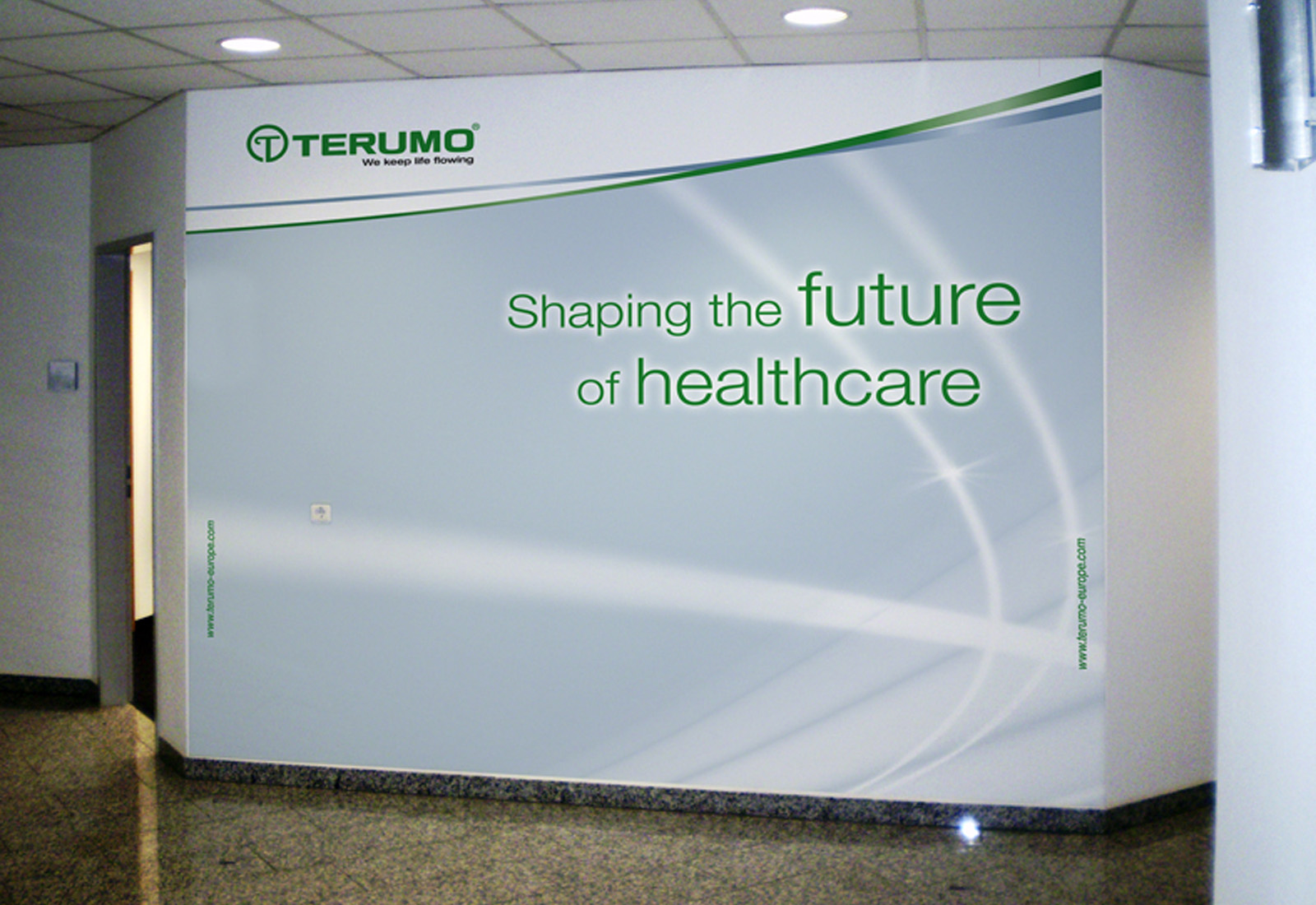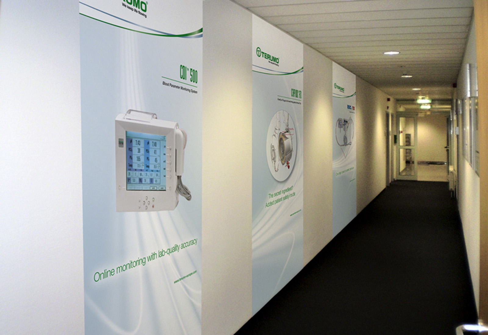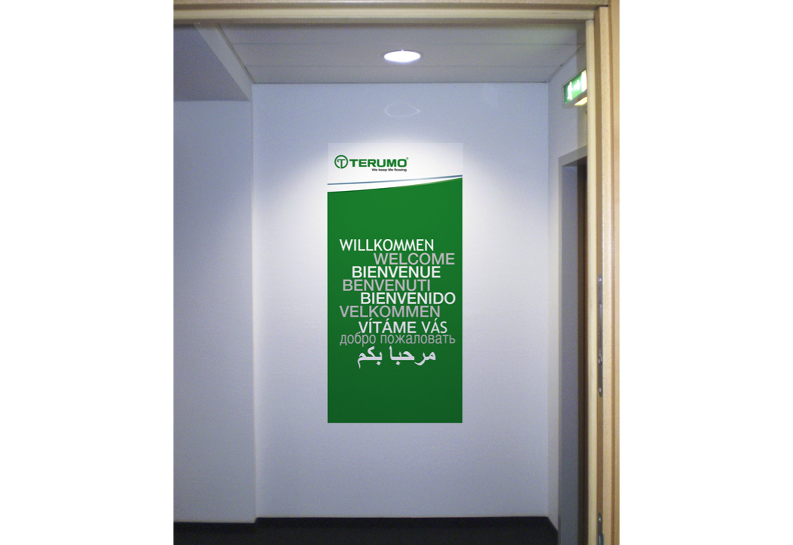 Für die Terumo Deutschland GmbH bebilderten wir die Gänge zu den Büroräumen mit großflächigen Tapentendrucken. Tapetendrucke werden bei der Ausgestaltung von Büroräumen immer beliebter. Denn so können großflächige Bebilderungen kostengünstig auf weiße Wände aufgebracht werden. So wird jede Büroetage individuell gebrandet. Mit großflächigen Tapeten verleiht man auch sterilen Räumen eine besondere Atmosphäre. Neben Tapetenbeklebungen brachte das MC-Montageteam auch Blickschutz-Folien an zahlreichen Fenstern an.