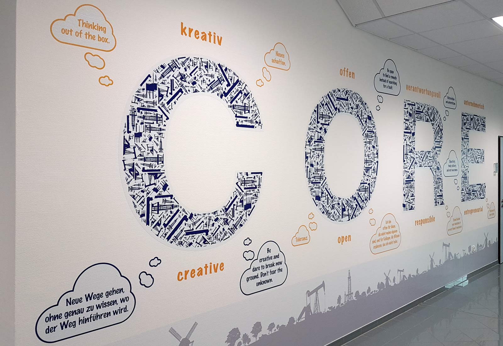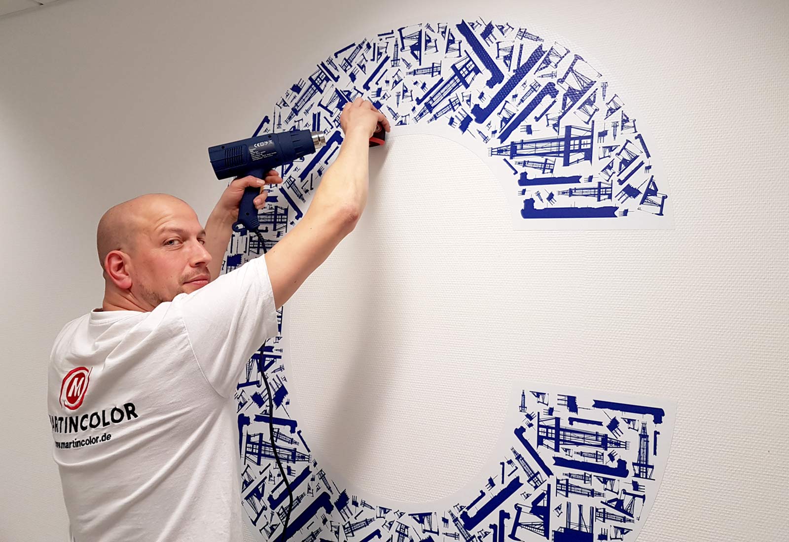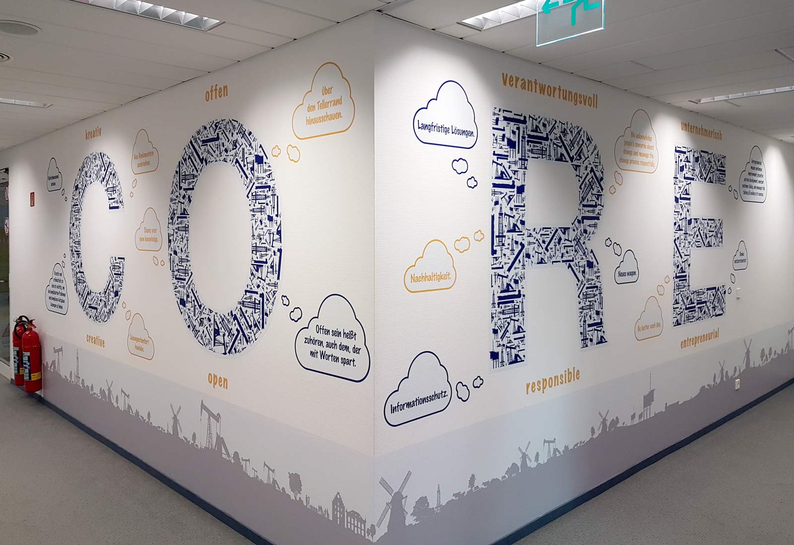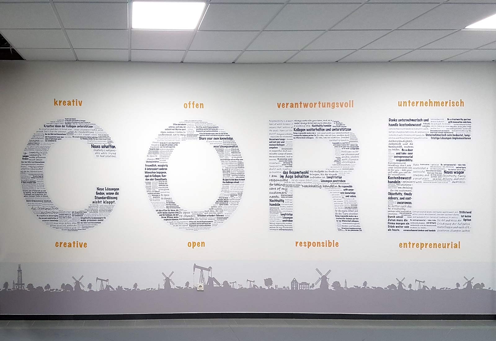 Zur Verschönerung und Personalisierung der Zentrale der Wintershall Holding GmbH produzierte MARTINCOLOR zahlreiche individuelle Tapetendrucke, Wandaufkleber, Wandtattoos, Beschriftungen und Fensterbeklebungen. Die Montage vor Ort übernahm unser MARTINCOLOR-Montageteam. Je nach Anforderung der Montagen können wir aus unserem Montageteam Werbetechnikern, Elektriker, Maler und Schreine bereit stellen. Mehr Informationen zu unserem umfangreichen Programm "rund um Ihre individuelle Bürogestaltung" erhalten Sie von unserem Spezialisten unter +49 (0) 69 756080-27.