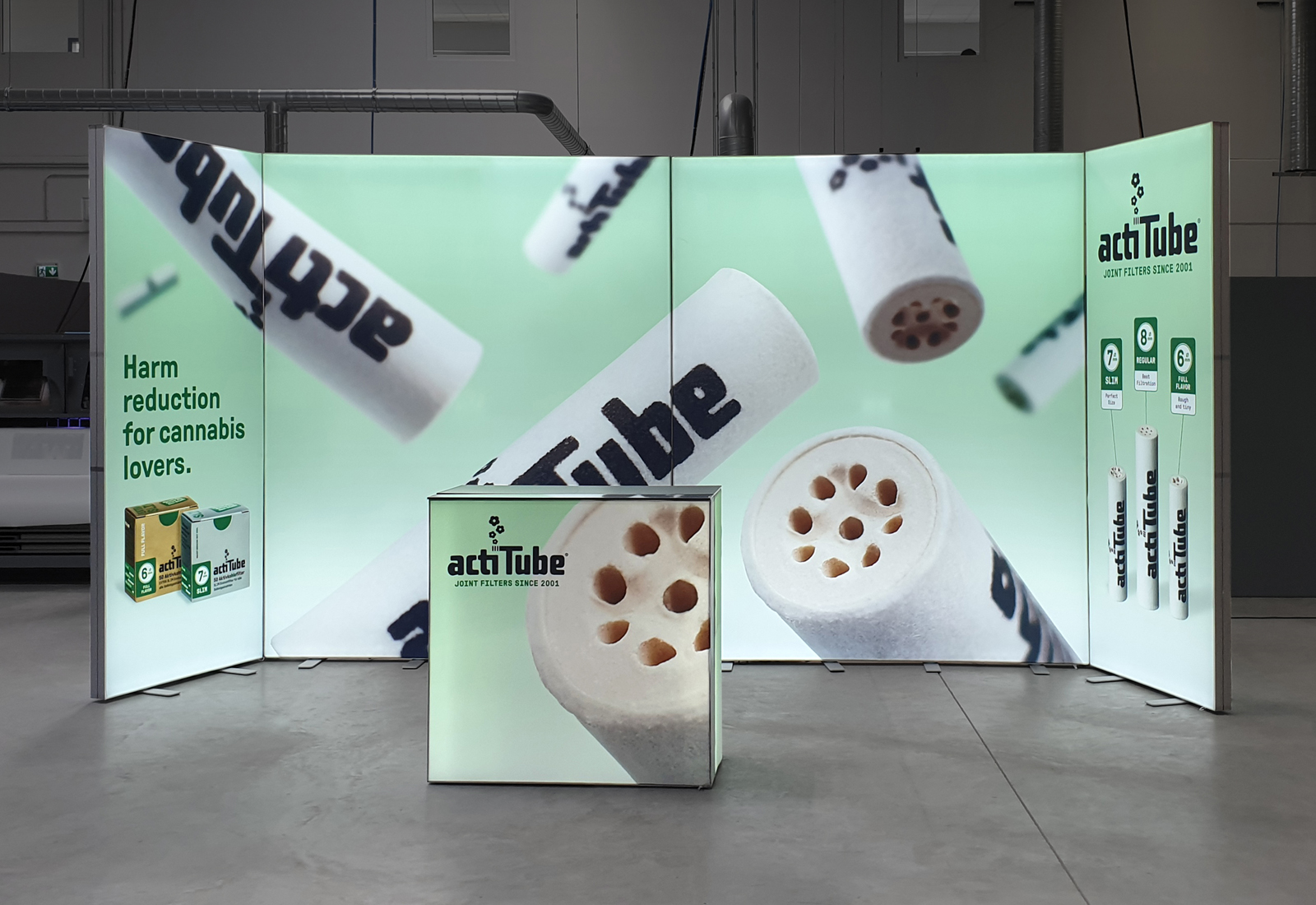 Das Unternehmen „actiTube“ entschied sich für das mobile und kostengünstige ALU LightUp Messesystem, um alle Blicke der Messebesucher auf sich zu ziehen. Das System besteht aus mehreren Modulen in unterschiedlichen Größen (85 – 200 cm breit und bis zu 250 cm hoch). Sie haben die Möglichkeit die Systeme nebeneinander oder einzeln zu positionieren. Die 8 cm breiten Aluminiumprofilen lassen sich ohne großen Aufwand und ganz ohne Werkzeug zusammenstecken. An diesem Beispiel kann man gut sehen, dass die individuelle Grafik, die auf textilem Diamaterial gedruckt wird, von einem Modul ins andere übergeht. Mit einer umlaufenden Nut lässt sich die Bespannung leicht einstecken. Lust auf etwas Neues? Kein Thema, denn die Werbebotschaft kann jederzeit aktualisiert und auf das System angebracht werden.