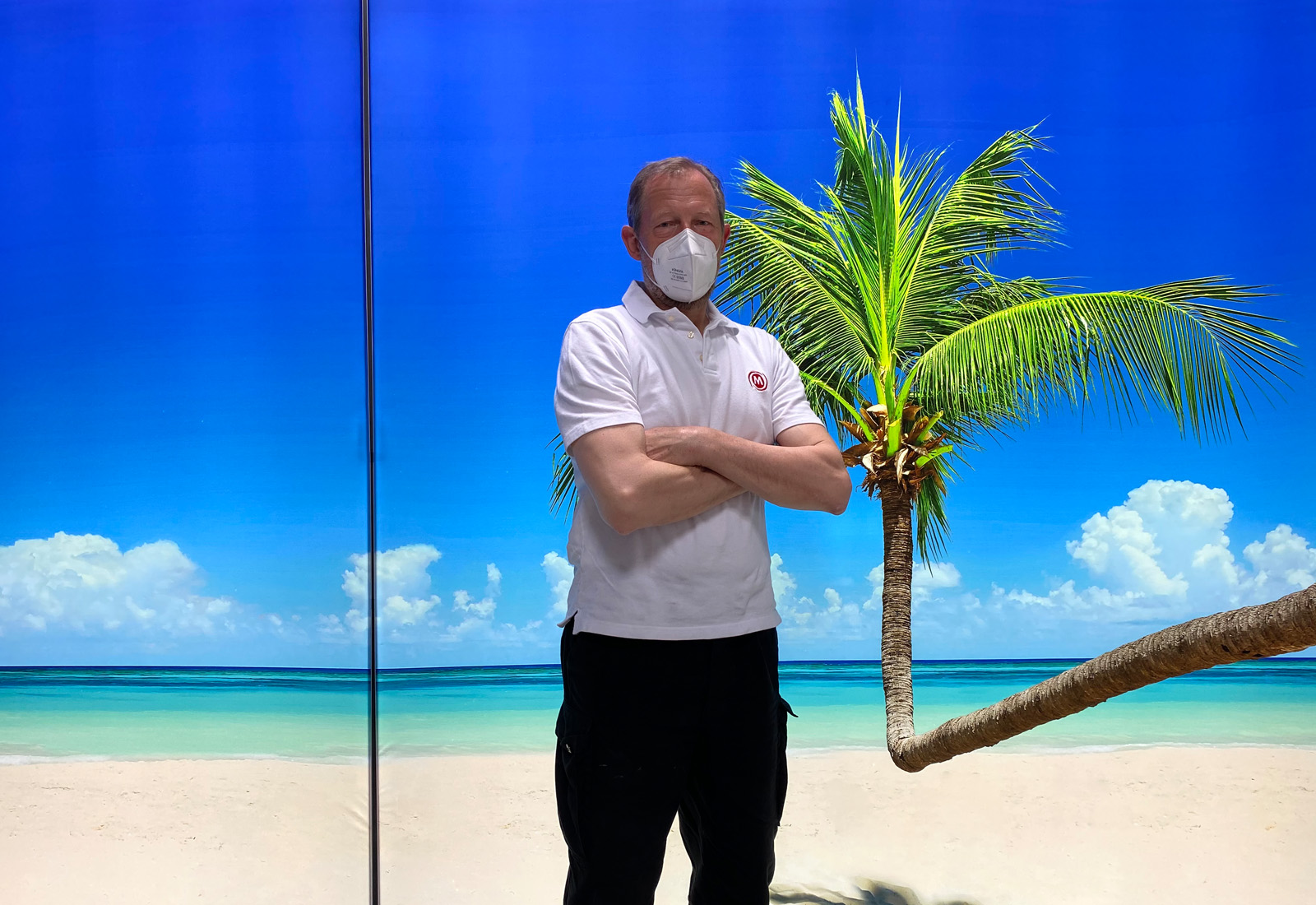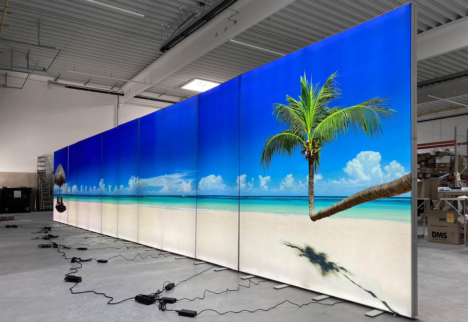 Die 12 m breite LED-Lichtwand, die wir für die apprendo GmbH gefertigt haben, überzeugt auf der einen Seite durch ein mega großes Waldmotiv, während die Rückseite mit einem Palmenstrand versehen wurde.