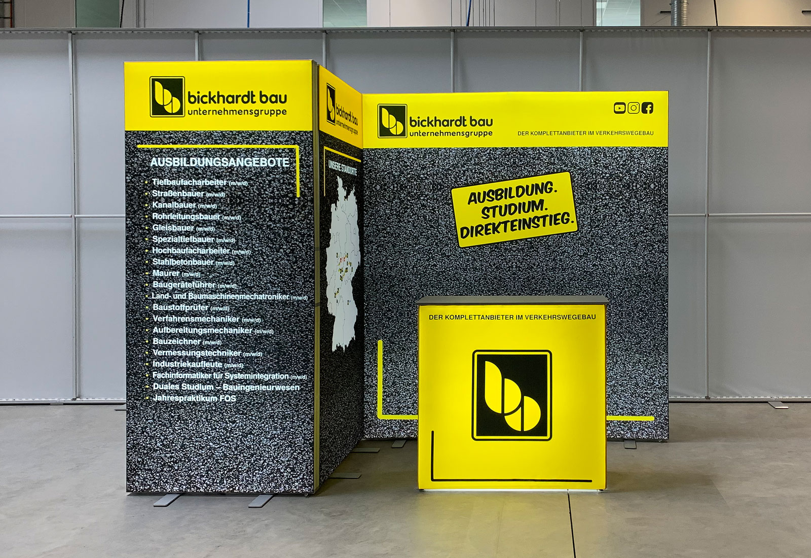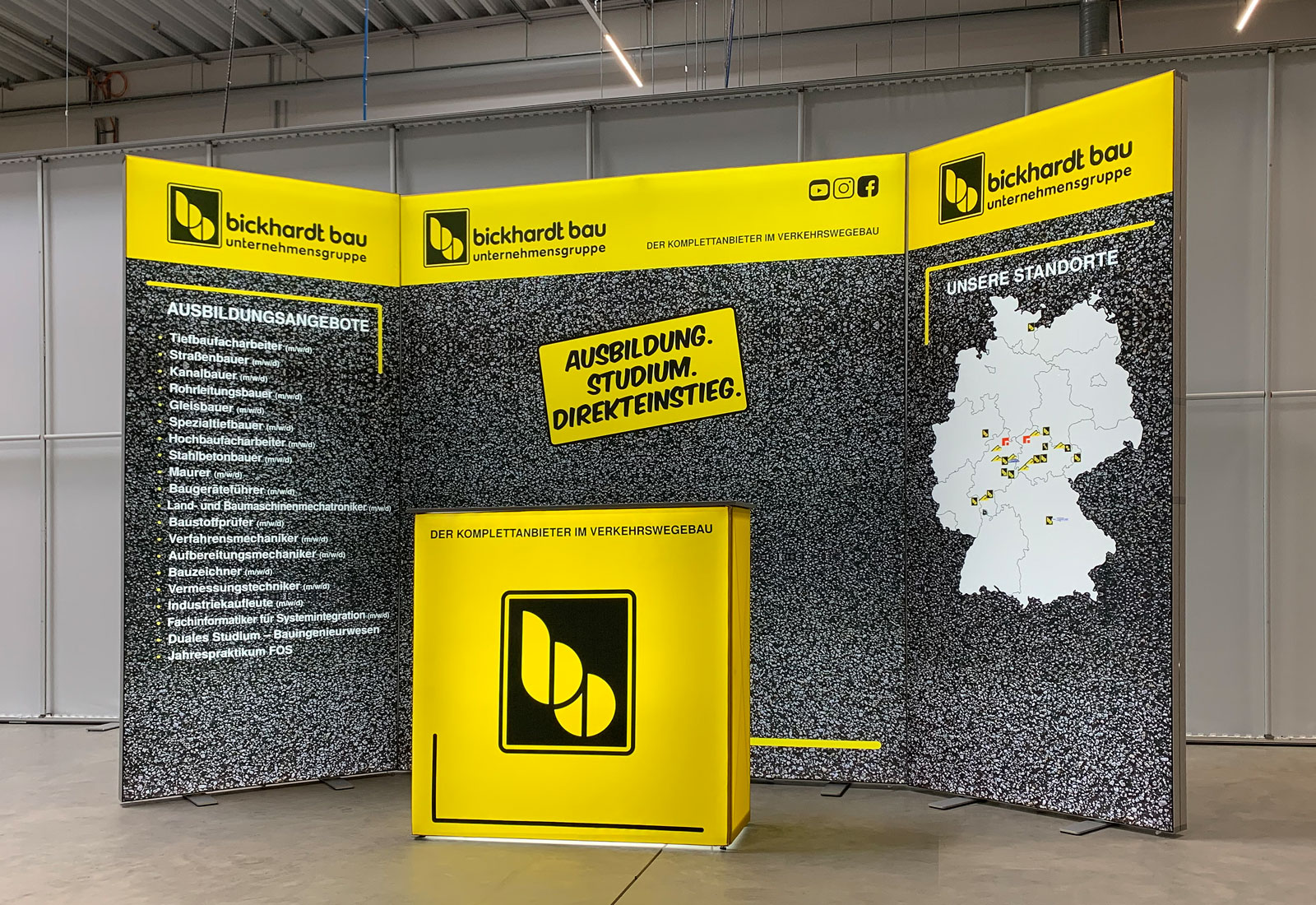 Wie Sie bei unserem Kunden Bickhardt Bau AG bewundern können, ist die geniale Kombinationsvielfalt des Systems ALU LightUp die ausgesprochen perfekte und kostenkünstige Messelösung. Im Handumdrehen können Sie die verschieden großen LED-Messewände je nach Lust und Laune anders stellen und wir garantieren Ihnen, dass Sie immer groß rauskommen. Das Grundsystem besteht aus Aluminium und die Profile sind 8 cm breit. Sie können es mühelos und vor allem ohne Nutzung von Werkzeug aufbauen. Ihre individuelle Grafik, die auf textilem Diamaterial gedruckt wird, bringt Ihr Firmenauftreten richtig zum Strahlen!
