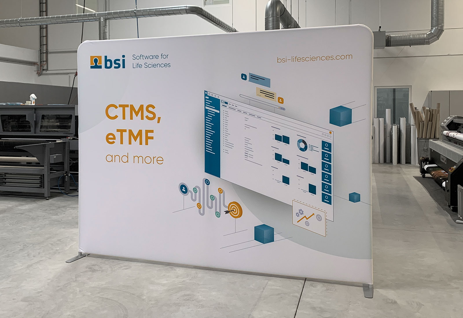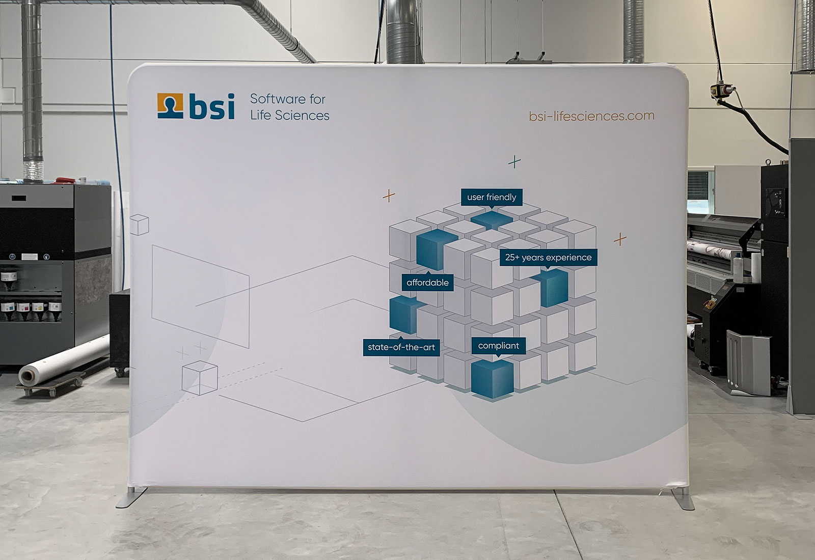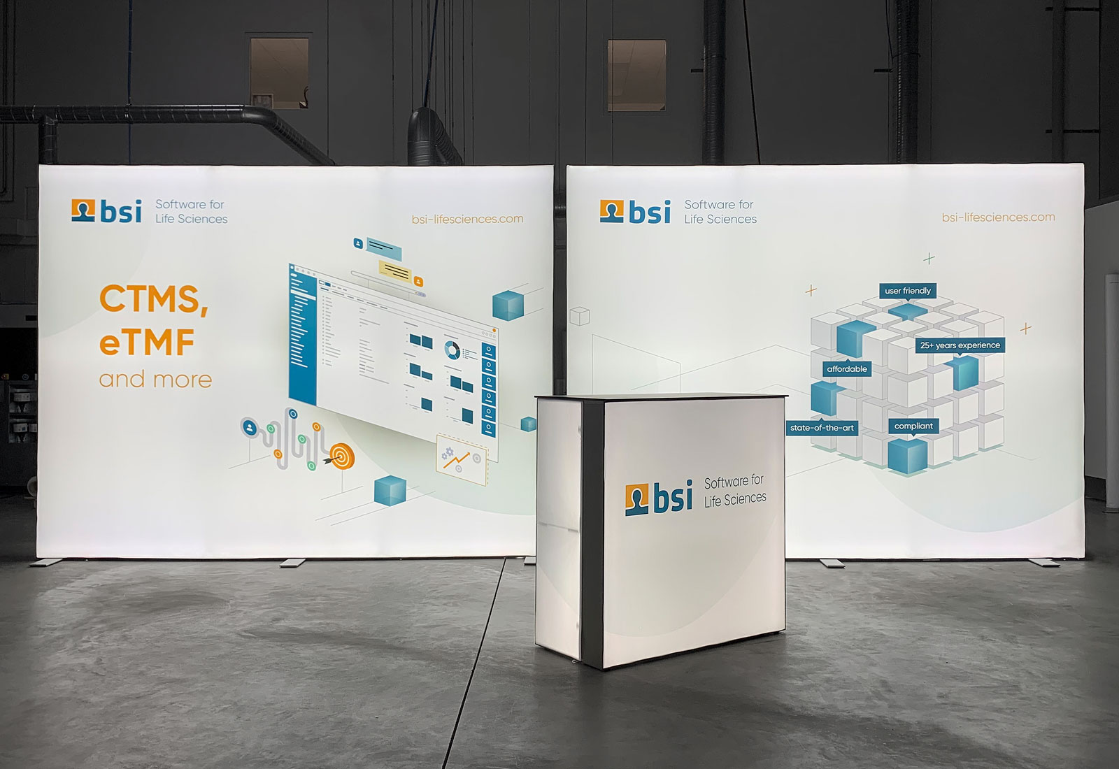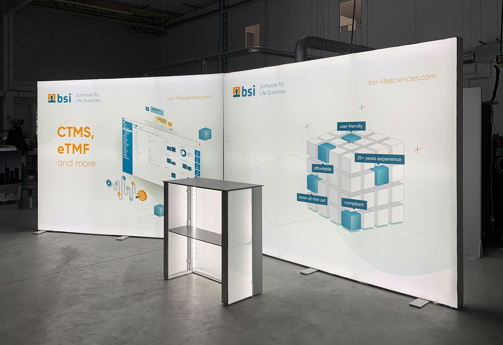 Beeindruckend ist der großartige Leuchteffekt der ALU STAR LED Messewände und ALU STAR PLUS Theke, die MARTINCOLOR für den Kunden „BSI Business Systems Integration AG“ produziert hat.