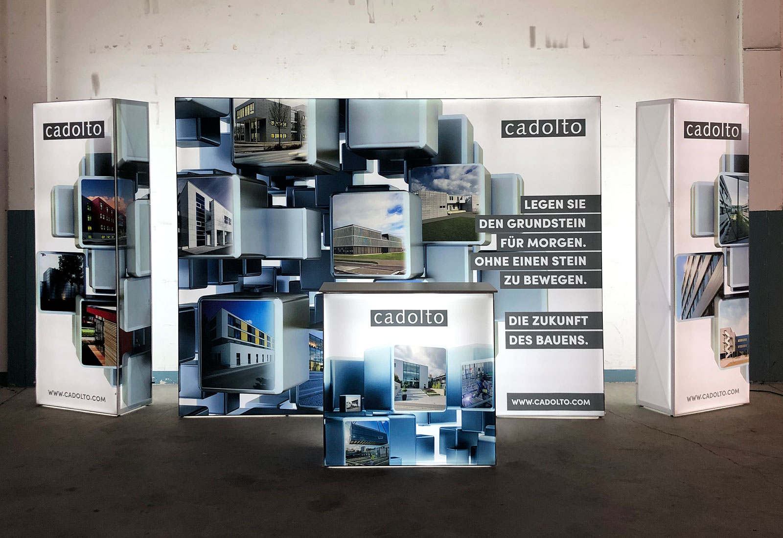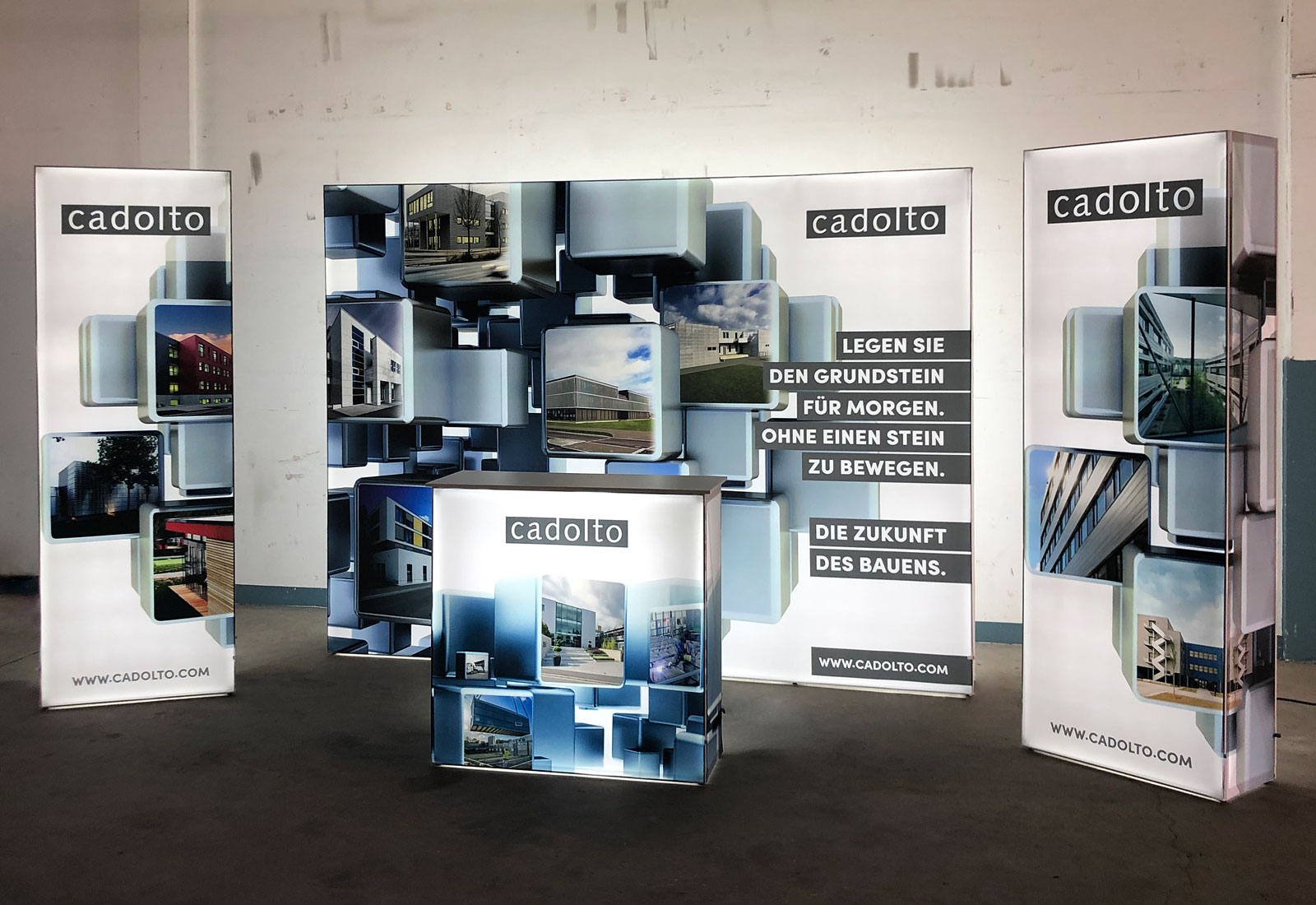 Immer wenn hochwertige, leuchtende Messestände benötigt werden, die schnell und einfach auf- und abgebaut werden sollen, sind GRID Lightbox-Lösungen die perfekte Wahl. Die GRID Lightbox gibt es in fünf verschiedenen Größen. Alle Wände können mit speziellen Konnektoren, über Eck oder gerade verbunden werden. Da bei dem System auch die Seitenteile beleuchtet sind, ist die Wirkung des leuchtenden Messestandes besonders dynamisch. Die Grundstruktur von GRID besteht aus einem Scherengitter-Gerüst, dass innerhalb von Sekunden aufgepoppt werden kann. In das Systemgerüst werden Power-LED Gardinen eingehängt. Der hier gezeigte leuchtende Messestand für die Firma Cadolto ist in einem normalen PKW transportierbar. Einen Aufbau-Video der GRID Lightbox finden Sie hier.