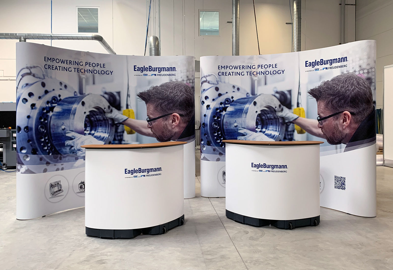 Das Faltdisplay EXPAND 2000 ist das passende System für ein Unternehmen wie Freudenberg SE. An das faltbare Scherengittersystem werden die individuellen Grafikpanels mit Hilfe von Magnetstreifen ganz einfach angebracht. Die leicht gebogene Form verleiht dem Firmenauftritt eine Schlichtheit und Eleganz zugleich. Natürlich sind die Faltwände in unterschiedlichen Größen und Formen erhältlich und können z. B. mit einem geraden System kombiniert werden.