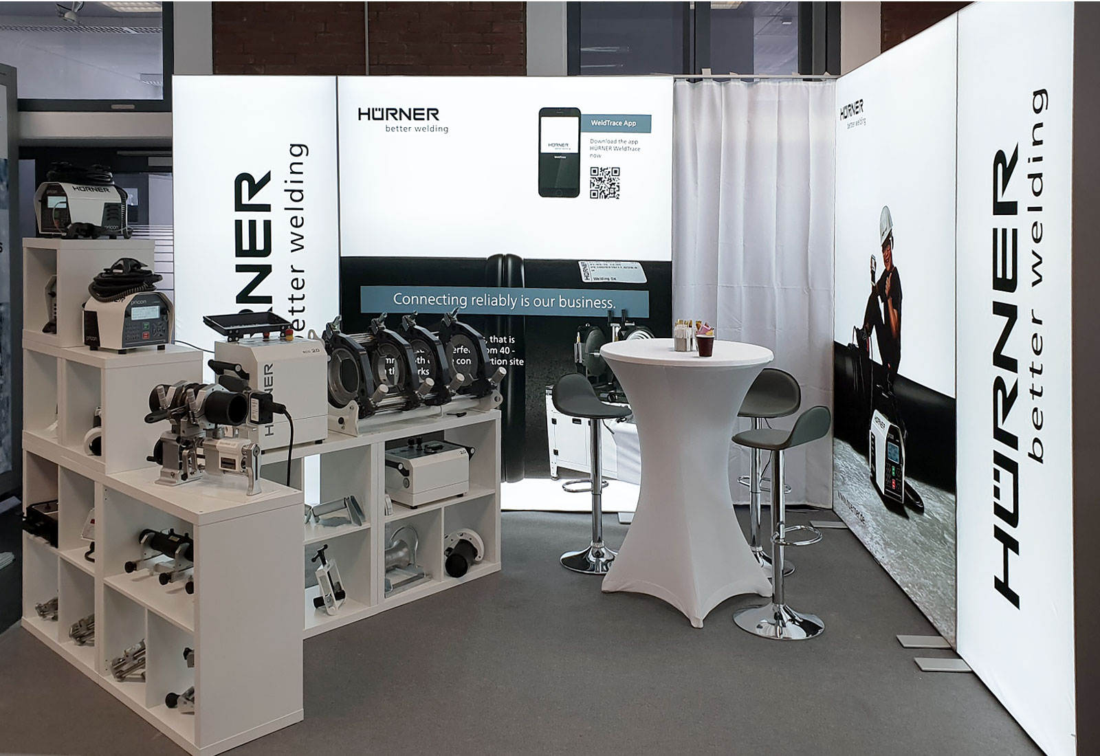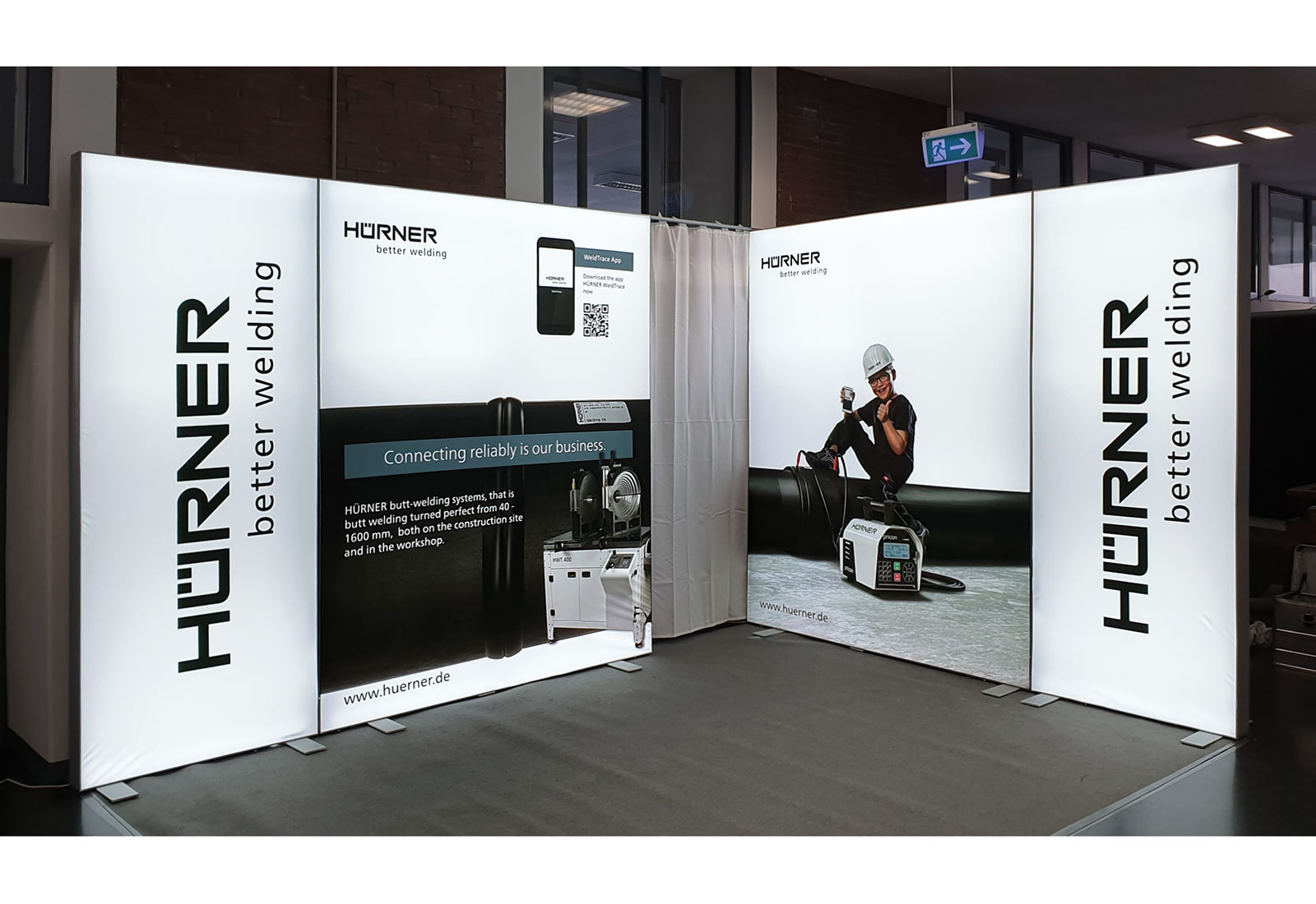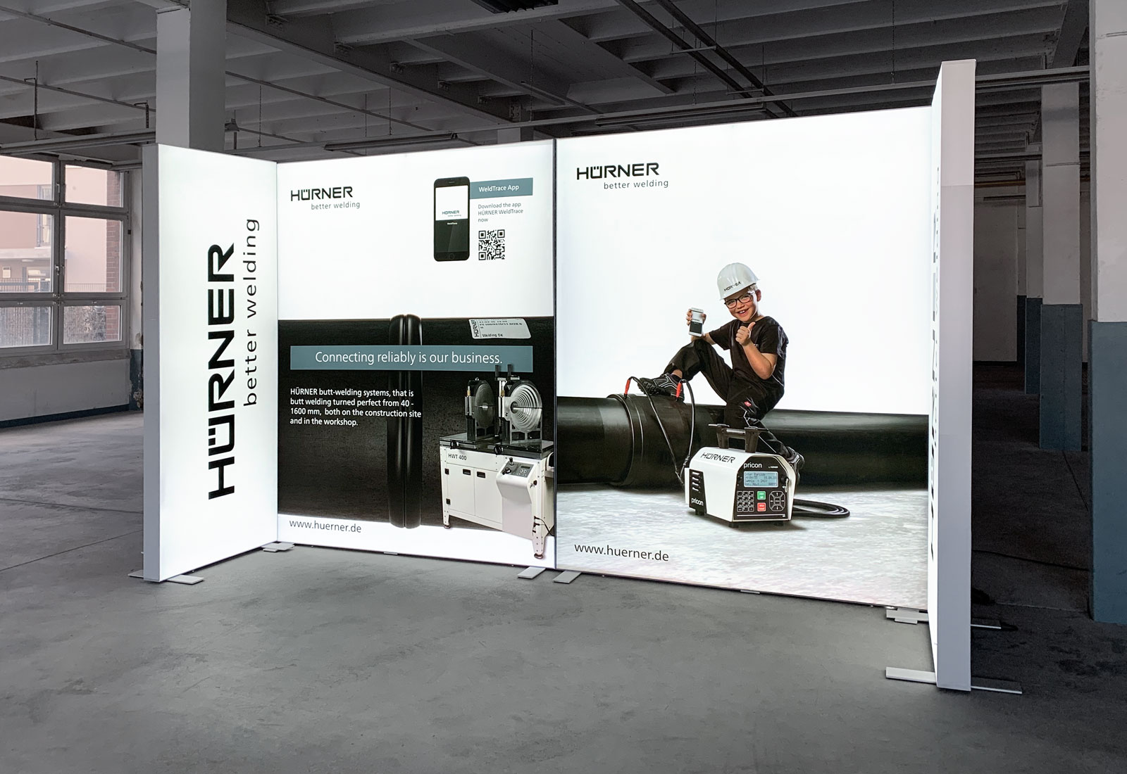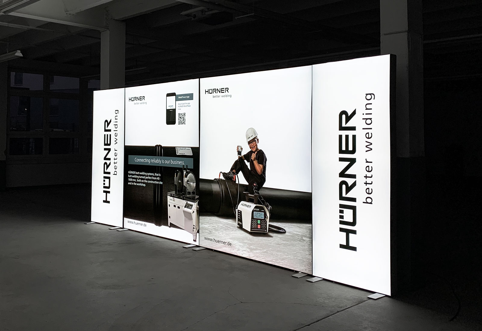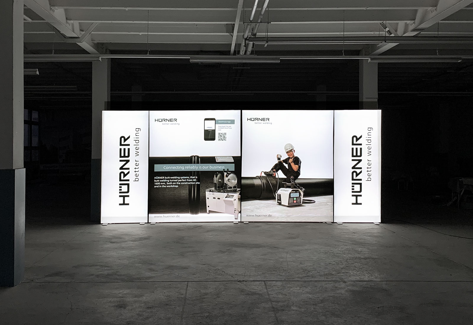 Hier sehen Sie den für die Hürner Schweisstechnik GmbH gefertigten, mehrteiligen LED-Messestand ALU STAR. ALU STAR ist der hochwertigste LED-Messestand aus unserem Programm und damit 100% passend für Kunden mit besonders hohen Anforderungen. Die LED-Messewand ALU STAR ist in vielen verschiedenen Großen lieferbar - bis zu einem maximalen Format von B: 500 cm und H: 300 cm! Durch die patentierte Stecktechnik, lassen sich solche großen Wände aber auch in ein kleineres Format umbauen. In den 12 cm breiten, aus hochwertigem Aluminium gefertigten Steckprofilen, sind die LED-Module und Trafos bereits fest eingebaut. Dies erleichtert die Systemmontage auf der Messe enorm. Viele unserer Kunden, so auch Hürner Schweisstechnik, entscheiden sich bei der Bildbespannung für unser faltbares Diamaterial, das besonders einfach im Handlich ist. Mehr Informationen zu ALU STAR finden Sie hier.