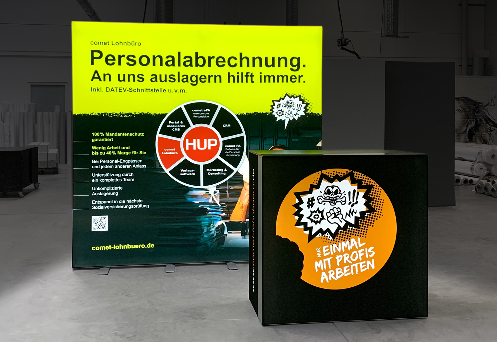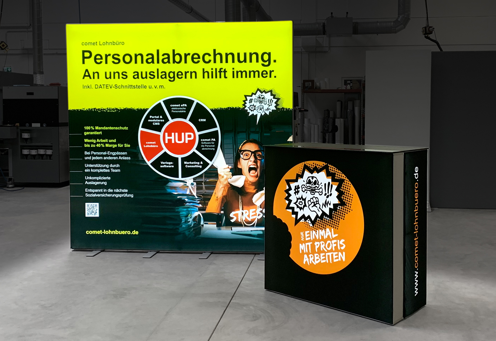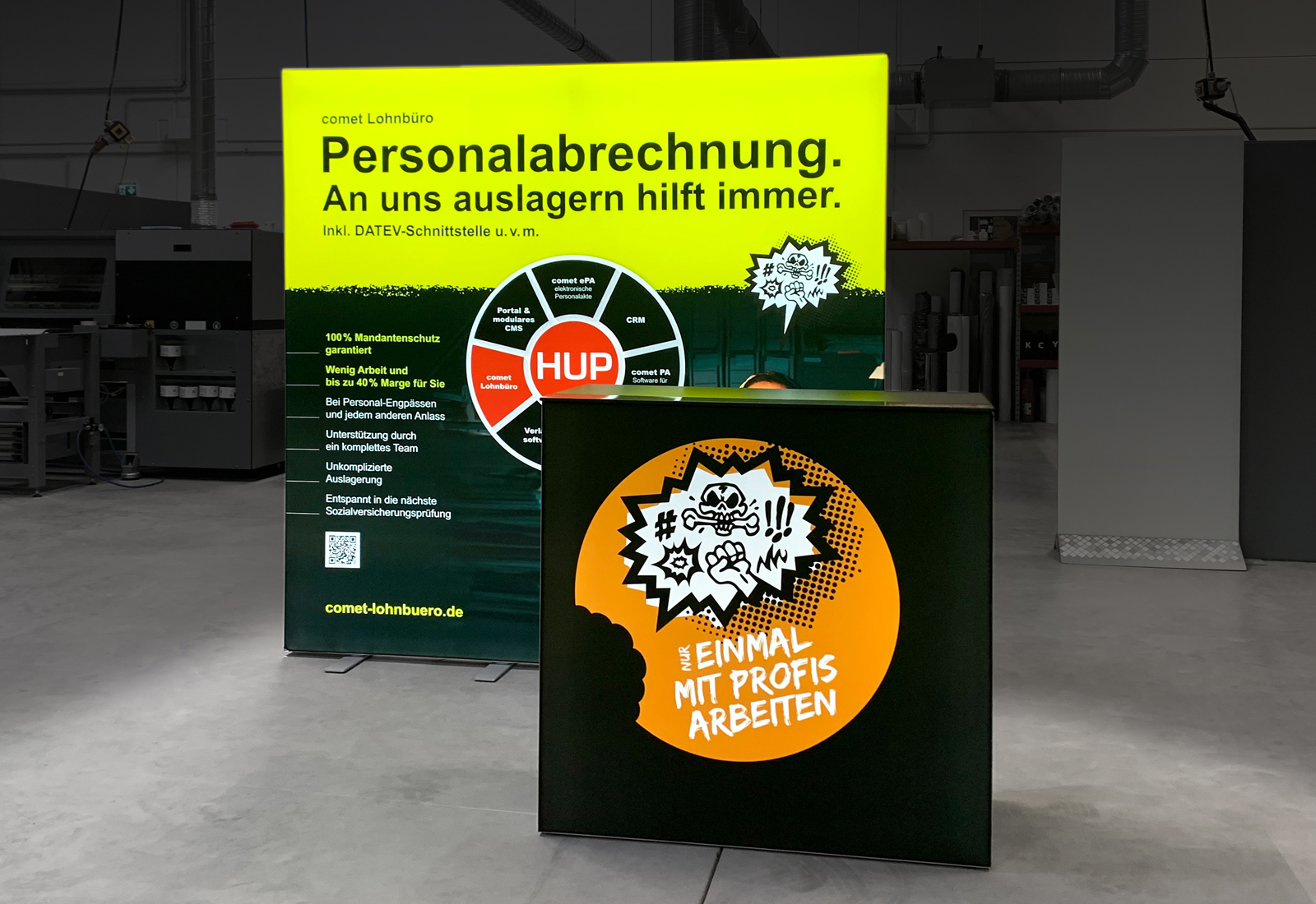 Das ALU LightUp ist nicht nur das erste mobile und kostengünstige LED-Display aus Aluminium sondern auch das Leuchtsystem mit absolut überzeugender Leuchtwirkung. Mit den vormontierten LED-Powermodulen, die sich in den Profilen befinden, ist ein großartiger Auftritt garantiert. Einfach und schnell montiert, ohne Werkzeug und sonstiger Hilfsgegenstände, steht Ihre Werbebotschaft im Mittelpunkt des Geschehens. Alles kann noch mit einer LED-Leuchttheke aufgepeppt werden. In diesem Fall entschied sich unser Kunde für die ALU STAR PLUS Theke, die ebenfalls für ein spektakuläres Lichterlebnis sorgt und außerdem sehr praktisch ist mit der Option eines abschließbaren Türen-Sets. Sie können auch die LED-Theke mit einem Akku bestellen. Dadurch brauchen Sie sich nie wieder um eine Stromversorgung zu kümmern.