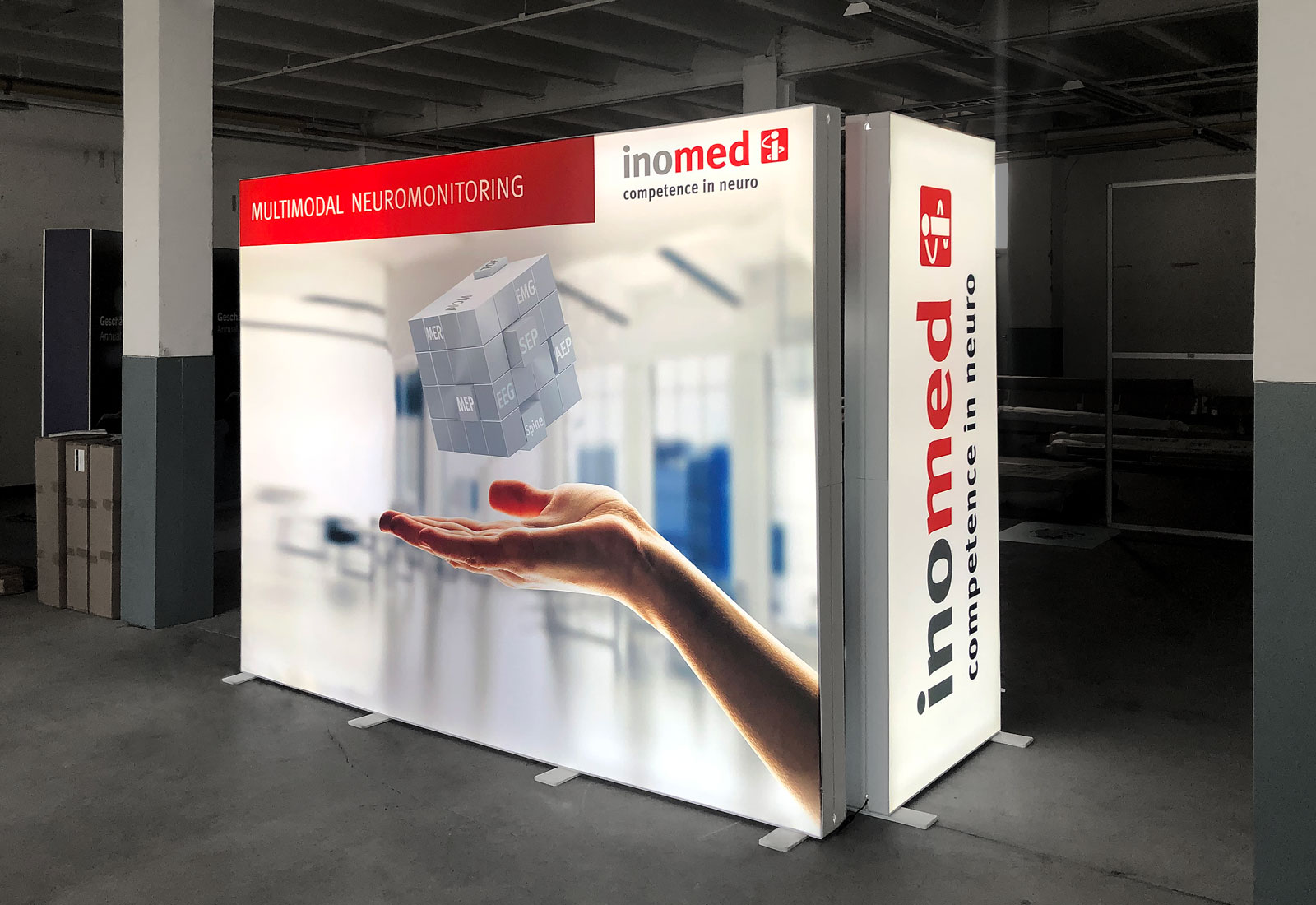LED-Leuchtwände von PIXLIP sind ein Eycatcher auf jeder Messe. Die im PKW transportierbaren Leuchtdisplays sind superschnell aufgebaut und können doppelseitig mit einer individuellen Diabespannung bespielt werden. Durch spezielle Adapter können die einzelnen Wände gerade und "über Eck" miteinander verbunden werden. Für das Medizintechnik-Unternehmen Inomed war diese Möglichkeit besonders wichtig, da der leuchtende Messestand an unterschiedliche Standflächen angepasst werden soll. PIXLIP GO Leuchtwände sind in vier verschiedenen Systembreiten lieferbar: 85 cm, 100 cm, 200 cm und 300 cm. Mehr Informationen und Preise erhalten Sie von unserem Spezialisten unter +49 (0) 69 756080-0.