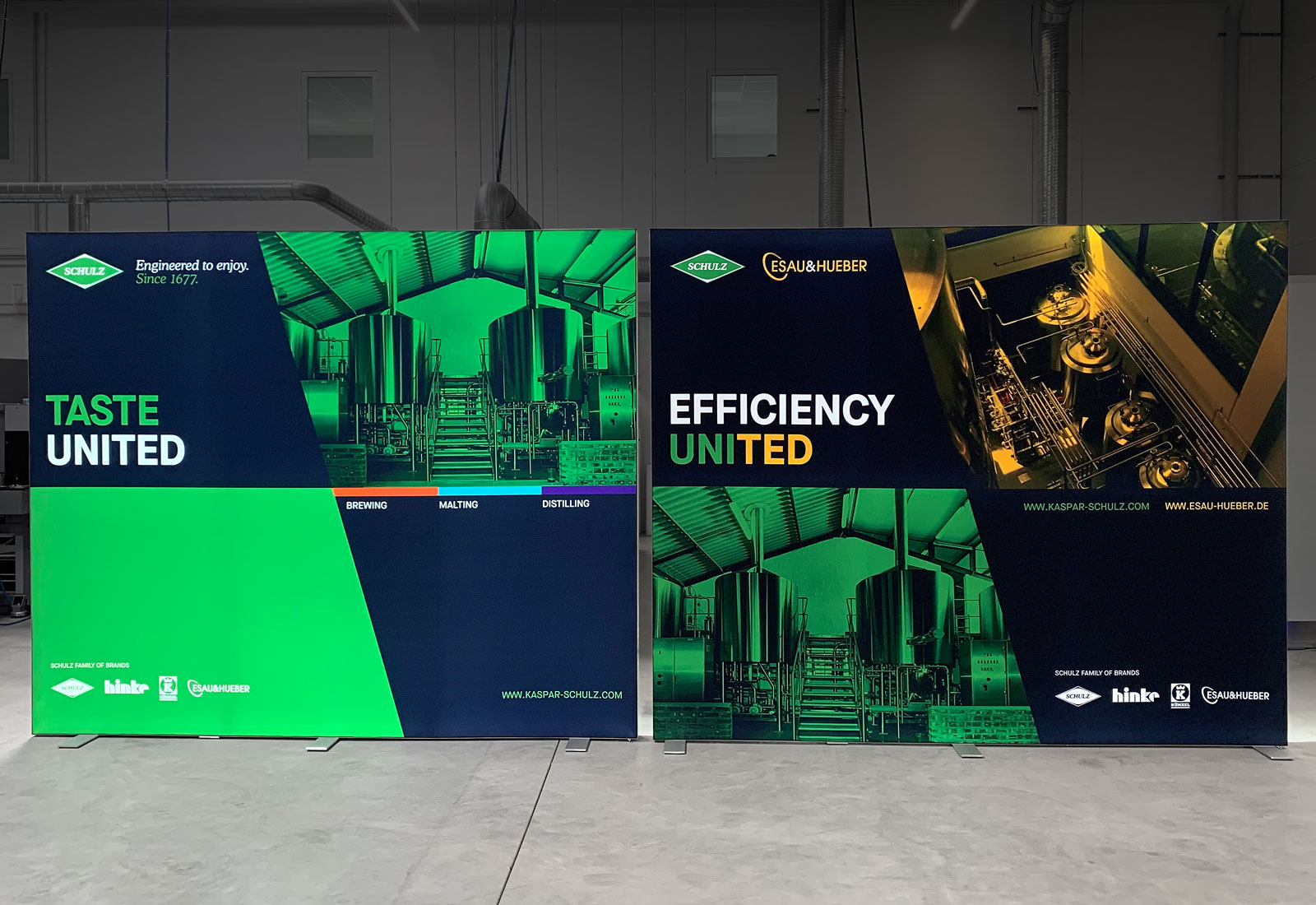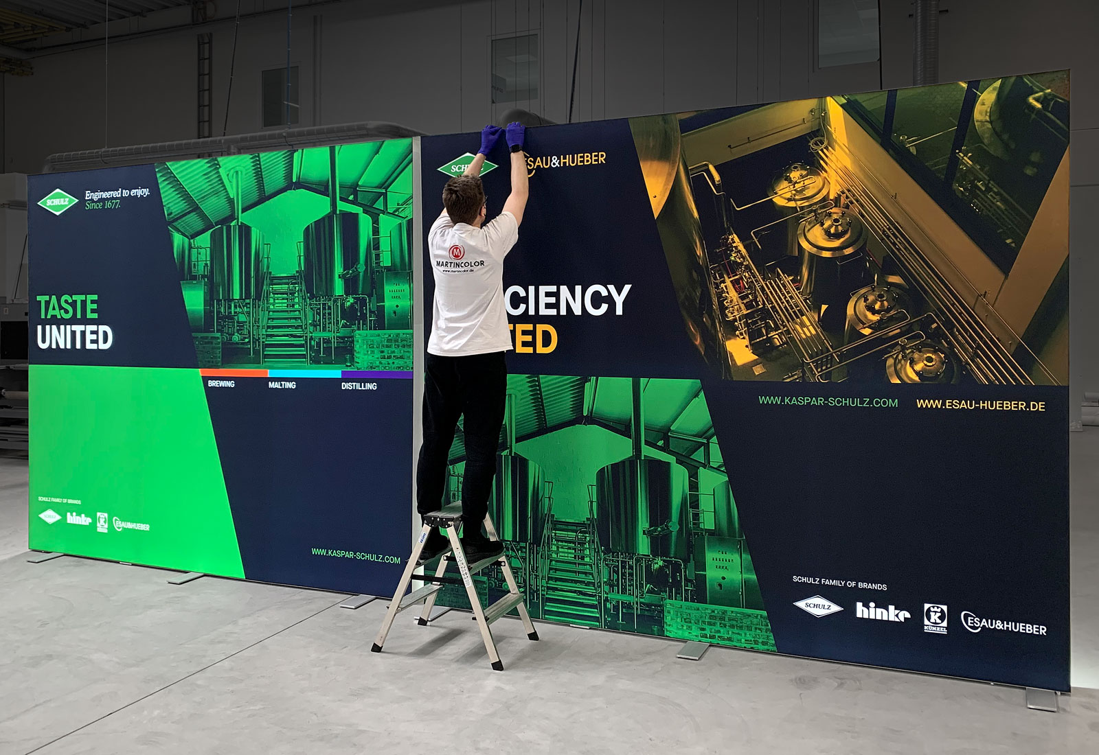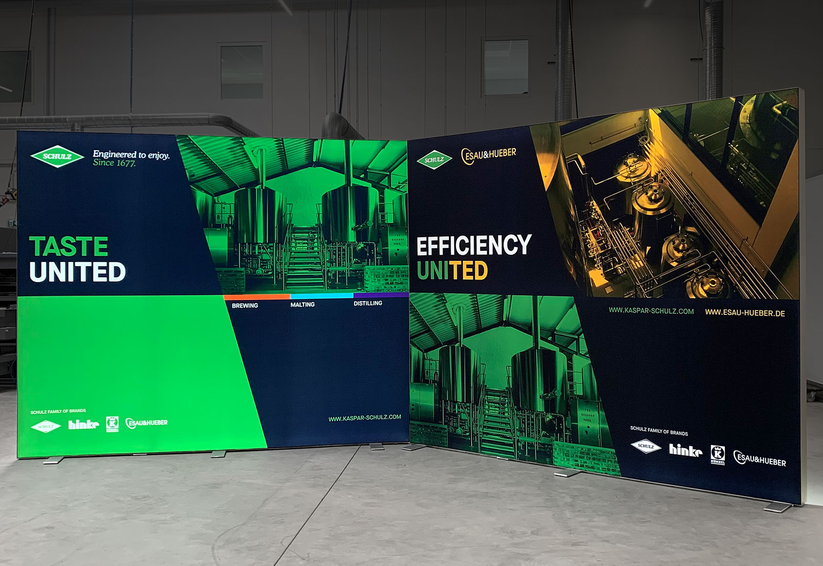 Eine sensationelle Leuchtkulisse! Das ALU-STAR-Leuchtsystem erfüllte die erwünschten Kriterien unseres Kunden „KASPAR SCHULZ“. Mit den bereits vormontierten, absolut kraftvoll leuchtenden LEDs, die sich in den Systemprofilen aus hochwertigem Aluminium befinden, kommt die individuelle Textilbespannung so richtig zur Geltung! Diese können Sie, wenn Sie sie erneuen wollen, fix austauschen. Die modulare Konstruktion lässt sich in vielen unterschiedlichen Formaten einsetzen. Auch die Stellweise ist variabel und je nach Bedarf haben Sie die Möglichkeit, den vorhandenen Platz ideal zu gestalten: nebeneinander, versetzt oder über Eck. Die Leucht-Systeme können ohne Probleme von nur einer Person auf- und abgebaut sowie in einem PKW transportiert werden. Benötigen Sie dennoch Hilfe, steht Ihnen unser professionelles Montageteam jederzeit zur Verfügung.