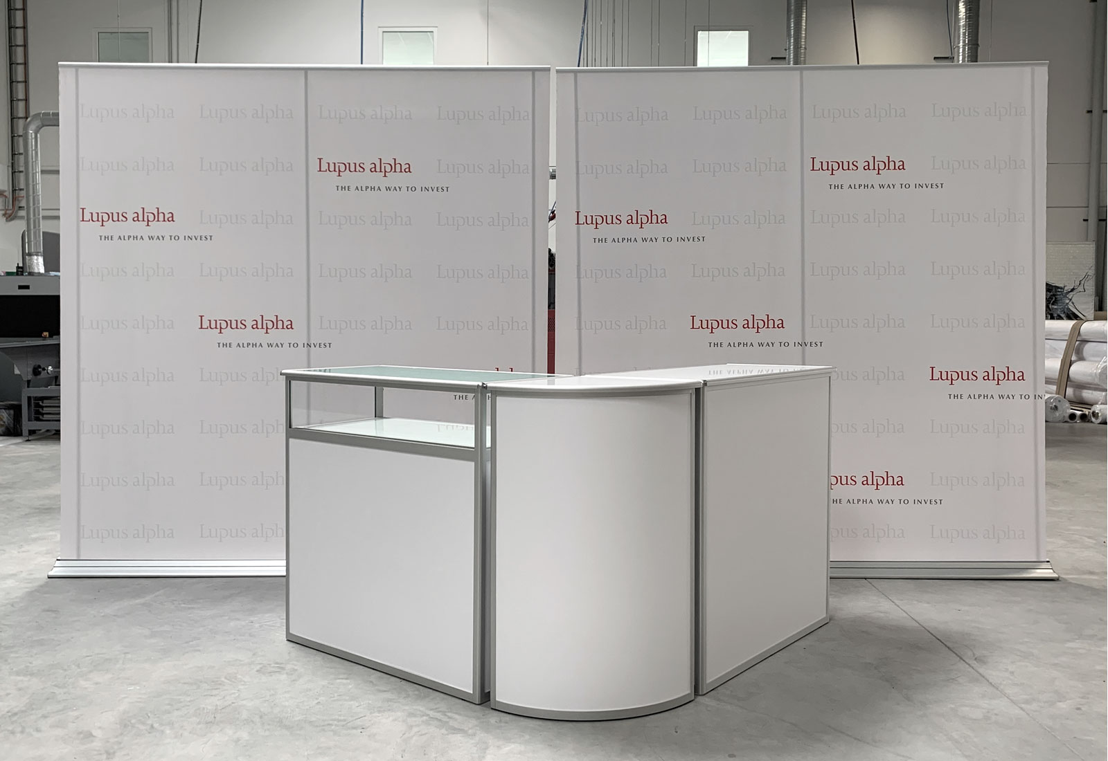 Das professionelle Auftreten der Firma Lupus Alpha wurde zum absoluten Hingucker auf dem gesamten Messegelände. Das neue und qualitativ hochwertige RollUp-System für Großformatdrucke gab dem Unternehmen das richtige „Format“. Das 317-cm-breite und 250-cm-hohe System ist durch eine einfache Pull-Up-Funktionsweise schnell und einfach aufzubauen. Die 3 Stangen, die auf der Rückseite angebracht sind, geben dem System die nötige Stabilität. Natürlich kann man den individuellen Grafikdruck austauschen. So kann das System über mehrere Jahre eingesetzt werden. Je nach Bedarf können die Stangen auf der Rückseite mit Halogenspots ergänzt werden. Somit kann die Grafikbespannung zusätzlich beleuchtet werden.