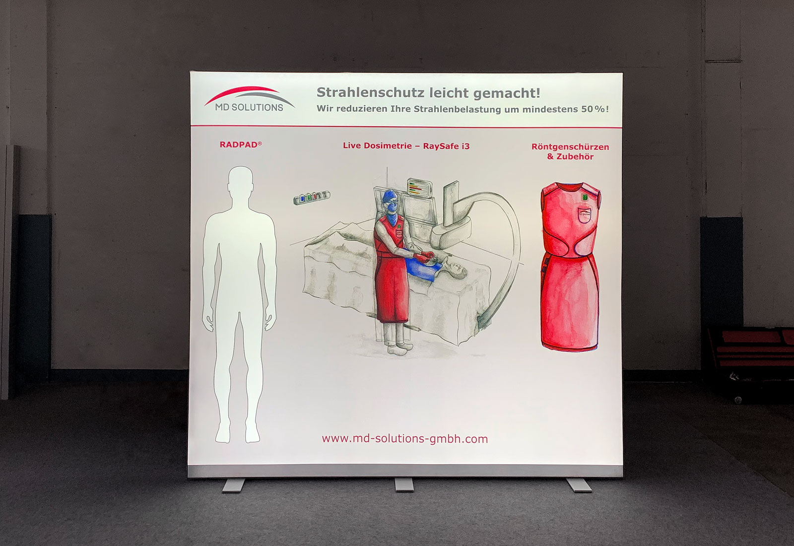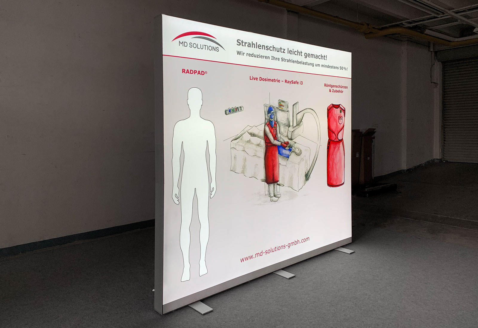Für das Medizintechnik-Unternehmen MD Solutions GmbH fertigten wir eine großformatige Leuchtwand für den Einsatz auf Messen und Veranstaltungen an. MD Solutions MARTINCOLOR ist der Spezialist für Montage, Aufbau von Messe-Equipment und Befestigung von Werbung und Beschilderung in Ihrem Büro, auf Ihrem Messestand, auf Ihrem Event oder Veranstaltungen. Selbstverständlich übernehmen wir im Vorfeld auch die gesamte Gestaltung, Produktion und Fertigung der Messestände, Großbildflächen und Werbedisplays. Unser hochqualifiziertes Montageteam besteht aus Werbetechnikern, Malermeistern, Elektrikern und Schreinern. Je nach Anforderung werden diese für einen Montageeinsatz vor Ort zusammen gestellt. Wir montieren für Sie deutschlandweit: Acrylbilder, Textil-Spannrahmen, Tapeten, Büroleitsysteme, Fensterbeklebungen, Beschriftungen, Bau- & Werbeschilder, Fassadenbanner, Leuchtkästen uvm. Egal, ob in Ihrem Büro, bei Ihrem Kunden, auf dem Messestand oder Event (In- und Outdoor). Mehr Informationen und Preise erhalten Sie von unserem Spezialisten unter +49 (0) 69 756080-27.