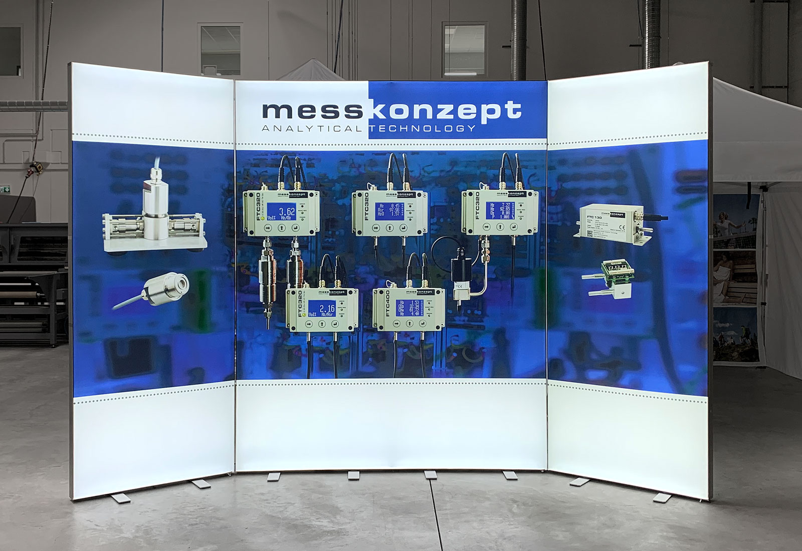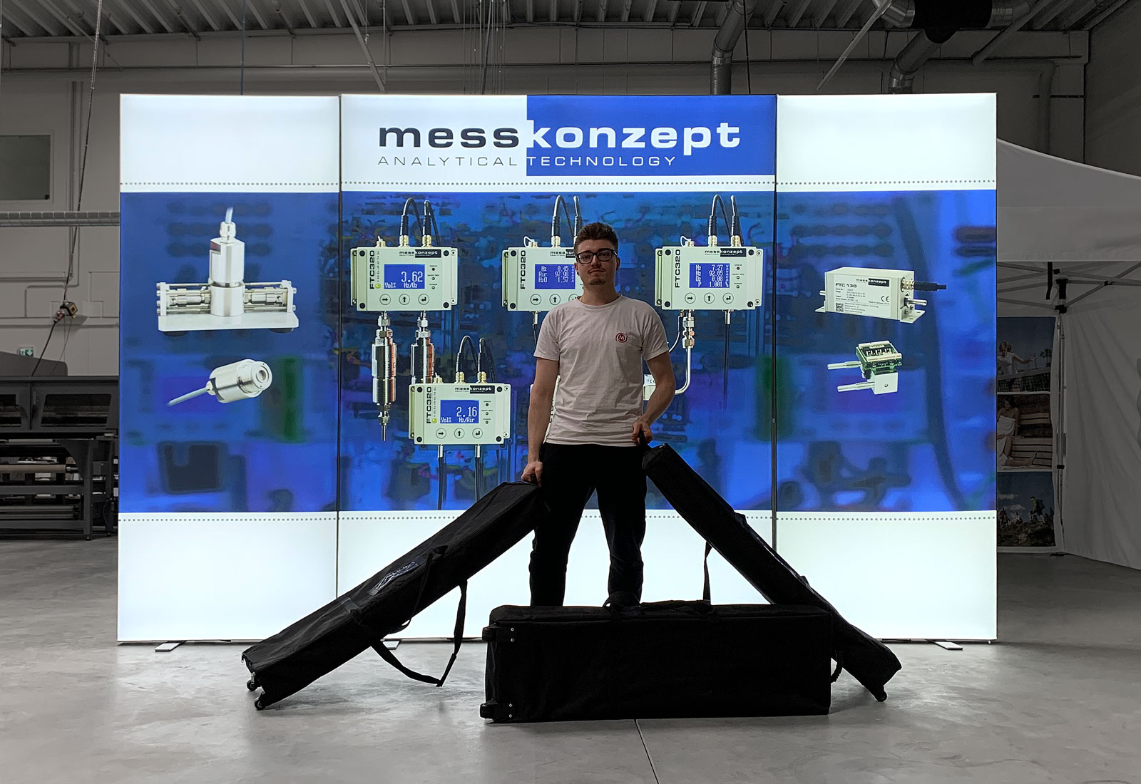 ALU LightUp ist mit Abstand der LED-Messestand mit dem besten Preis-Leistungs-Verhältnis. Darum hat sich auch unser Kunde Messkonzept GmbH dafür entschieden. Durch die Kombination mehrerer und unterschiedlich breiter LED-Rahmen entsteht ein gigantischer Lichteffekt, auch ums Eck! Die 8-cm-tiefen Aluminiumprofile sind mit leuchtstarken LEDs ausgestattet. Die textile Bespannung mit Ihrem individuellen Grafikdruck lässt sich ganz unkompliziert in den Leuchtrahmen stecken. Man kann dieses System schnell und ohne technische Hilfsmittel aufbauen. Somit bringen Sie Ihre Werbung richtig zum Leuchten! Das gesamte System lässt sich wunderbar in einer praktischen Transporttasche verpacken, die in jeden Kofferraum passt.