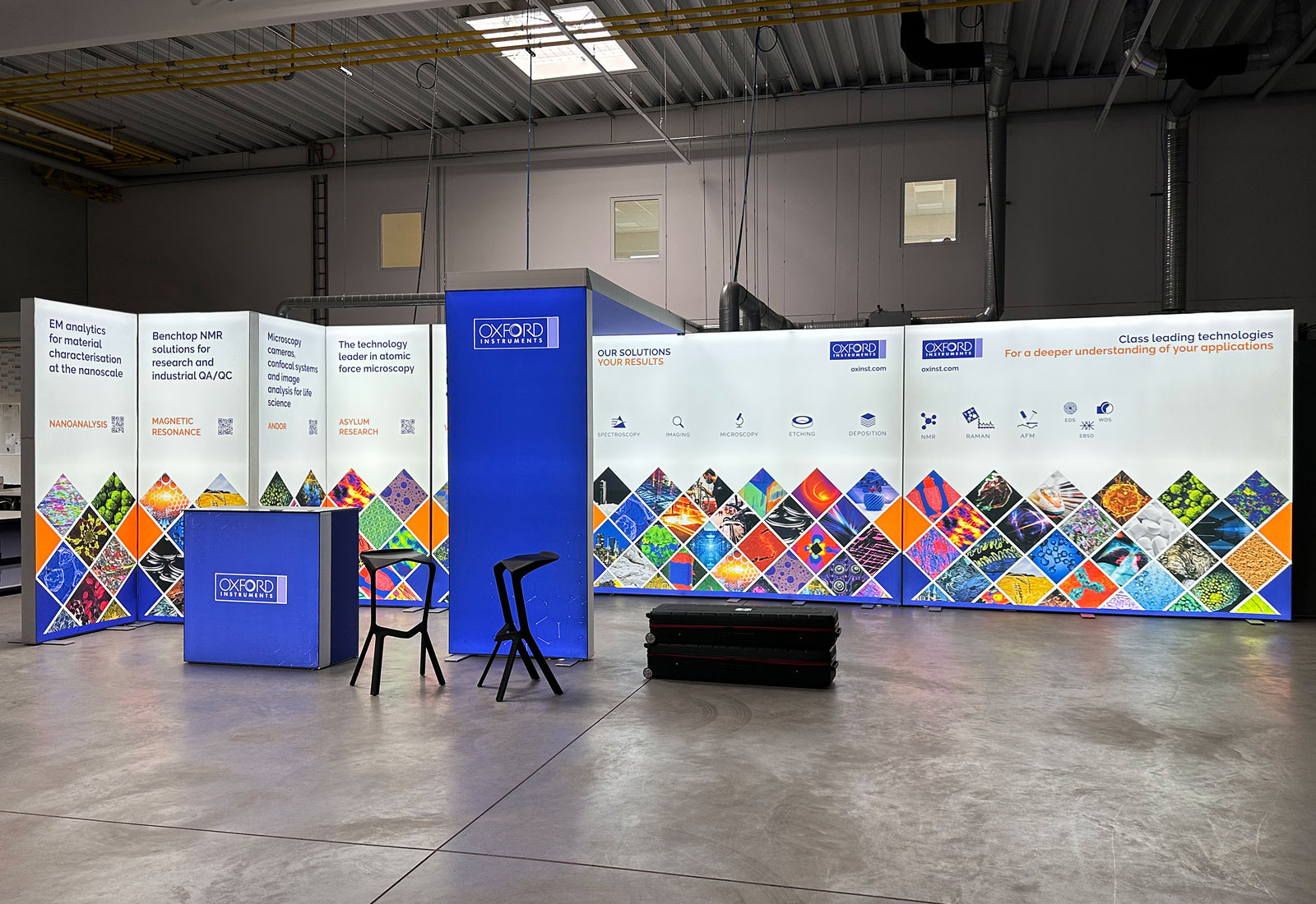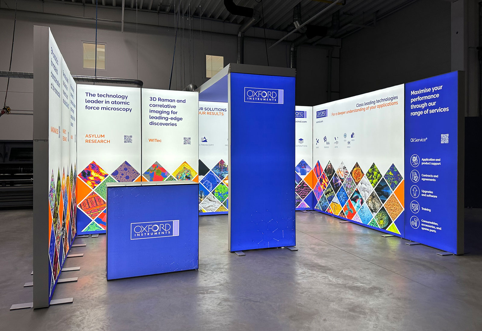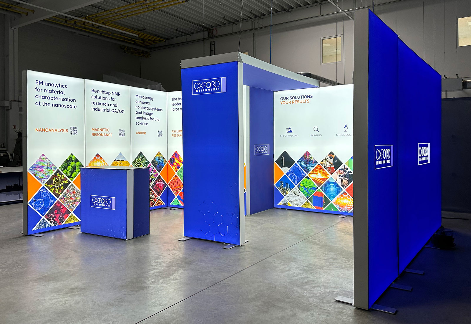 Für den Kunden „Oxford Instruments“ produzierte Martincolor den kompletten LED-Messestand ALU STAR mit der LED-Theke ALU STAR PLUS. Durch die bereits in den 12 cm breiten Aluminiumprofilen integrierten Power-LEDs ist das grandiose Lichtspektakel garantiert. Der absolute Hingucker ist das Brückenmodul. Besonders praktisch ist der mit einer Tür verschließbare Lagerraum.