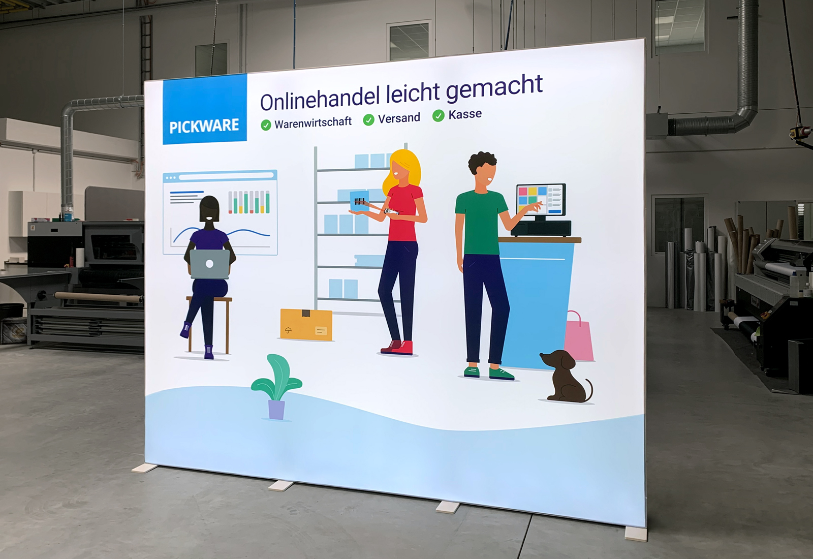 Die LED-Messewand für die PICKWARE GmbH ist besonders gut für ungeübte Aussteller geeignet, die sonst wenig mit Messesystemen zu tun haben. Bei dieser LED-Messewand handelt es sich um die "convenience" LED-Messewand PIXLIP GO. Dieses Leuchtsystem besteht aus weißen, 12 cm breiten Kunststoff-Profilen, die zum Aufbau einfach ineinander gesteckt werden. In den Profilen befinden sich bereichts die LED-Schienen.