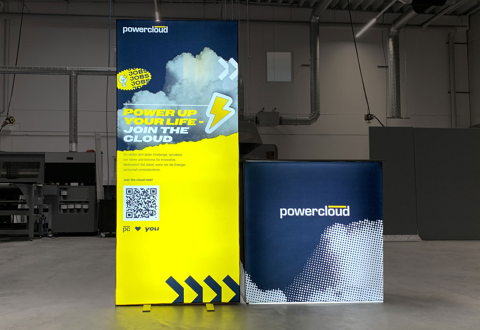 Die Kombination von dem Leuchtdisplay PIXLIP POP und der Leuchttheke GRID Lightbox verstärkte die Kernaussage des Unternehmens „Power Cloud“. Die Power-LEDs, die auf einer Gardine befestigt sind, bringen das von MARTINCOLOR produzierten Textildiamaterial wirklich zum Strahlen. Es ist und bleibt ein überzeugender Hingucker. Die 8 cm tiefen Aluminiumprofile werden mühelos zusammengesteckt und bilden einen stabilen Rahmen, in den die Grafik eingespannt werden kann. Zum Schluss werden die Standfüße herausgedreht und verleihen dem Ganzen die erforderliche Stabilität. Die LED-Leuchttheke besteht aus einem faltbaren Scherengittergerüst mit drei praktischen Ablageböden. Das komplette Set ist einfach aufzubauen und erfordert keinerlei handwerkliche Begabung. Zudem lässt sich alles bequem in einem praktischen Trolley, bzw. einer Tragetasche von A nach B befördern.