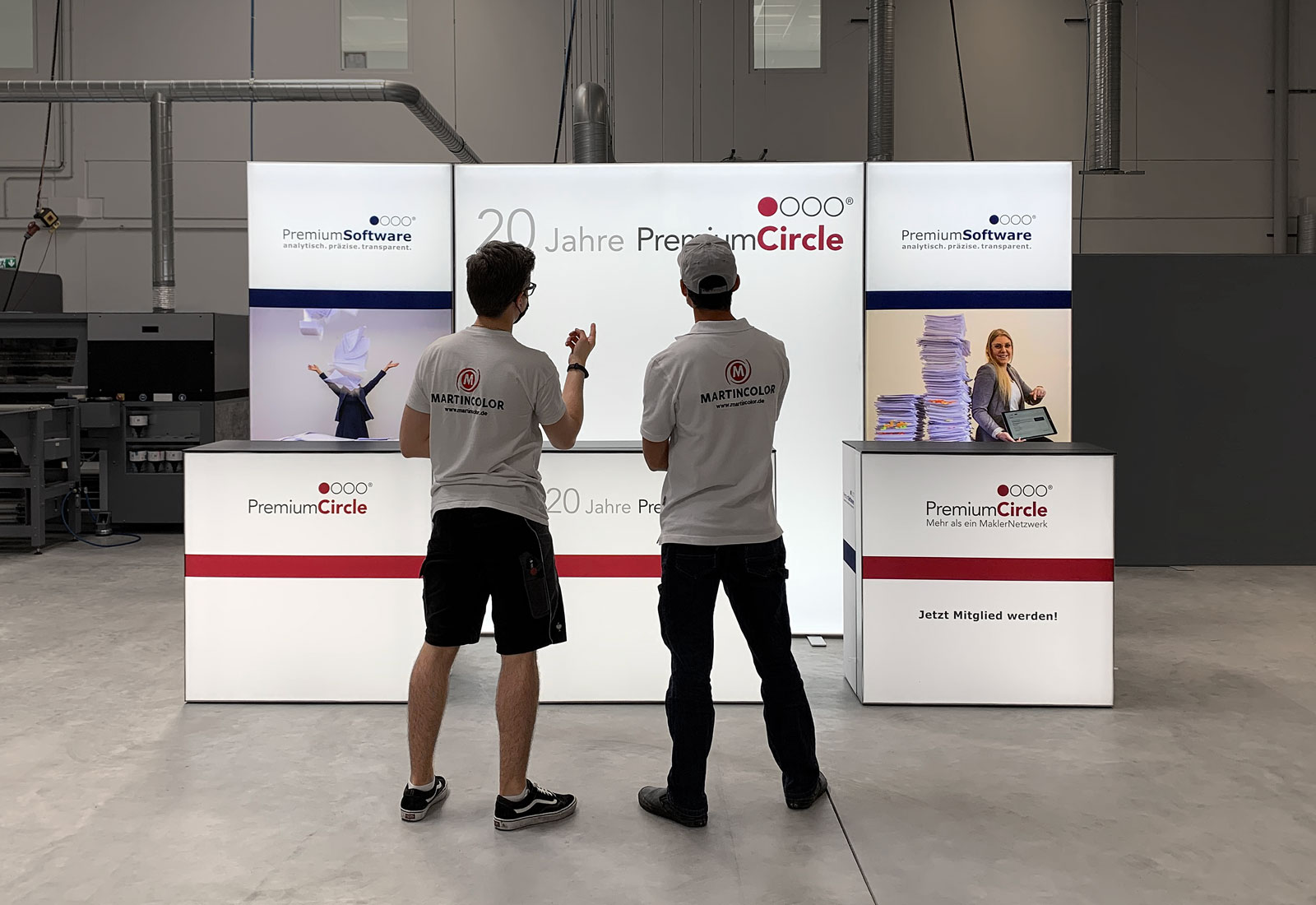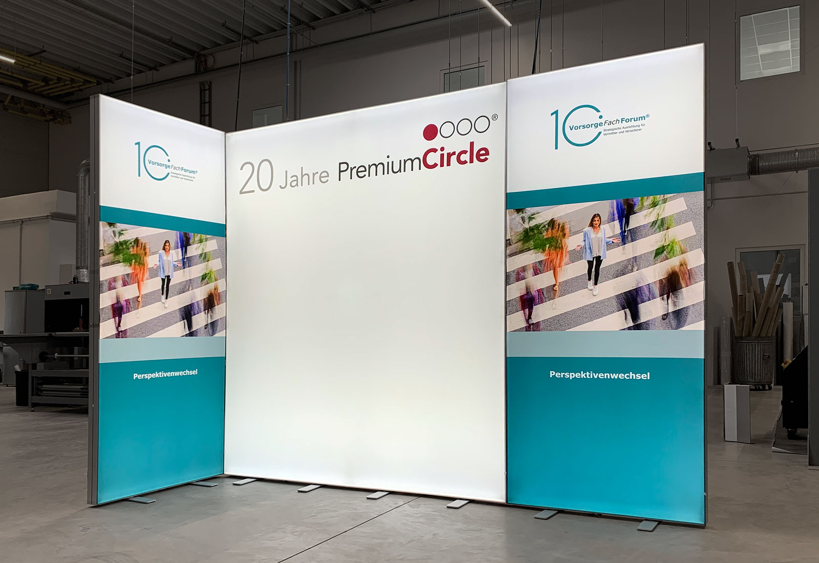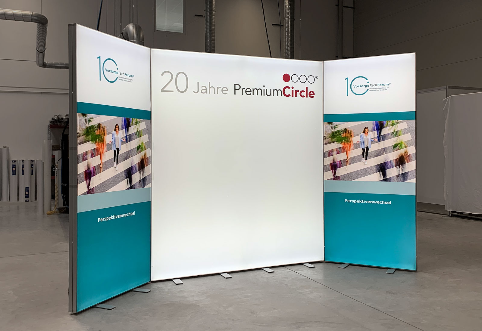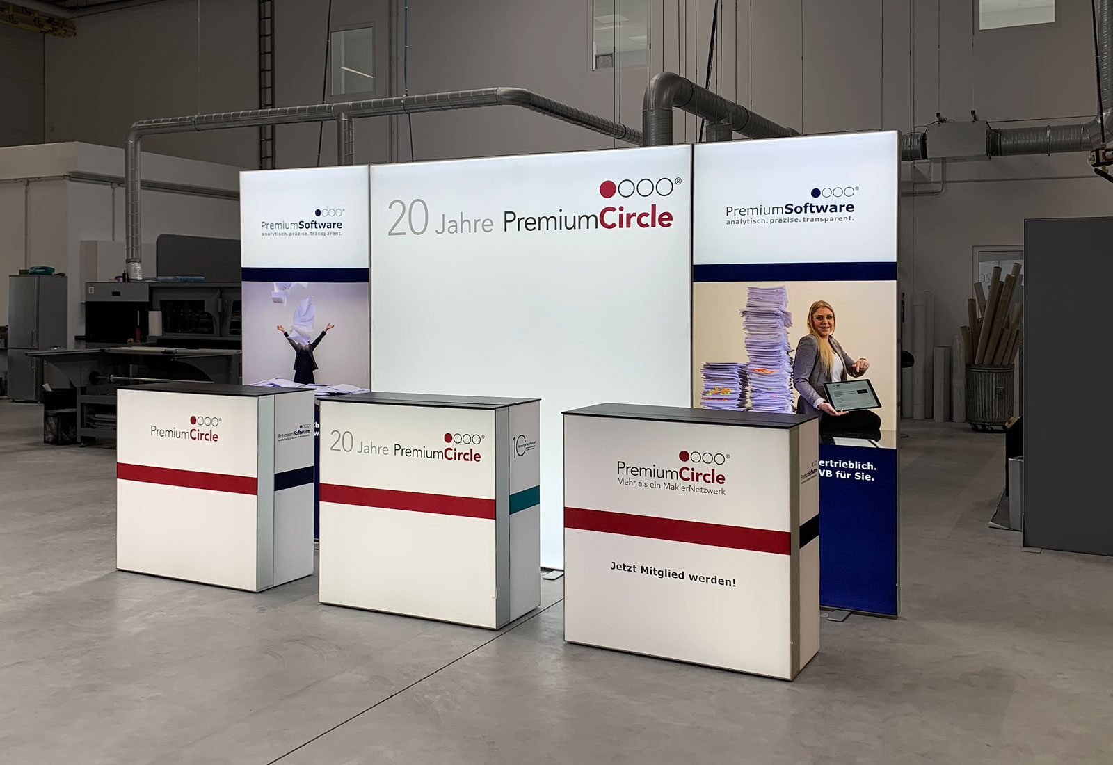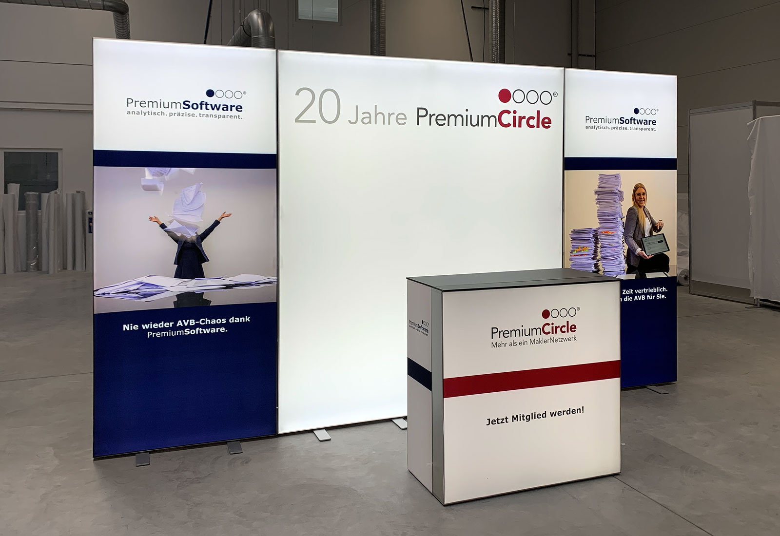 Bei dem LED-Messestand-Projekt von PremiumCircle Deutschland GmbH sieht man deutlich, wie harmonisch die Kombination von LED-Messewände und LED-Theken ist. Eingesetzt wurde die LED-Messewand ALU LightUp in den Systembreiten 200 cm und 100 cm. Die Bespannung mit faltbaren Textildias erfolgte doppelseitig. Bei den hier gezeigten LED-Theken handelt es sich um das Thekenmodel ALU STAR PLUS. Rückseitig verfügt die Leuchttheke über einen Ablageboden. Der Transport der LED-Messetheke erfolgt in einem Rollkoffer aus ABS Kunststoff. Die LED-Messewände ALU LightUp werden in einem Transporttrolly verstaut.