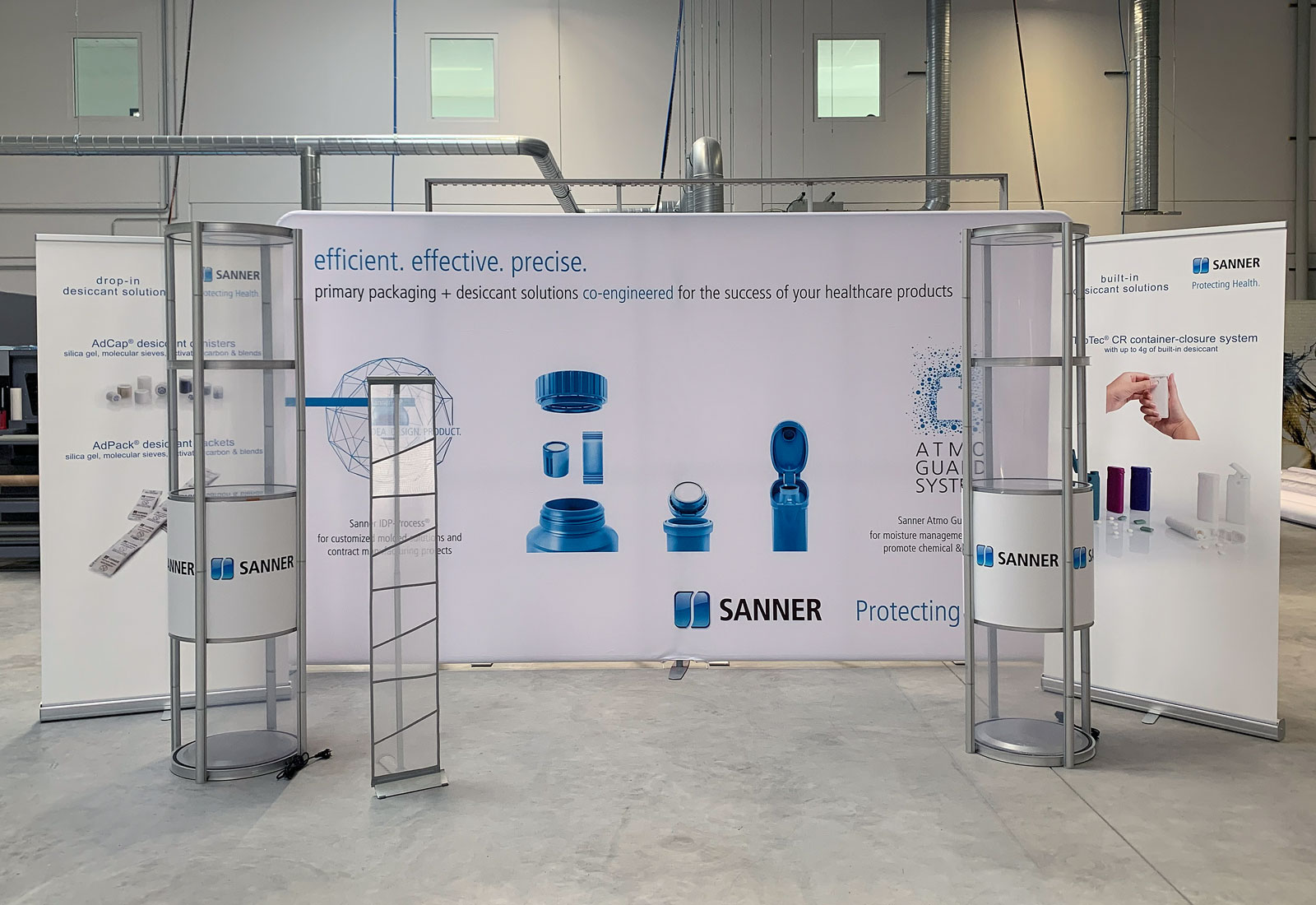 Die beiden Econ RollUps – Systeme, die ebenfalls aus Aluminium und in verschiedenen Größen erhältlich sind – verleihen Sanner GmbH eine perspektivische Erweiterung des Messestandes.