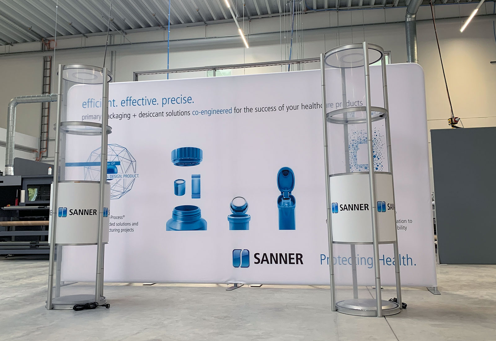 Die Sanner Gruppe, ein weltweit führender Anbieter hochwertiger, intelligenter Verpackungslösungen, war auf der Suche nach einer Messestandlösung, die absolut schnell und einfach aufzubauen ist. Einfach bedeutet aber nicht, dass die großartige Wirkung auf dem Messegelände auf der Strecke bleibt! Der Aufbau der Messewand ist für alle, auch für Personen, die keinerlei Erfahrung haben, kinderleicht durchzuführen. Die gekennzeichneten Click-Systemstangen aus Aluminium werden ineinander gesteckt und sorgen für Stabilität des Rahmens. Der individuelle Grafikdruck aus einem strapazierfähigen Stretchstoff wird ganz einfach über das Gerüst gestülpt und mit einem Reißverschluss zugezogen. Natürlich sind diese Rückwände in verschiedenen Formen und Größen erhältlich.