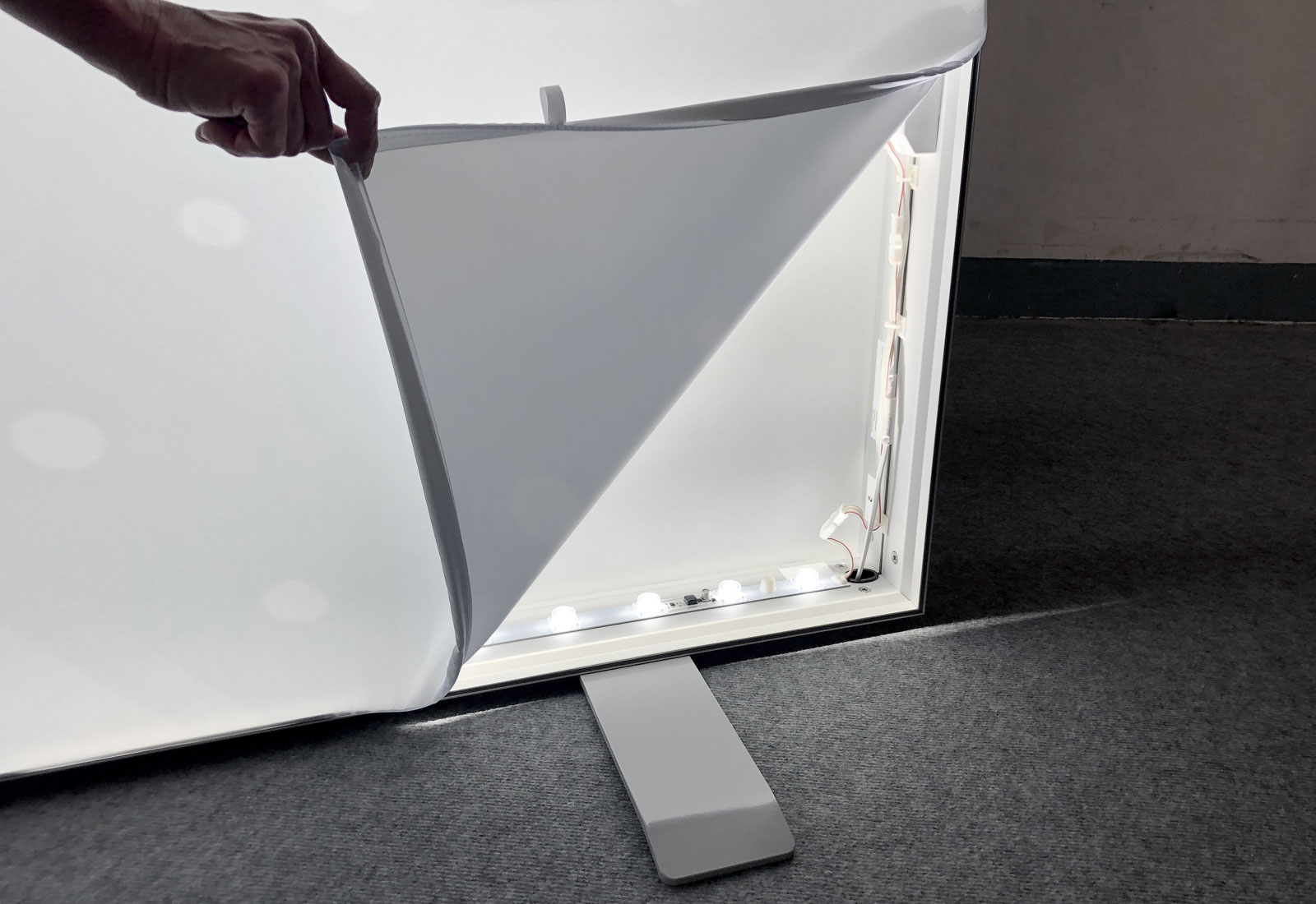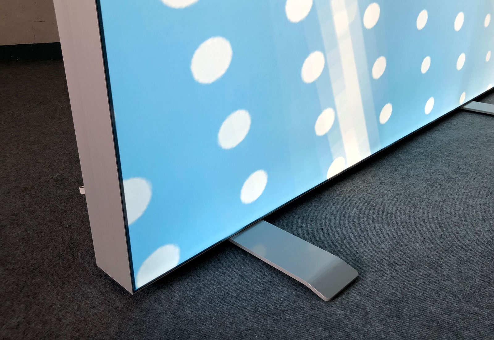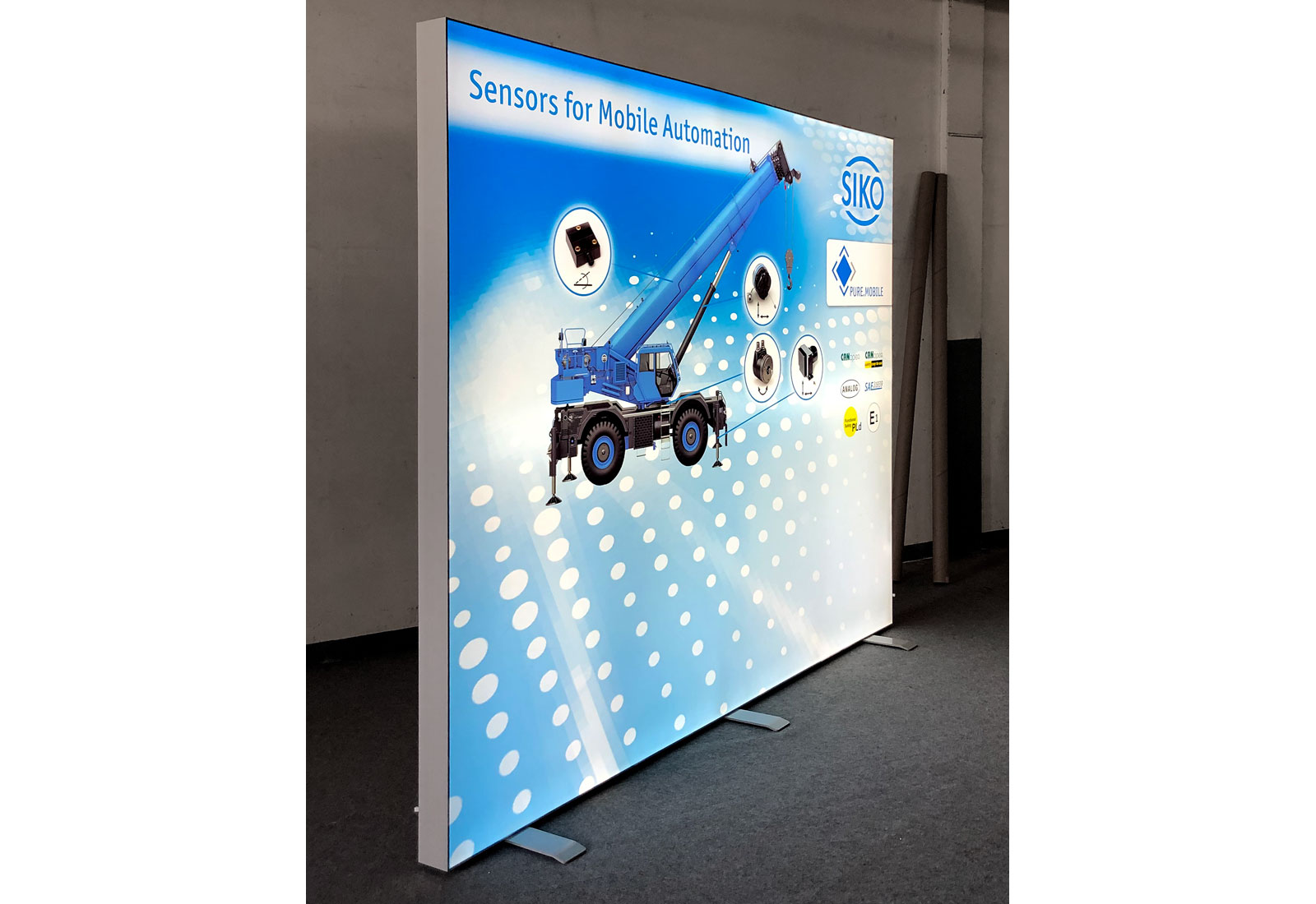 Besonders hochwertig sind leuchtende Messestände von OCTANORM. Das Grundsystem besteht aus einem 12 cm breitem Aluminiumprofil in dem leuchtstarke LEDs vormontiert sind. Die Systemgröße kann individuell nach Kundenwunsch gefertigt werden. So sind auch großformatige XXL-Leuchtwände umsetzbar. Für den Hersteller von Messgeräten und Positioniersysteme SIKO, fertigten wir eine OCTAlumina Leuchtwand im Format B: 300 cm und H: 250 cm. Die Bespannung mit Diamaterial erfolgte doppelseitig.