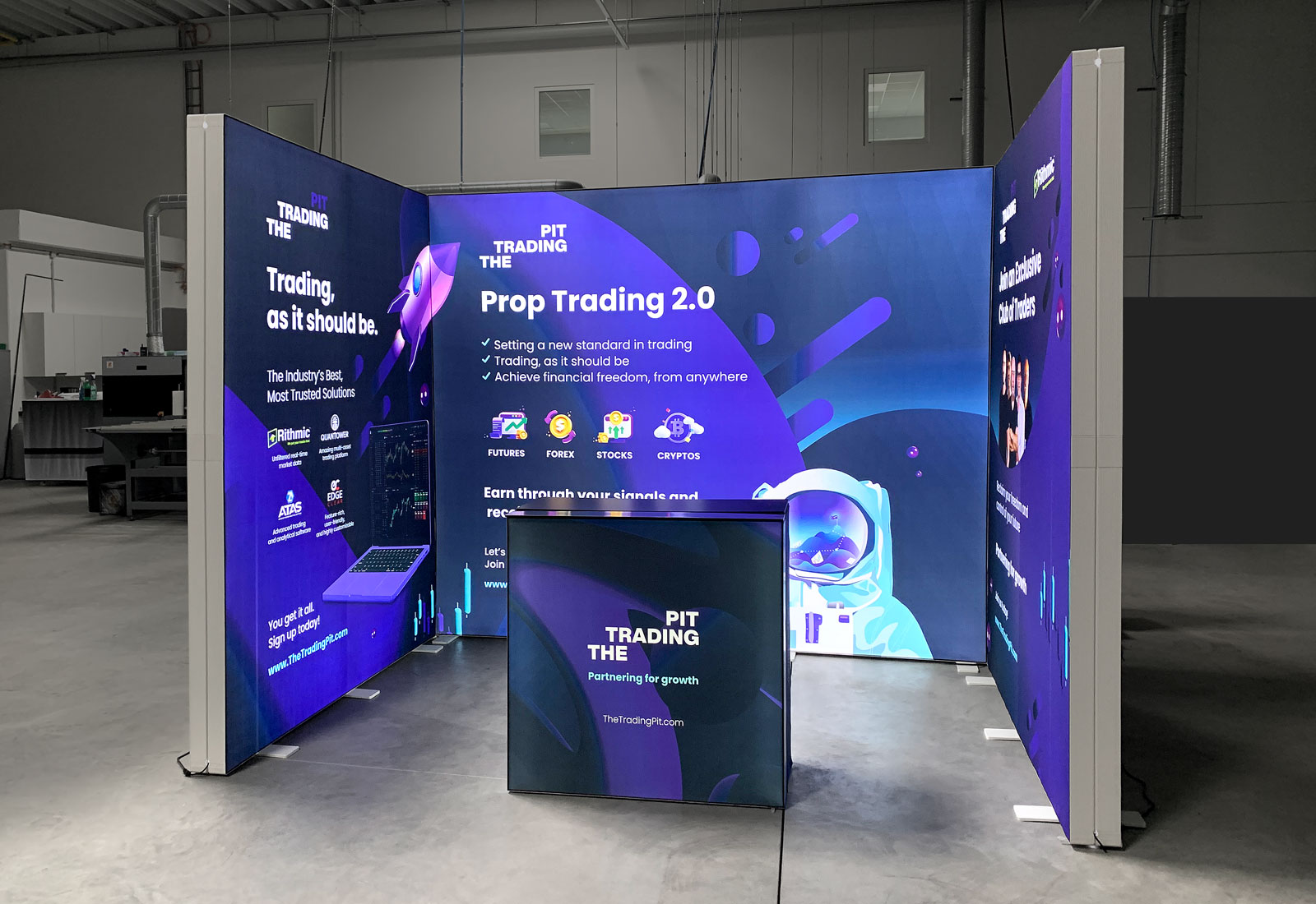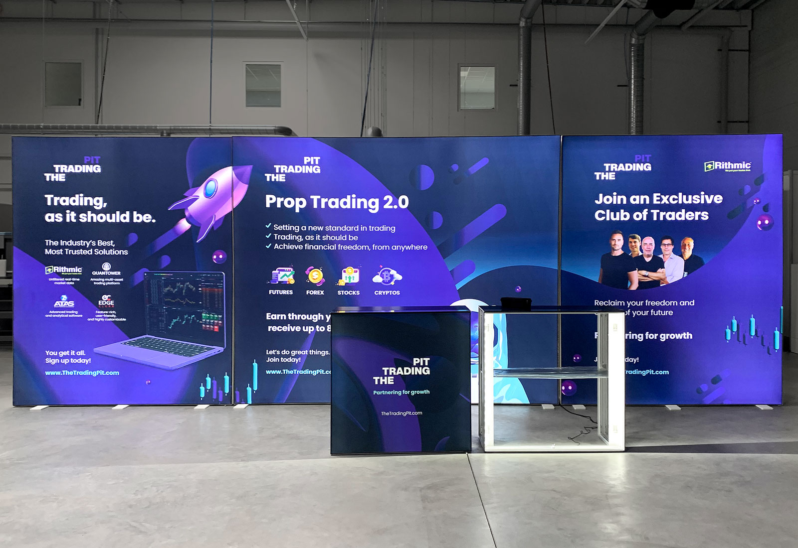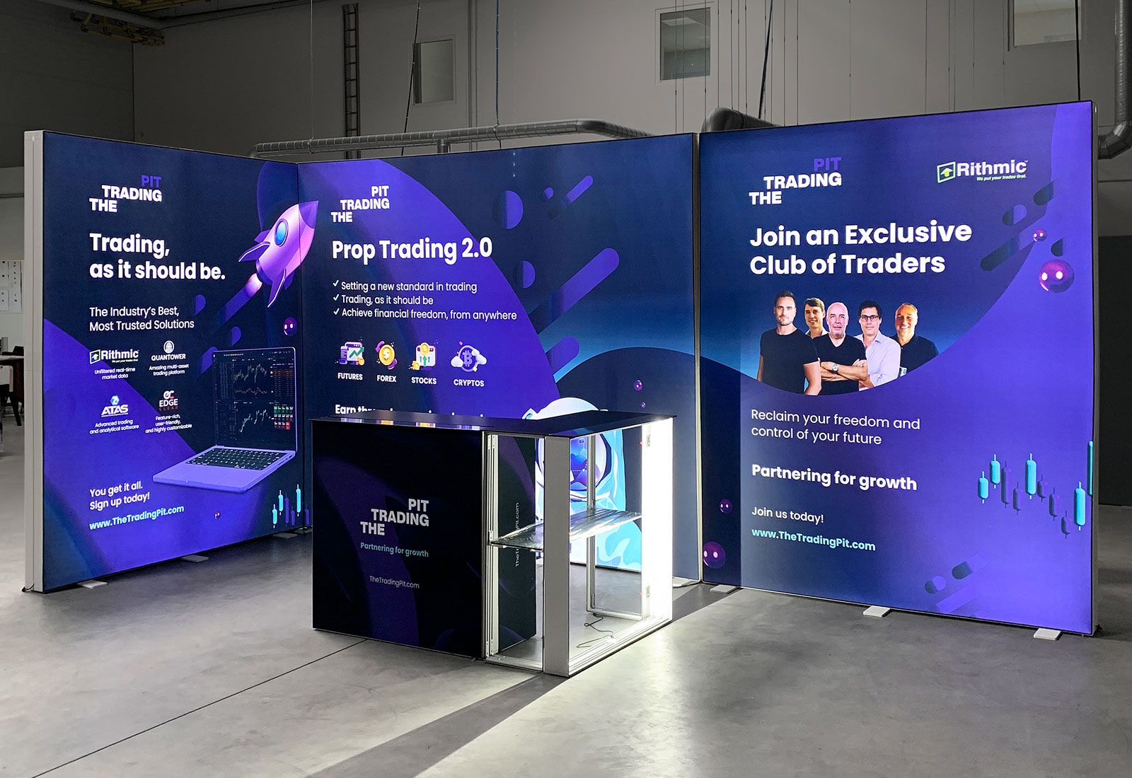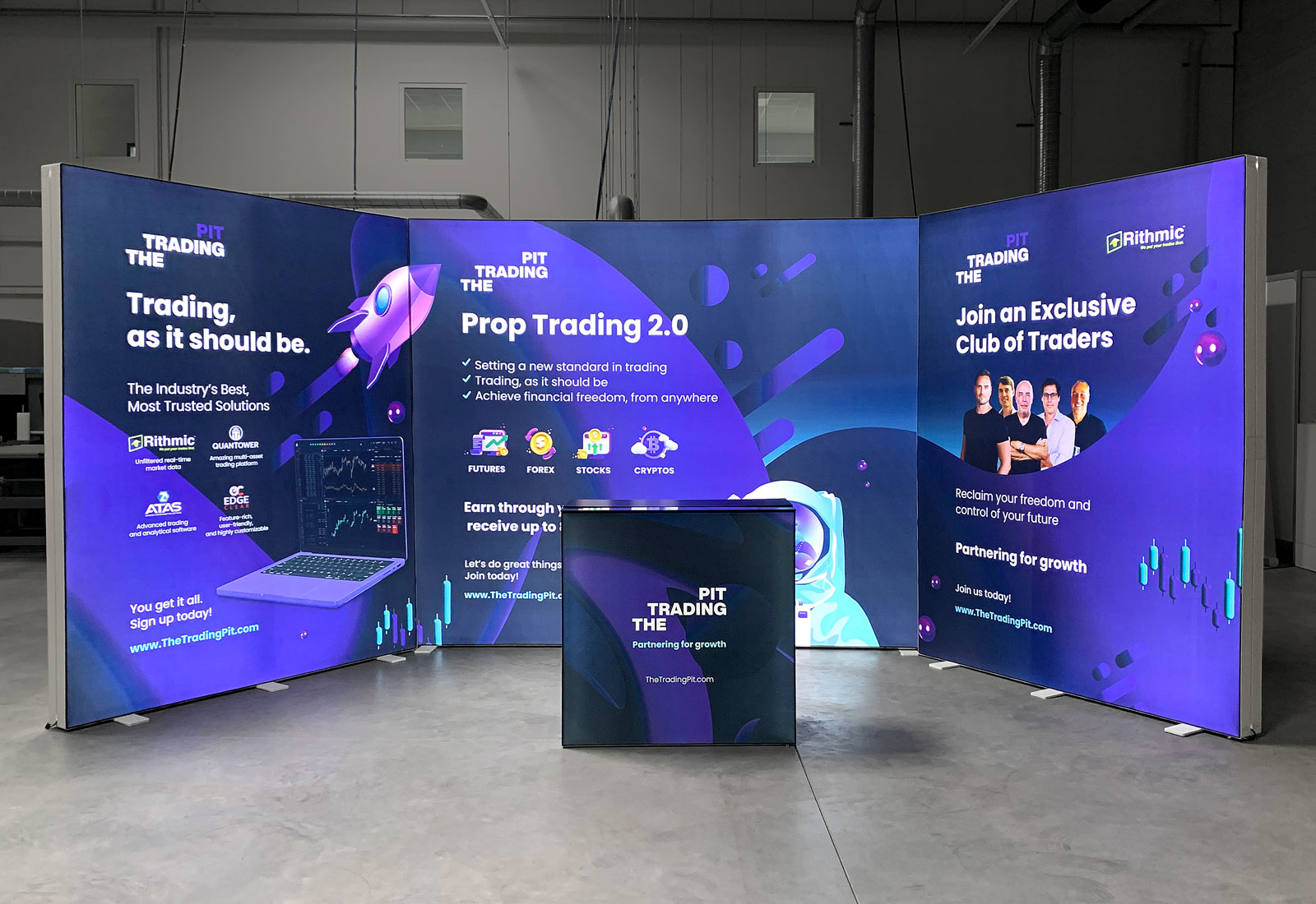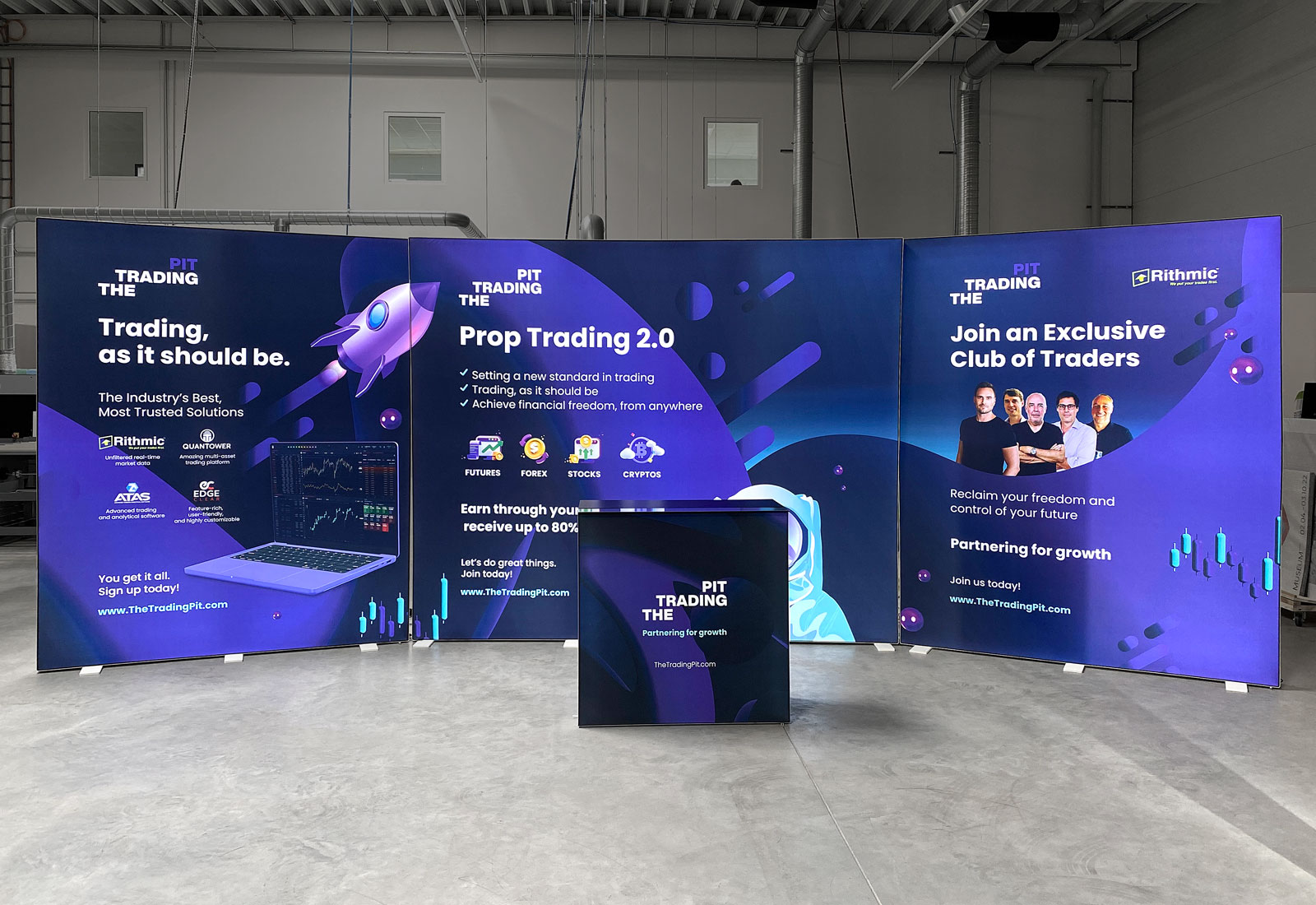 Für den Kunden „The Trading Pit“ produzierte Martincolor mehrere faltbare Dia-Textilbespannungen für das LED-Leuchtsystem PIXLIP GO. Dieses System ist in unterschiedlichen Größen erhältlich. Die Entscheidung fiel auf 3 Systemkombinationen, die sich flexibel stellen ließen: Entweder dicht nebeneinander, über Eck oder auch angewinkelt. Gerade wie es im gegebenen Raum passt, ist und bleibt dieses LED-Leuchtsystem ein wahrer Hingucker, natürlich durch die leuchtstarken LEDs, die sich bereits in den Profilen befinden. Alles wurde noch mit leuchtstarken ALU STAR PLUS LED-Theken ergänzt. Schnell und einfach ist der Auf- und Abbau, sowie die Anbringung der Textilbespannung durch eine einfache Stecktechnik. Das gesamte System mit dem zusammengelegten Textilspanndia passt in einem handlichen und stabilen Koffer aus ABS-Kunststoff und lässt sich problemlos transportieren.