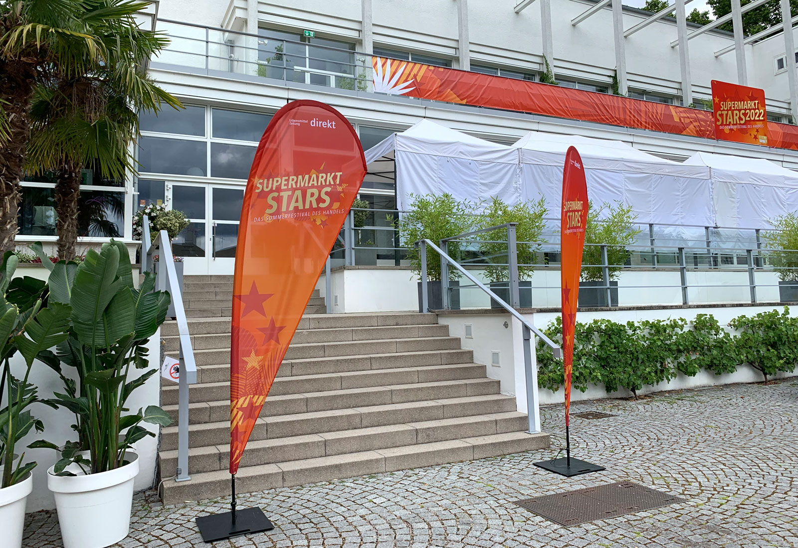 Für das große Sommerfestival des Handels „Supermarkt Stars 2022“ im Frankfurter Palmengarten produzierte und montierte MARTINCOLOR unter anderem die festliche Außengestaltung. Unser professionelles Montage-Team brachte einen 30 m langen Banner am Balkongeländer, eine davorstehende ZippWall Straight (300x230 cm), die Verkleidung der Faltpavillons, sowie mehrerer „Beachflag Drop M“ an. Nun stand zahlreichen Bühnenmomenten, vor allem der Preisverleihung der diesjährigen Gewinner, nichts mehr im Wege.