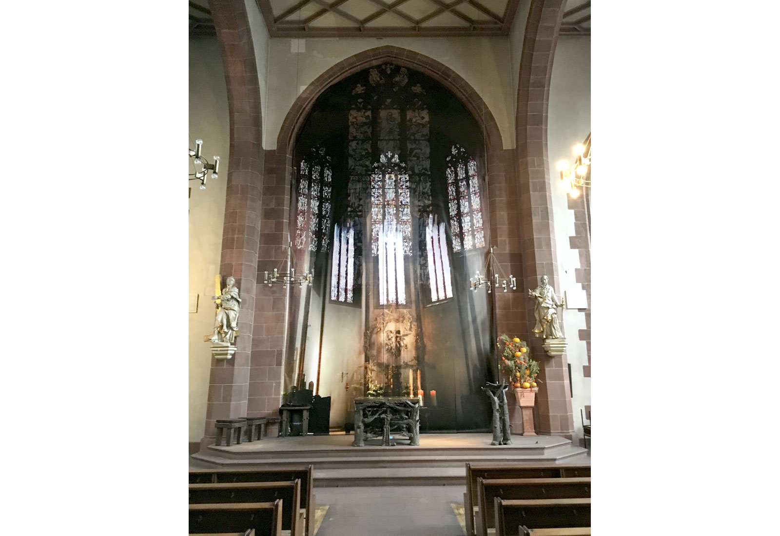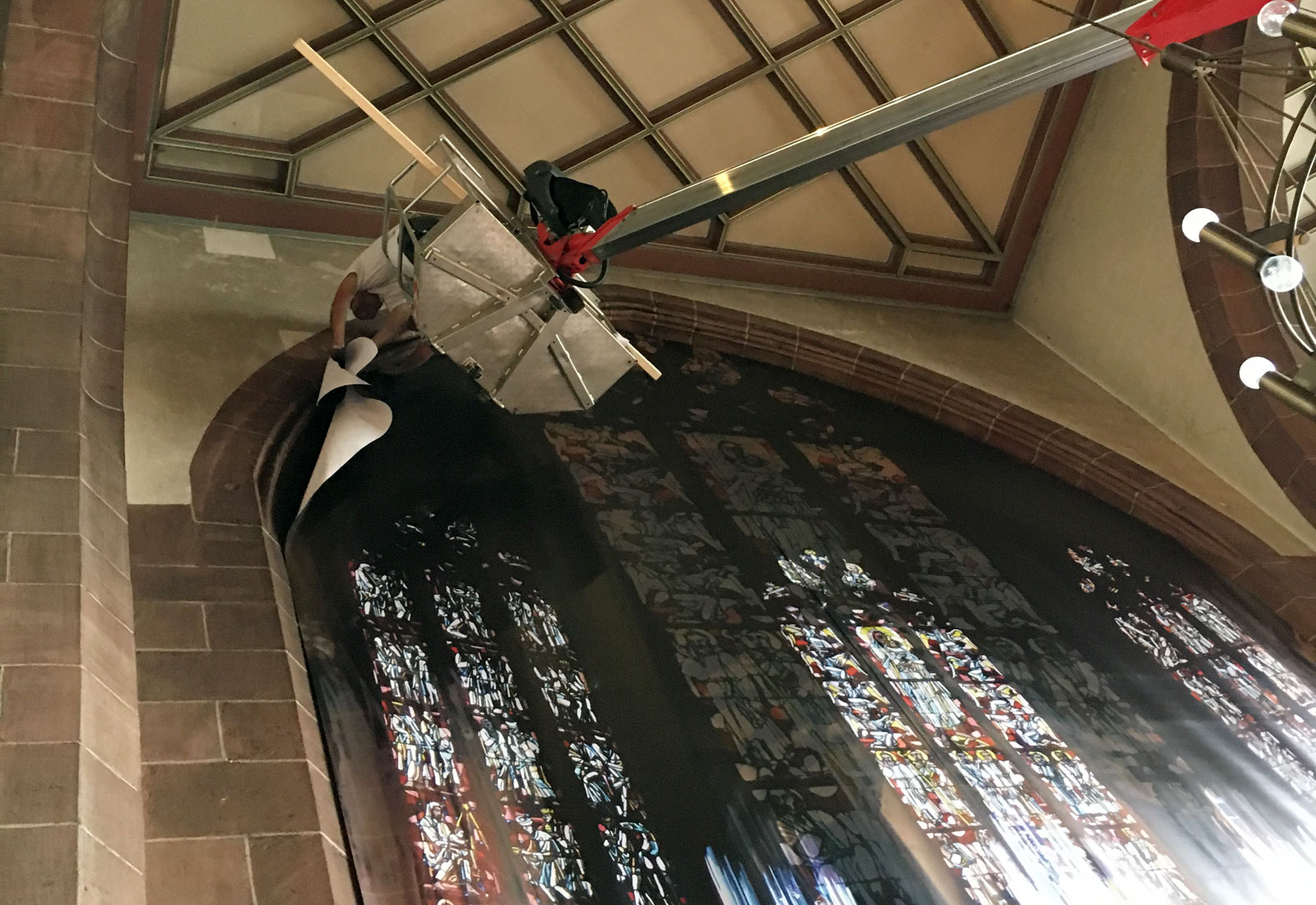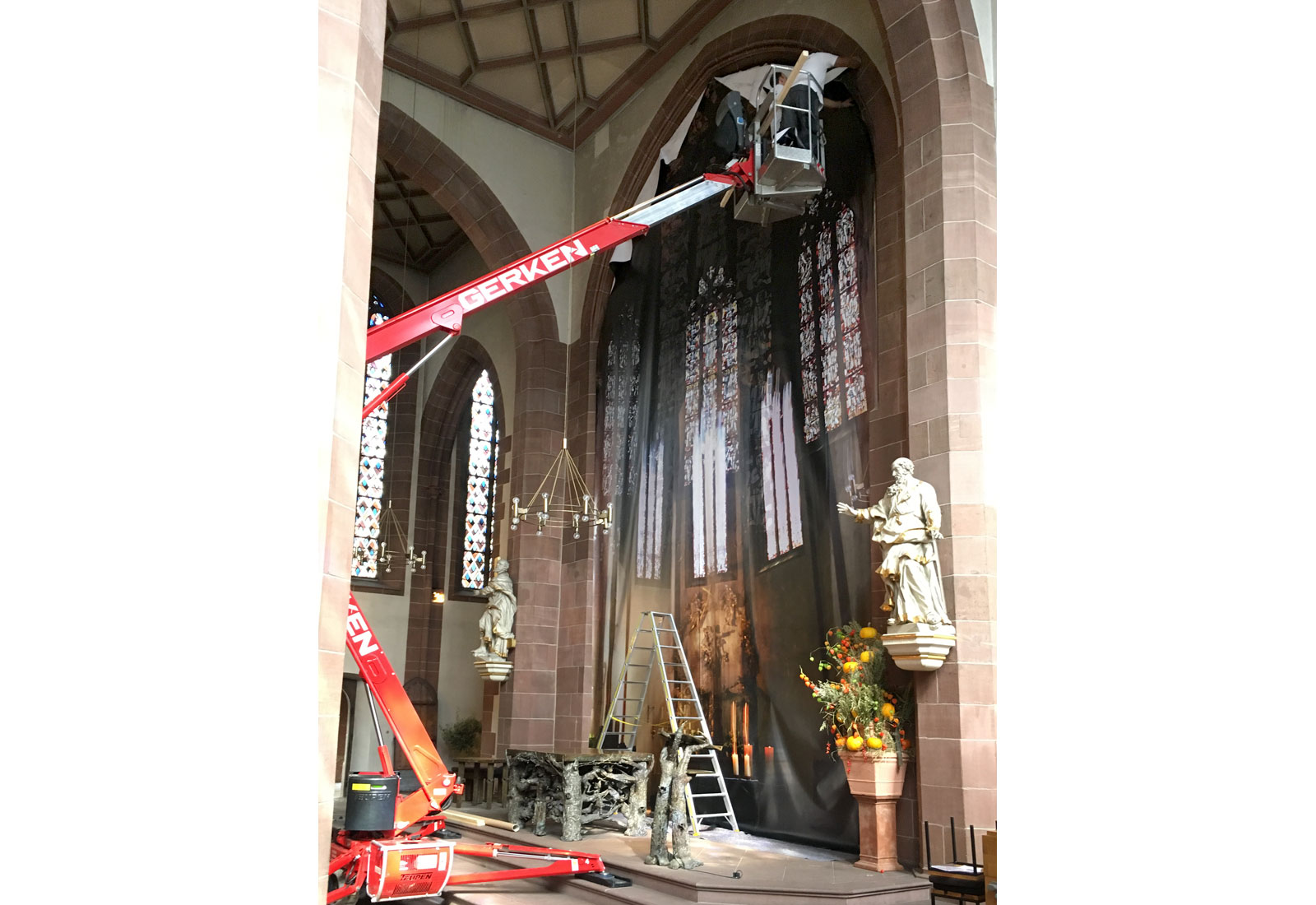 Für die Renovierungsarbeiten in der Liebfrauenkirche in Frankfurt musste der Altarbereich mit einer aufwändigen Konstruktion abgetrennt werden. Um diese Konstruktion zu verdecken, erstellte die Fotografin Ulrike Klaiber aus Frankfurt ein Bild des dahinterliegenden Bereichs. Dieses Bild wurde auf eine 11-m-hohe Plane gedruckt und vom MARTINCOLOR-Montageteam vor Ort angebracht.