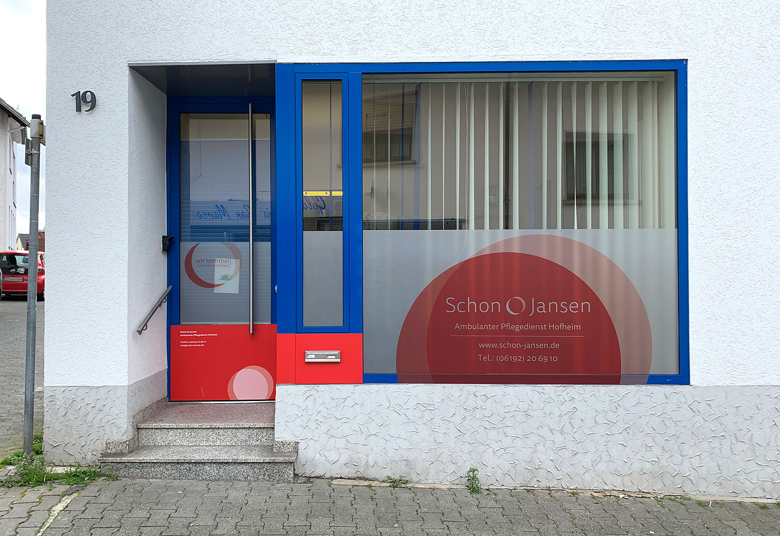 Für den Kunden Schon & Jansen Kranken- und Tagespflege e.K. fertigte MARTINCOLOR die Schaufensterbeklebung an. Gedruckt wurde auf Outdoor-Selbstklebefolie, aus der mittels Schneideplottern großflächige Kreise herausgeschnitten wurden. Diese wurden dann von außen auf die Schaufenster aufgeklebt. Plotterschriften in verschiedenen Ausführungen und Größen wurden zusätzlich auf die Schaufenstern geklebt. Mehr Informationen über Schaufensterbeschrifungen erhalten Sie unter Tel. +49 (0) 69 75 60 80-81.
