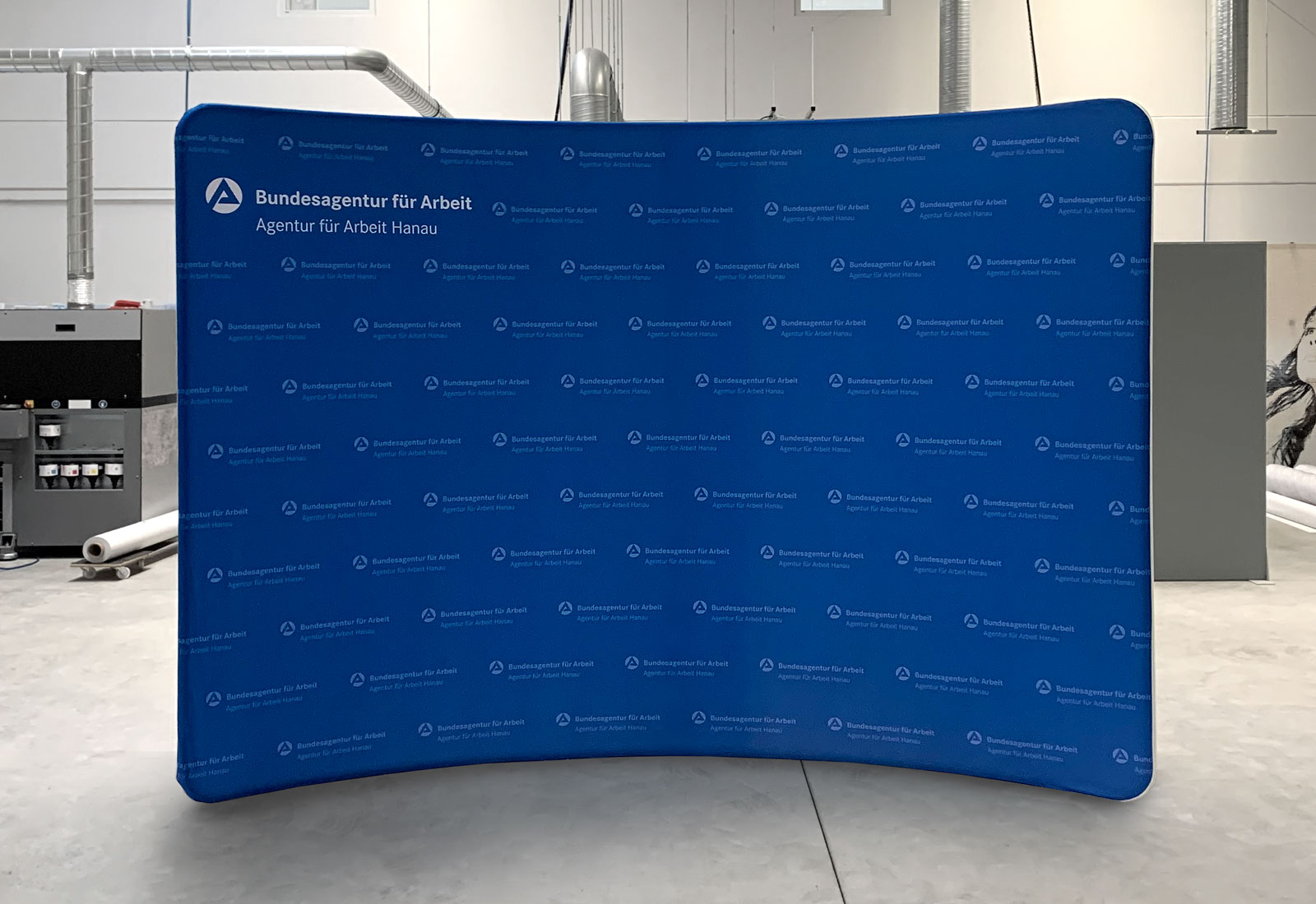Die „Agentur für Arbeit Hanau“ benötigte für eine Veranstaltung eine Rückwand, die Martincolor produziert und weiterverarbeitet hat. Das komplette Gerüst der ZippWall besteht aus Aluminium und wird mit Click-Systemstangen zusammengesteckt. Der bedruckte Stretch-Textildruck wird ganz einfach übergezogen und mit einem Reißverschluss geschlossen. Dieses Präsentationswandsystem ist in verschiedenen Größen und Formen erhältlich. Durch die Kombination mit unterschiedlichen Thekenmodellen entsteht eine attraktive und preisgünstige Messepräsentation.