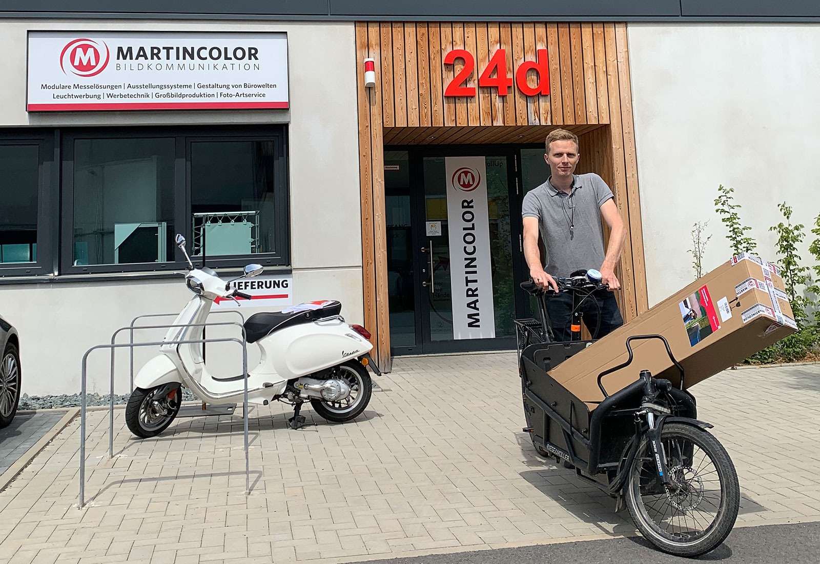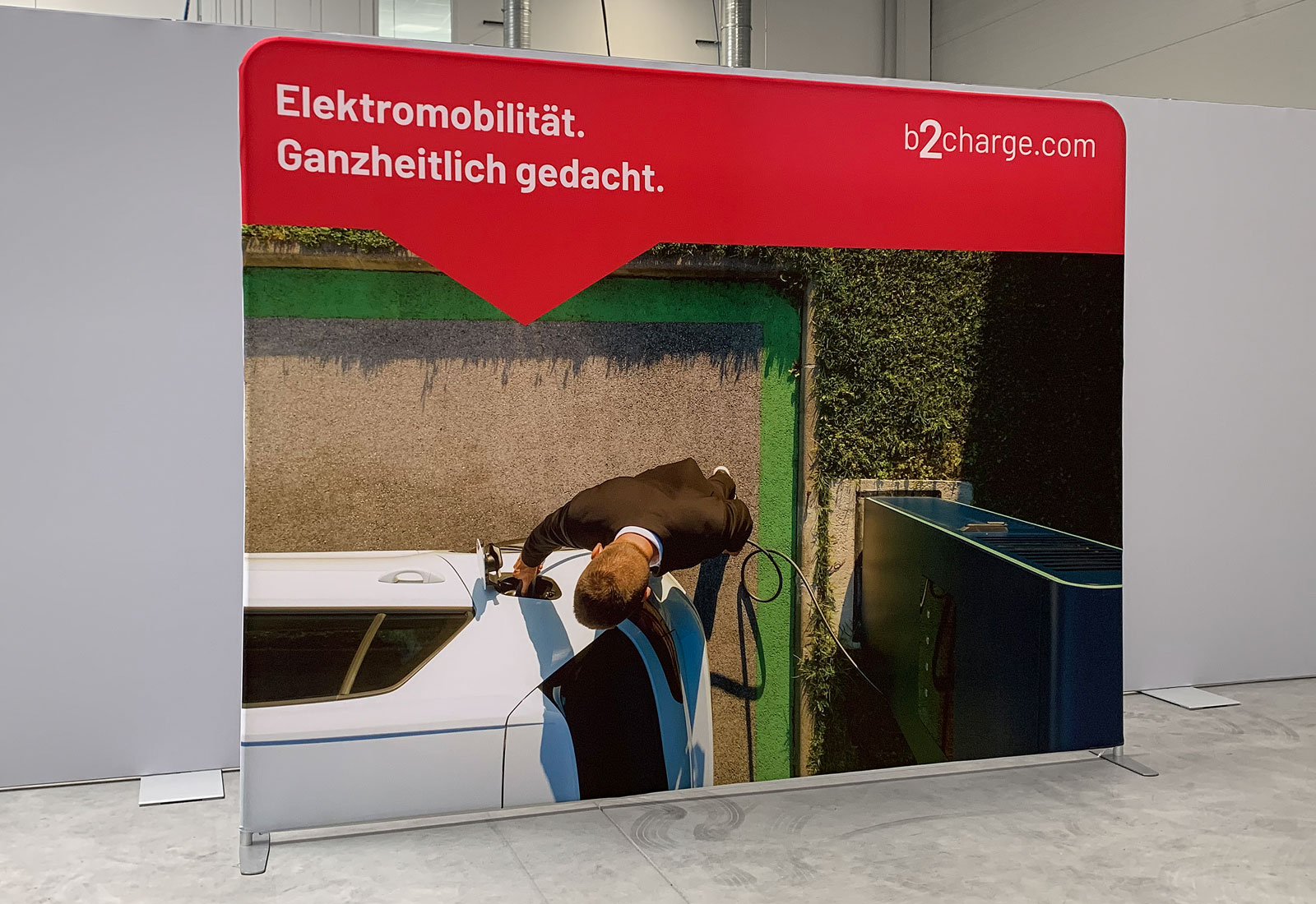 Unser Kunde „b2charge“ benötigte eine Rückwand für eine Videokonferenz. Für diesen Zweck entschied er sich für eine 300 cm breite und 230 cm hohe Wand. Die ZippWall Rückwand, gerade wie auch gebogen, ist in vielen verschiedenen Größen lieferbar und lässt sich in Windeseile auf- und abbauen. Die individuelle Bespannung wird auf einem resistenten Stoffbezug gedruckt und lässt sich ohne Probleme über das System ziehen und mit einem Reißverschluss unten schließen. Der Kunde fand zusätzlich das geringe Transportgewicht so sehr überzeugend, dass er tatsächlich das verpackte System mit seinem Lastenfahrrad abholte.