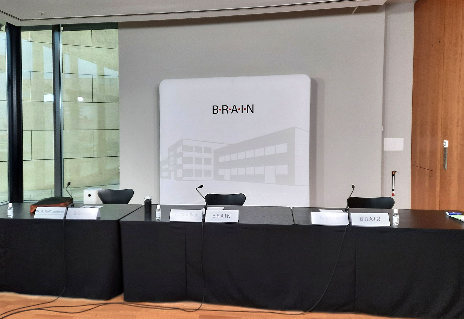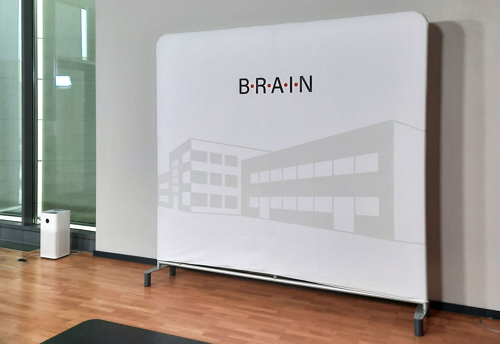 Immer wenn eine mobile, kostengünstige Rückwand benötigt wird, ist unser ZippWall System die perfekte Wahl. Das mobile Rückwandsystem gibt es in vielen verschiedenen Systembreiten und -höhen. Durch den einfachen Steckmechanismus gelingt der Aufbau des Systemrahmens auch ungeübten Personen. Die Bespannung des Rahmens mit individuell bedrucktem Textilmaterial geht so einfach, wie das Aufziehen eines Kopfkissenbezugs. Auf Wunsch kann eine ZippWall Rückwand einseitig oder doppelseitig bedruckt werden. Oder Sie wählen eine Bespannung mit Greenscreen-Material um digitale Hintergründe zu erstellen. Für die BRAIN AG produzierten wir die im Bild gezeigte Rückwand für eine Inhouse-Videokonferenz. Die Maße der Video-Rückwand betrugen B: 250 cm und H: 230 cm. Bei dem verwendeten Bespannungs-Material handelt es sich um einen völlig reflexfreien Stoff mit hohem Stretch-Anteil, sodass eine faltenfrei Präsentation garantiert ist.