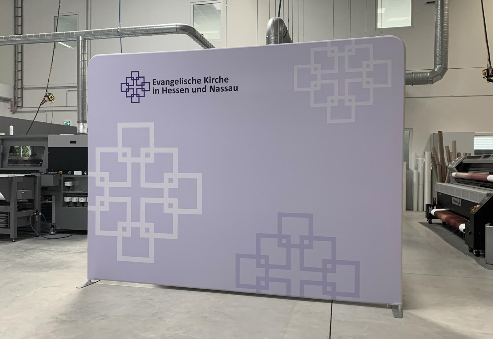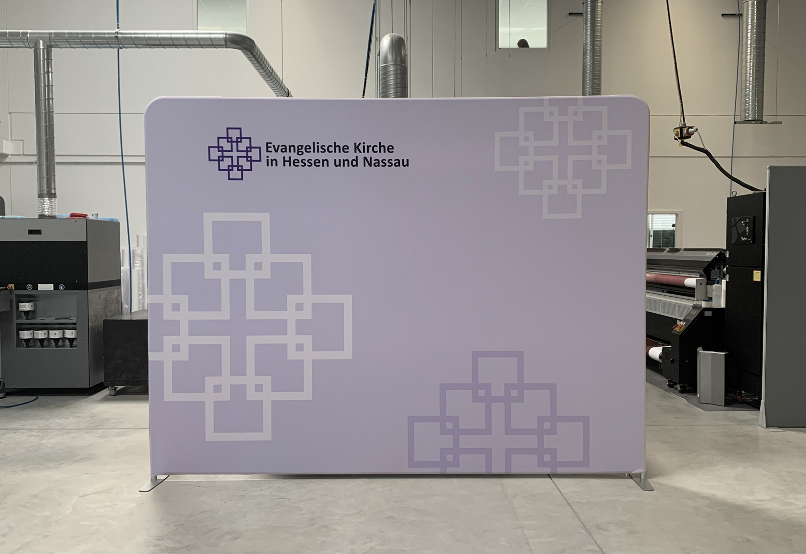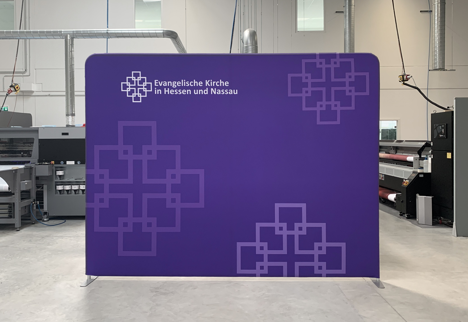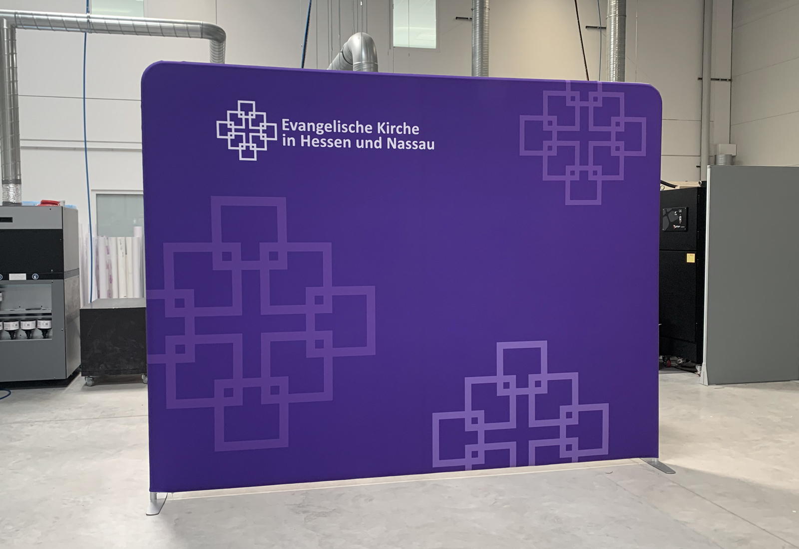Die Evangelische Kirche ließ zwei ZippWalls (300 cm breit) bei Martincolor produzieren, die als Messewände wie auch als Rückwände für z. B. Videokonferenzen dienen können. Über den stabilen Rahmen, der durch Click-Systemstangen ineinandergesteckt werden kann, lässt sich der individuelle Grafikdruck ganz einfach überziehen und mit einem Reißverschluss verschließen. Die ZippWall-Systeme sind in unterschiedlichen Formen (gebogen und gerade) und Größen erhältlich (bis zu 600 cm in der Breite). Selbstverständlich können Sie die Bespannung neu drucken lassen, austauschen und dadurch Ihr Auftreten immer wieder aktualisieren. Ideal ist das leichte Gewicht des ZippWall-Systems, welches sich einfach in einem Trolley transportieren lässt.