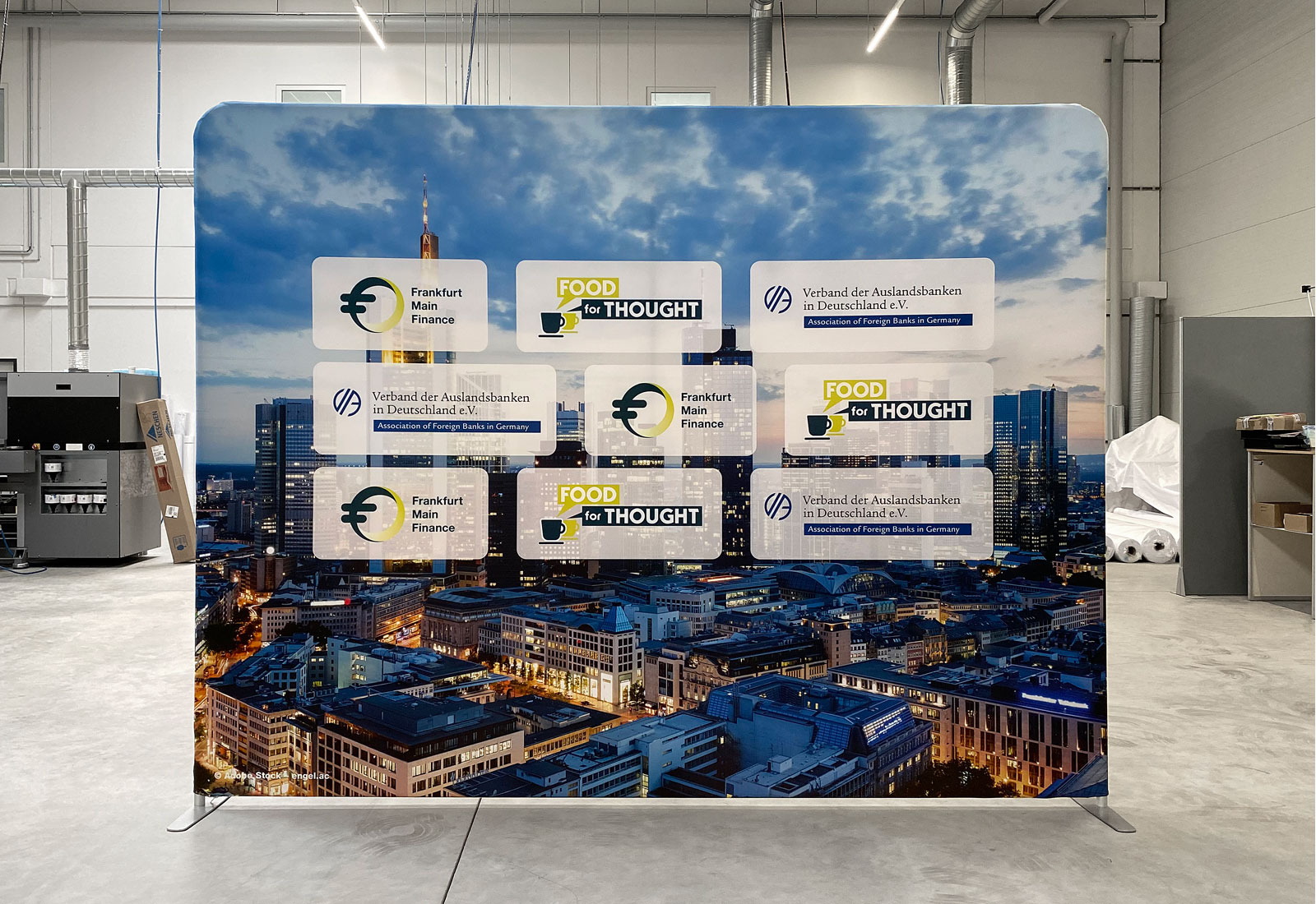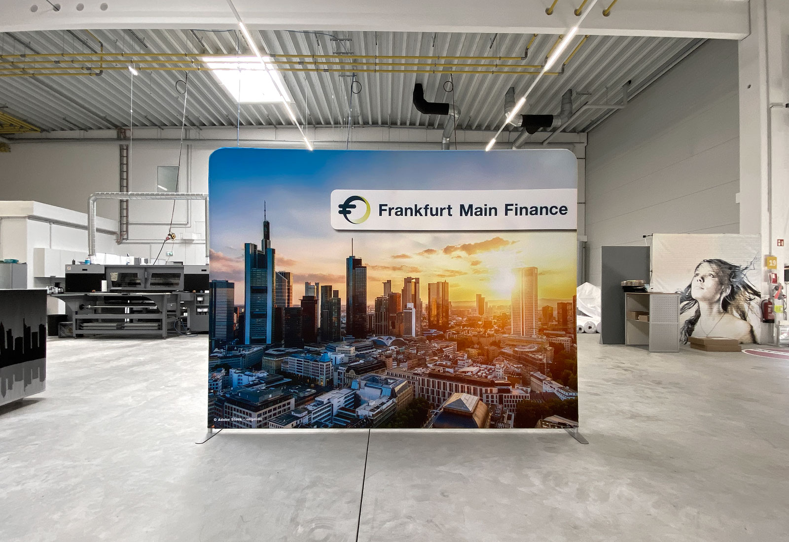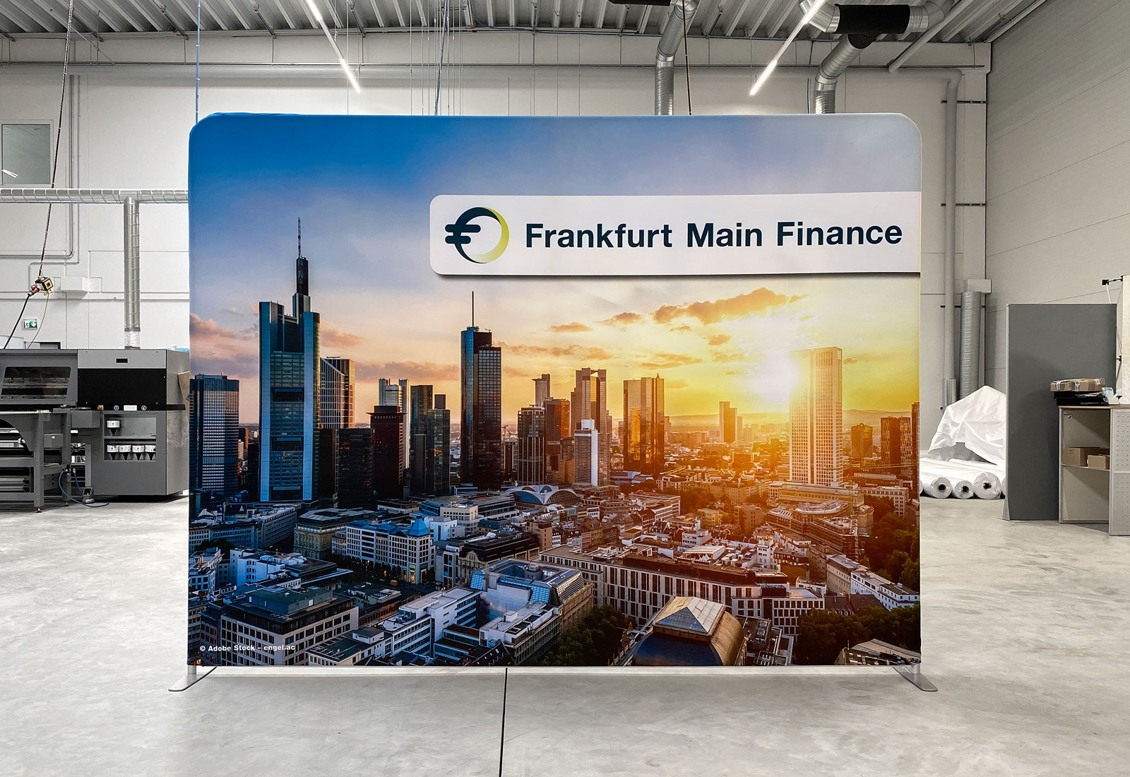 Unser Kunde Frankfurt Main Finance ist eine Finanzplatzinitiative des führenden Finanzplatzes in Deutschland und der Eurozone. Zu den Mitgliedern zählen u.a. das Land Hessen, die Städte Frankfurt und Eschborn, zahlreiche Banken und Finanzdienstleister sowie verschiedene Hochschulen. Für die Online-Meetings der Frankfurt Main Finance produzierten wir eine Rückwand mit individueller, doppelseitige Bedruckung sowie einer Greenscreen-Bespannungen. Die Wahl des Kunden fiel auf unsere praktische ZippWall Rückwand. Dieses Wandsystem besteht aus einem zusammensteckbaren Aluminiumrahmen, der mit einem textilen Stretchmaterial bezogen ist. Dieses Material kann mit einem individuellen Aufdruck versehen werden, ist völlig reflexfrei und deshalb für Videoaufnahmen ideal geeignet. Alternativ kann der ZippWall Systemrahmen auch mit einem Greenscreen-Überzug versehen werden. Damit ist die ZippWall die perfekte Rückwand für Videokonferenzen, Webinare und Zoom-Meetings.