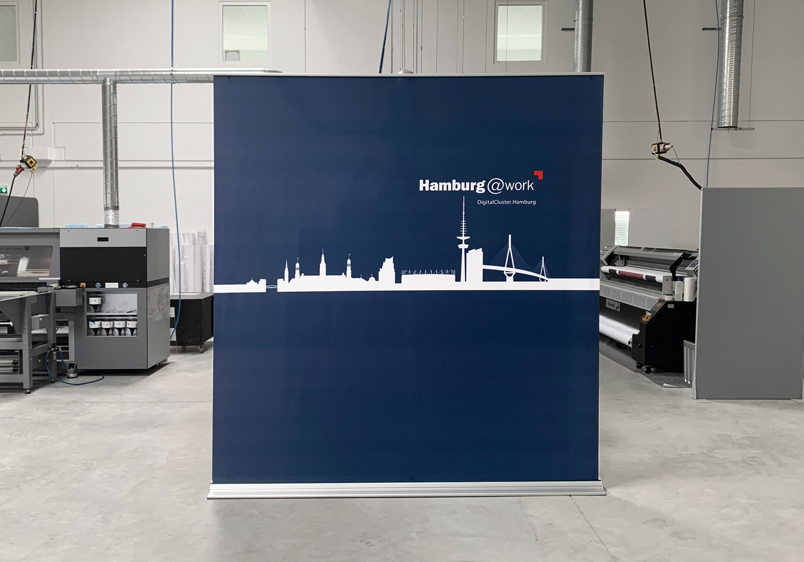 Für interne und externe Online-Meetings entschied sich unser Kunde Hamburg@work GFM mbH für den Einsatz von Mega RollUps. Diese riesengroßen RollUps sind in Breiten bis zu 3,2 m lieferbar. Die Standardhöhe der Systeme beträgt 2,5 m. RollUps sind besonders praktisch, wenn man Rückwände schnell einsatzfähig auf- und abbauen möchte. Auf Wunsch können die Systeme auch mit einem speziellen Greenscreen-Material versehen werden. Mehr Infos zu unseren Mega RollUps findest Du hier.