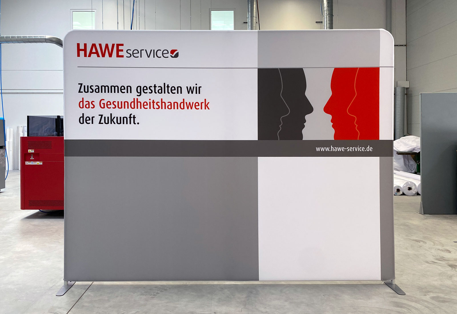 Für die Unternehmensberatung im Gesundheitshandwerk HAWE Service GmbH gestalteten und produzierten wir die hier gezeigte Rückwand für Online-Meetings und Webinare. HAWE entschied sich für unseren Bestseller: Die Rückwand ZippWall gibt es in Breiten bis zu 600 cm und in einer Höhe von 230 cm. Durch das einfache Stecksystem ist sie kinderleicht auf- und abzubauen und damit ideal als flexible Rückwand für Videokonferenzen geeignet. Die textile Bespannung kann ein- oder doppelseitig mit individuellem Aufdruck versehen werden und ist knickfest. Wenn der Systemrahmen zusammen gesteckt ist, wird die Bespannung einfach über den Rahmen gestülpt und unten mit einem Reissverschluß faltenfrei gespannt. Gelagert bzw. transportiert wird die ZippWall Rückwand in einer handlichen Rolltasche, für die Sie überall einen Platz finden werden. Sollte die Bespannung einmal schmutzig werden, lässt sie sich in einer normalen Waschmaschine bei 30 Grad waschen.