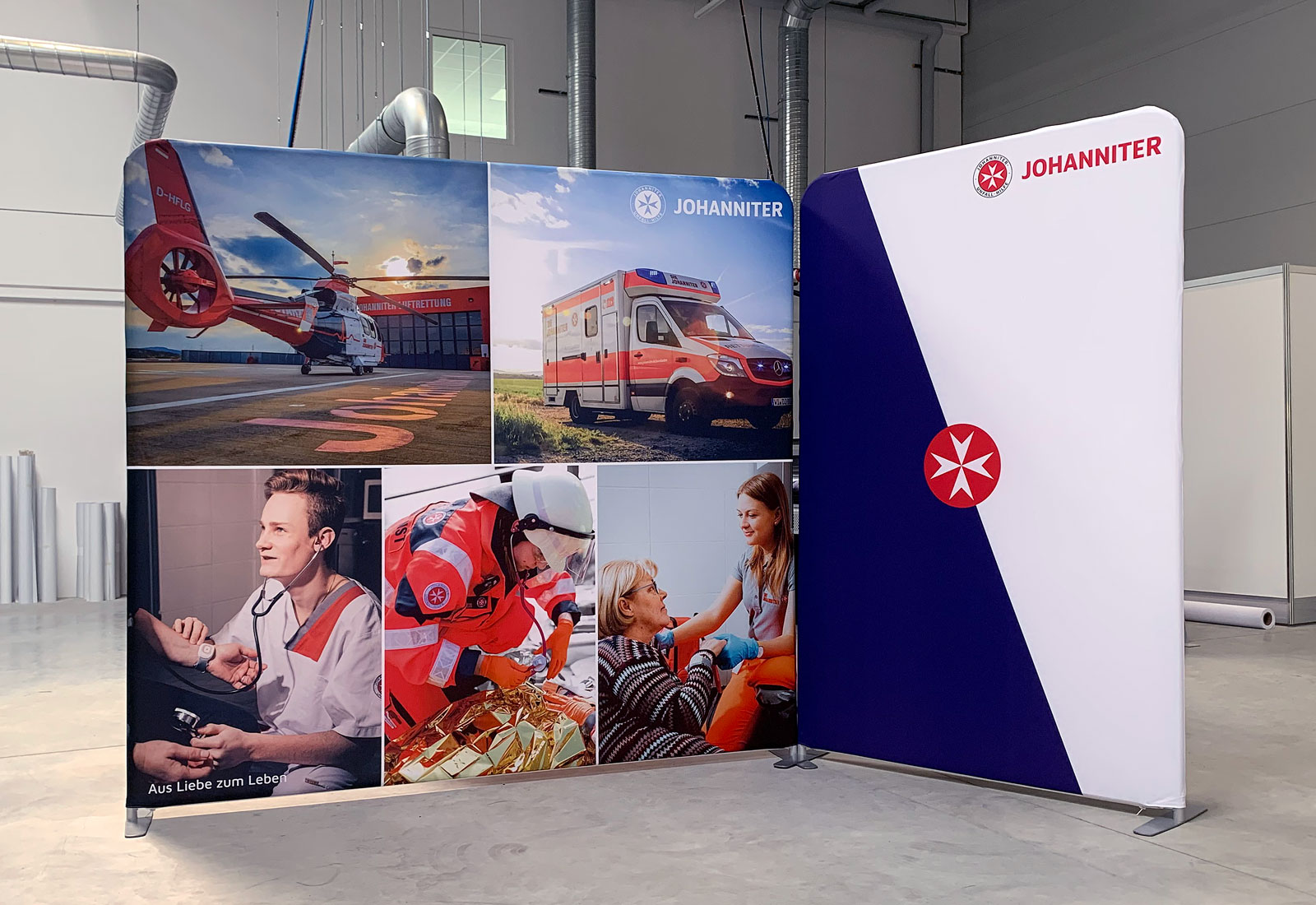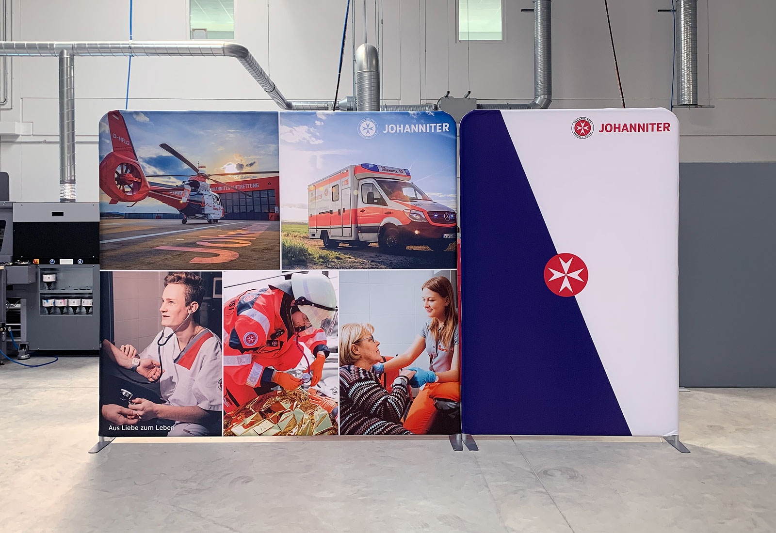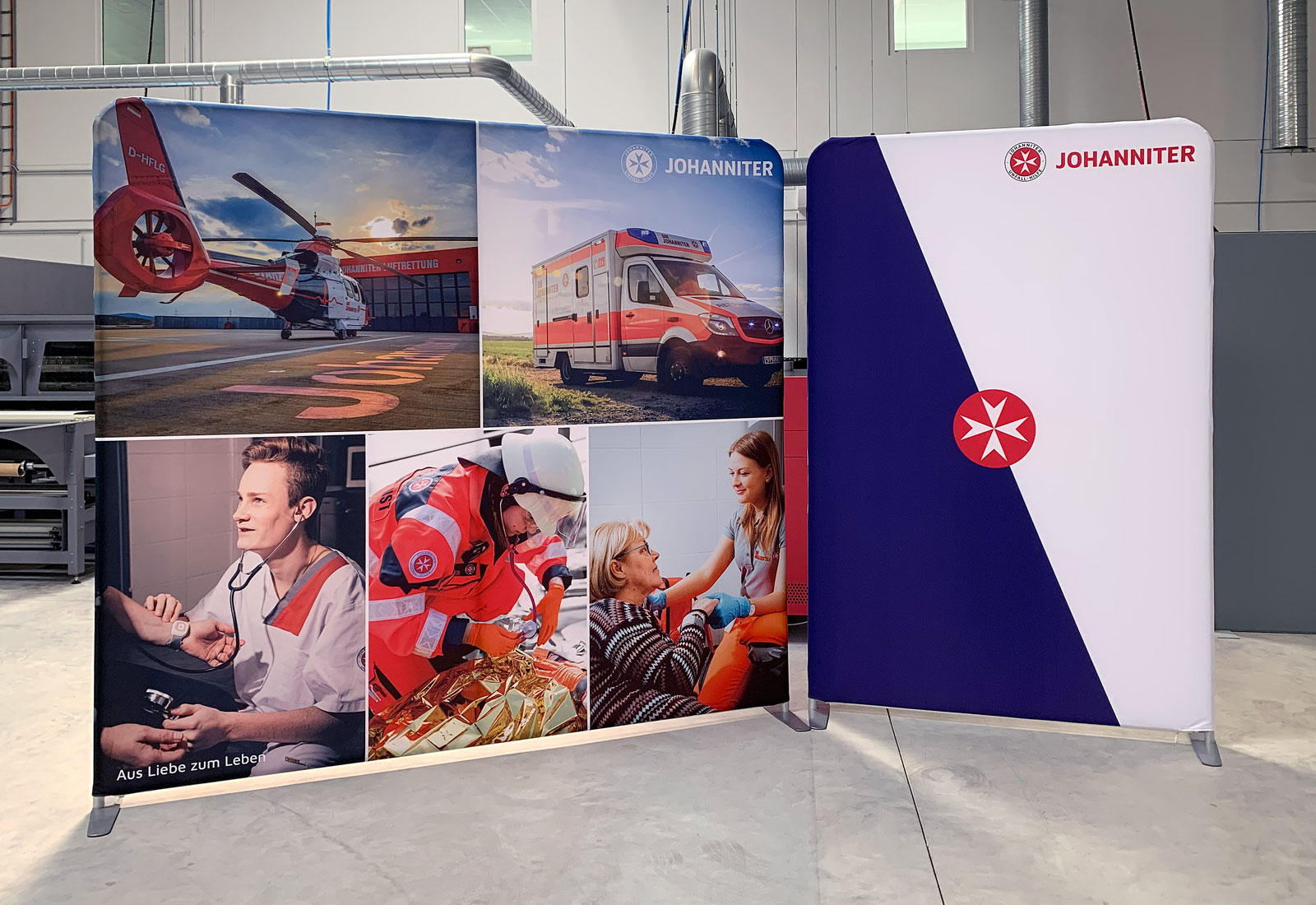 Für die Johanniter-Unfall-Hilfe e.V. fertigten wir zahlreiche Rückwände, die für Pressekonferenzen, Videokonferenzen aber auch für andere Veranstaltungen genutzt werden sollen. Unsere ZippWall Rückwände gibt es in vielen Größen. An beliebtesten sind Rückwände von 2 m bis 4 m. Die Wandkonstruktion besteht aus Aluminiumrohren, die zu einem großformatigen Rahmen zusammen gesteckt werden. Die Wandhöhe beträgt immer 2,3 m. Über den Rahmen wird ein individuell bedruckter Stoff gezogen, der doppelseitig mit Grafik versehen werden kann.