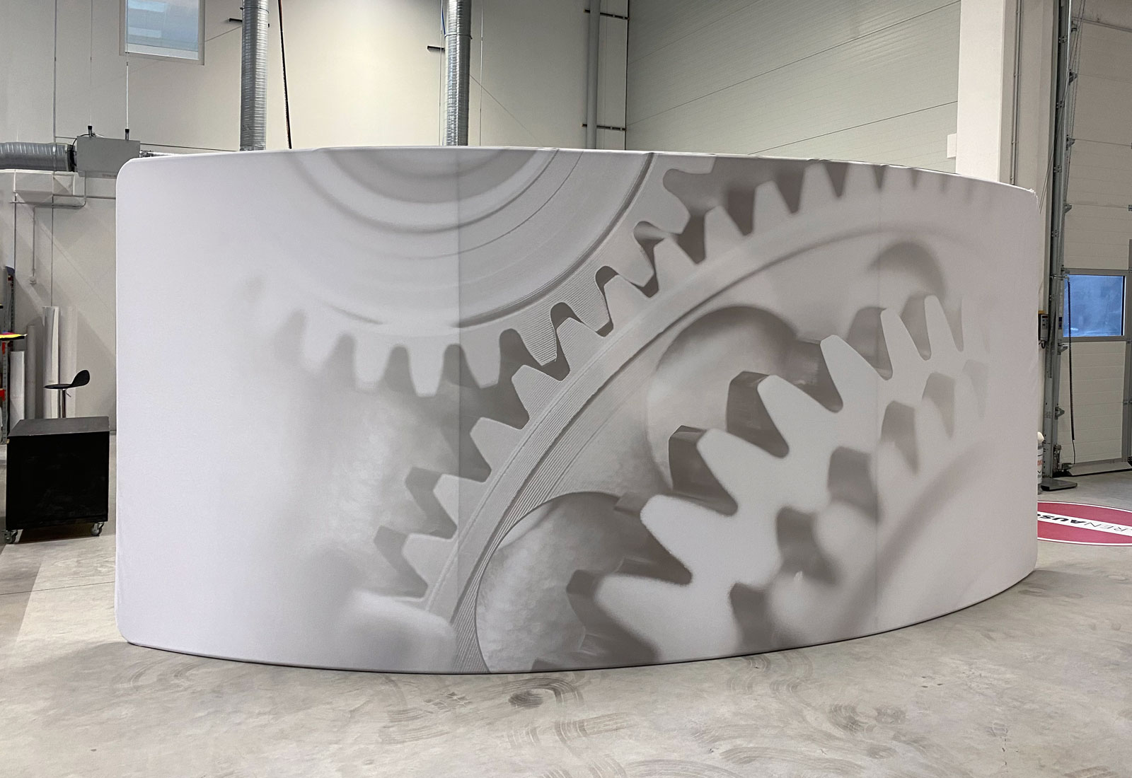 Beeindruckend in der Größe ist die 5 m breite, gebogene Videokonferenz-Rückwand, die wir im Auftrag der KAPP GmbH & Co. KG gefertigt haben. Der mit einem Logo-Rapport gestaltete Videokonferenz Hintergrund wurde auf einem reflexfreiem Textilmaterial gefertigt, das speziell für Filmaufnahmen geeignet ist. Auch die Rückseite der Wand erfolgte mit individueller Bedruckung. Durch den wahlweisen Einsatz der Backwall als konkave bzw. konvexe eröffnen sich bei Videoaufnahmen interessante Perspektiven. Für mehr Informationen zu diesem Rückwandsystem können Sie sich informieren hier.