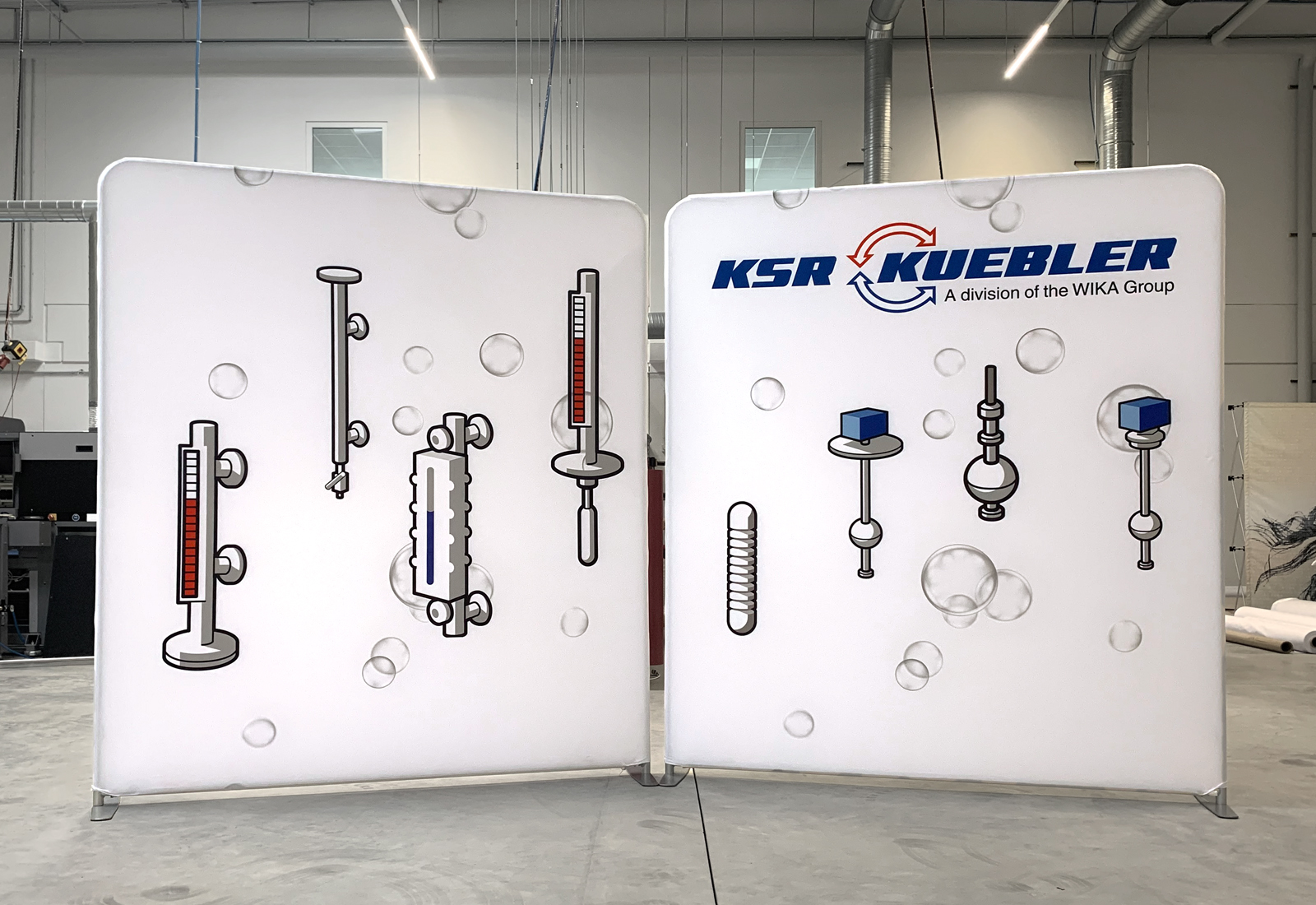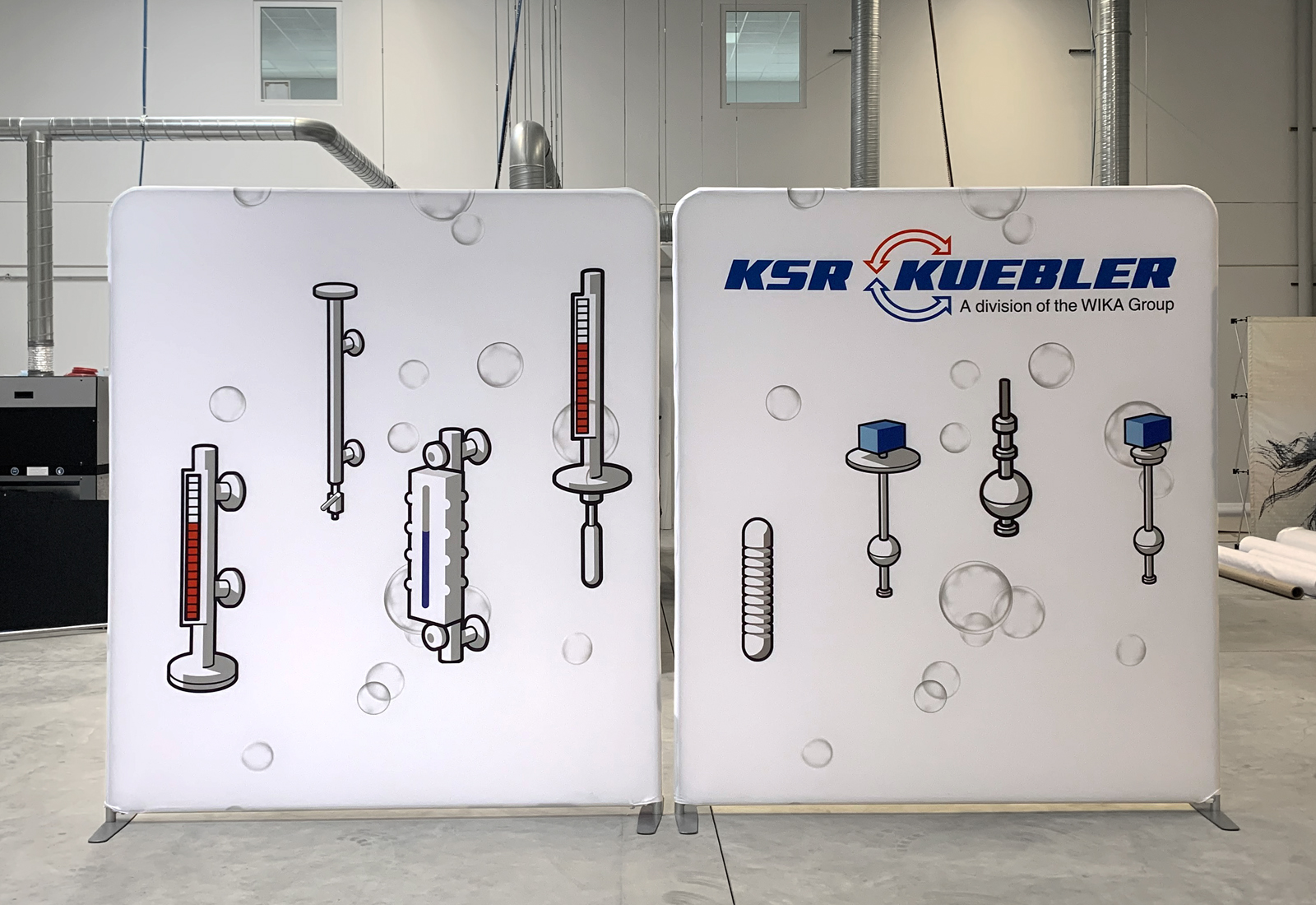 Unsere Rückwände für Videokonferenzen kann mal einzeln oder im Kombination von zwei Wänden einsetzen. Dabei sind sowohl gerade, als auch Wandkombinationen "über Eck" realisierbar, die aus zwei ZippWall Systemen bestehen. Je nach Ihren Wünschen und Anforderungen können unsere ZippWall Videokonferenz-Hintergründe auch mit ein- oder doppelseiteiger Bedruckung gefertigt werden wie hier für unseren Kunden KSR Kübler Niveau-Messtechnik GmbH.