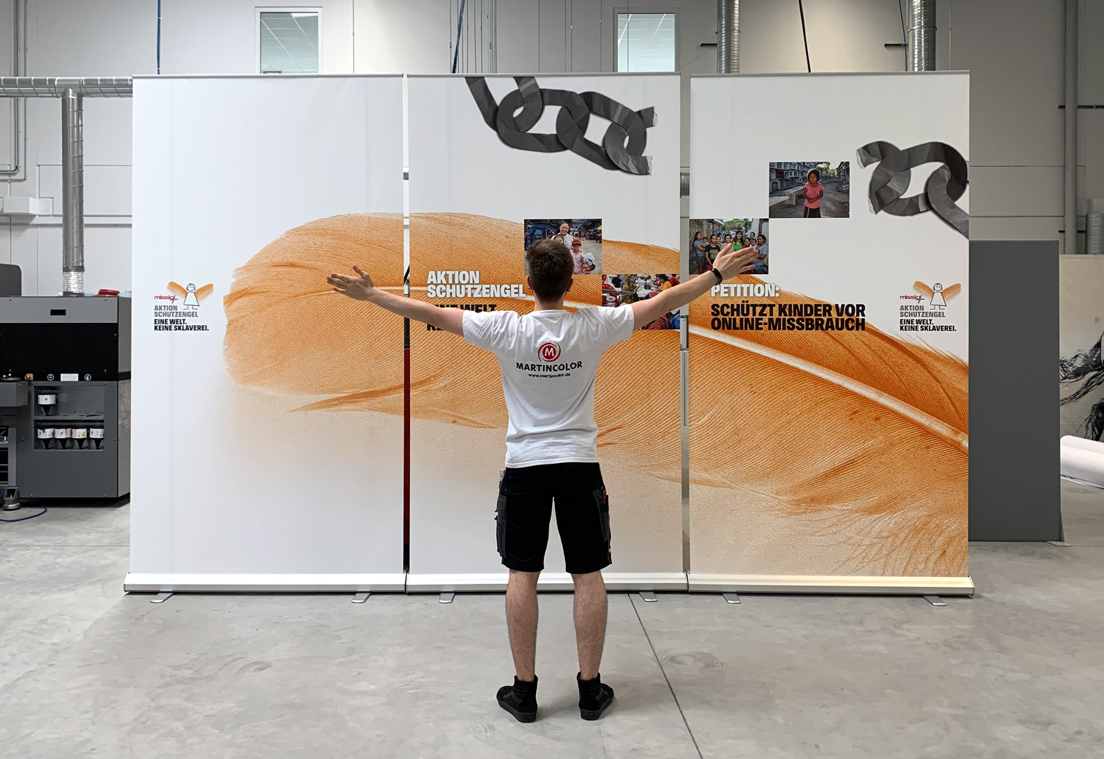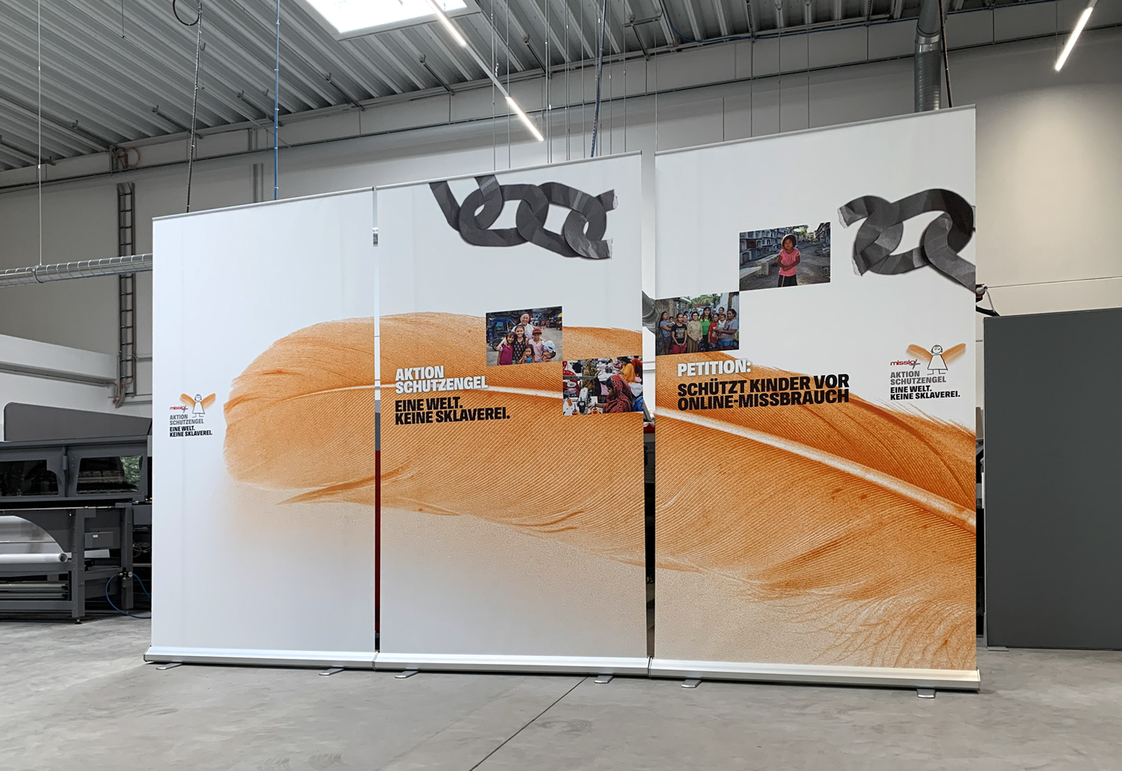 Neben großformatigen Rückwänden werden als Hintergrund für Videokonferenzen gerne auch großformatige RollUp-Systeme eingesetzt. Hier sehen Sie z.B. drei megahohe RollUps Extreme mit dem Maß H: 300 cm x B: 150 cm. Zusammen gestellt ergeben die drei RollUps eine Rückwand von 14 m². Beachten Sie jedoch, dass RollUps nicht anschlußfrei nebeneinander positioniert werden können. Es ergibt sich zwischen den Systemen immer ein Spalt von etwa 5 cm. Bei Fragen informieren Sie sich gerne unter Tel. +49 (0) 69 756080-0.