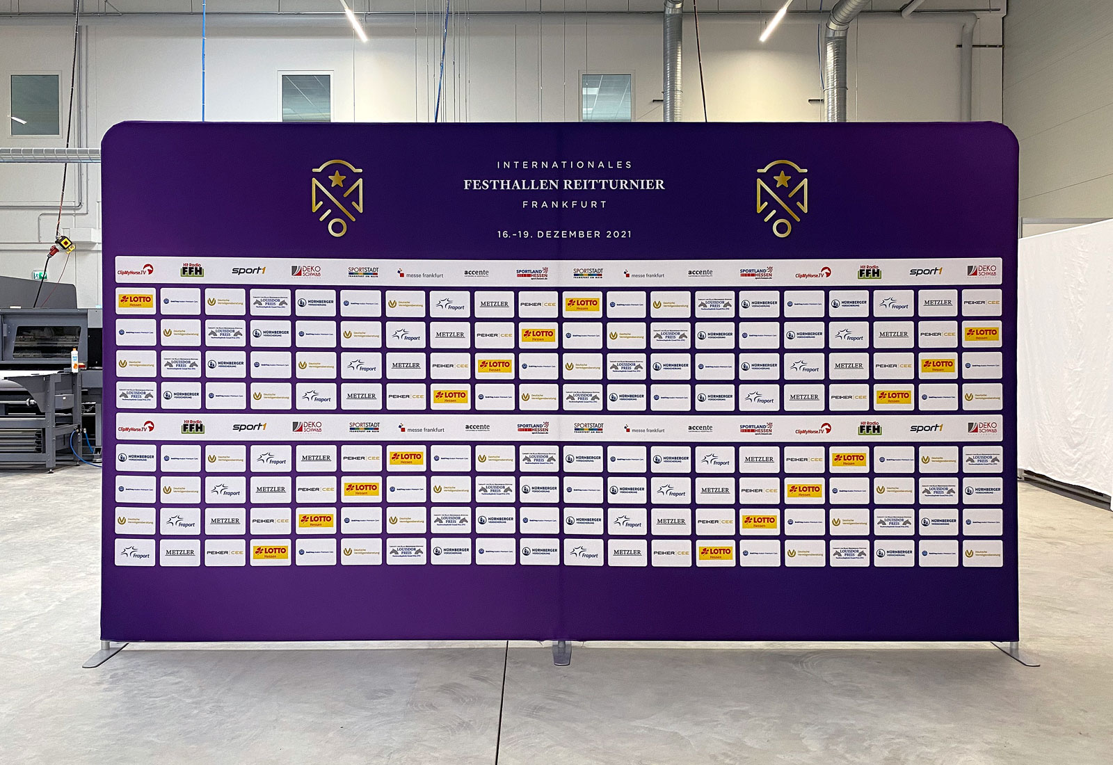 Unsere ZippWall Rückwände sind auch bei Präsenz-Veranstaltungen perfekt als Hintergrund für Pressekonferenzen geeignet. Die hier gezeigte ZippWall wird auf einem Pferde-Dressur-Festival des Schafhof Gestüts eingesetzt und dient als Rückwand für Interviews. Die ZippWall Rückwand ist selbstverständlich freistehend und kann doppelseitig mit einem individuellen Bedruck versehen werden. Sie ist in vielen Breiten und in einer Standardhöhe von 2,3 m lieferbar. Die Bespannung ist refelxfrei und deshalb perfekt für Filmaufnahmen geeignet.