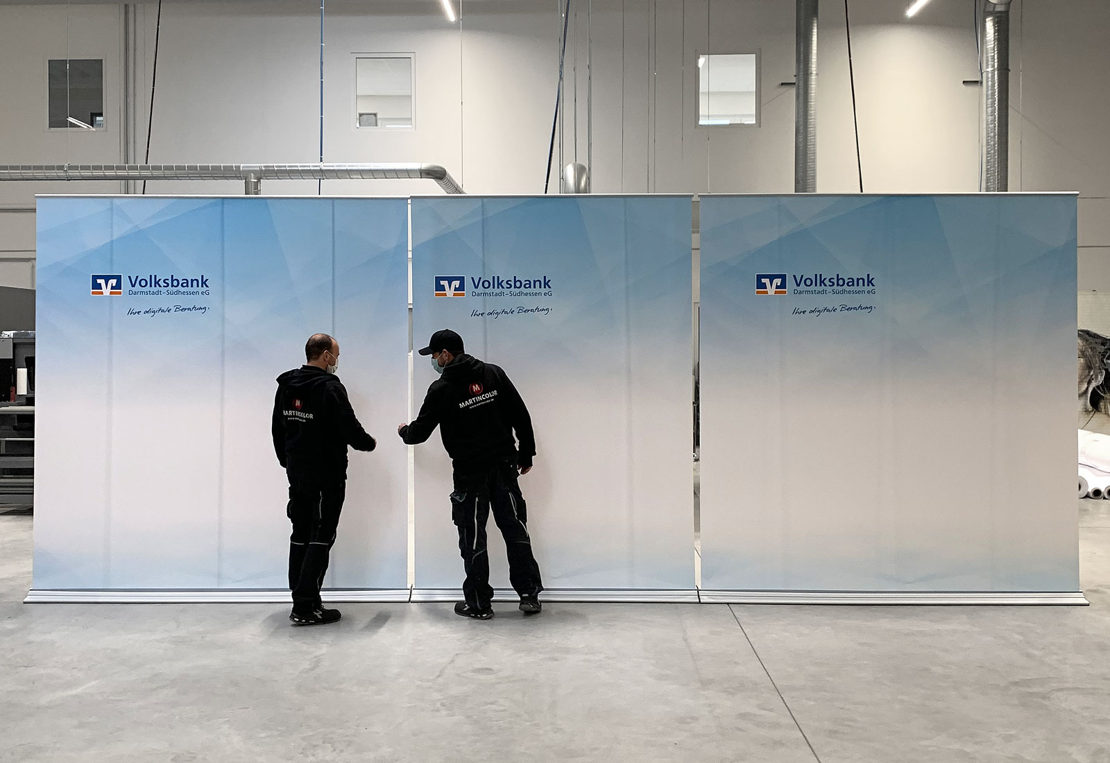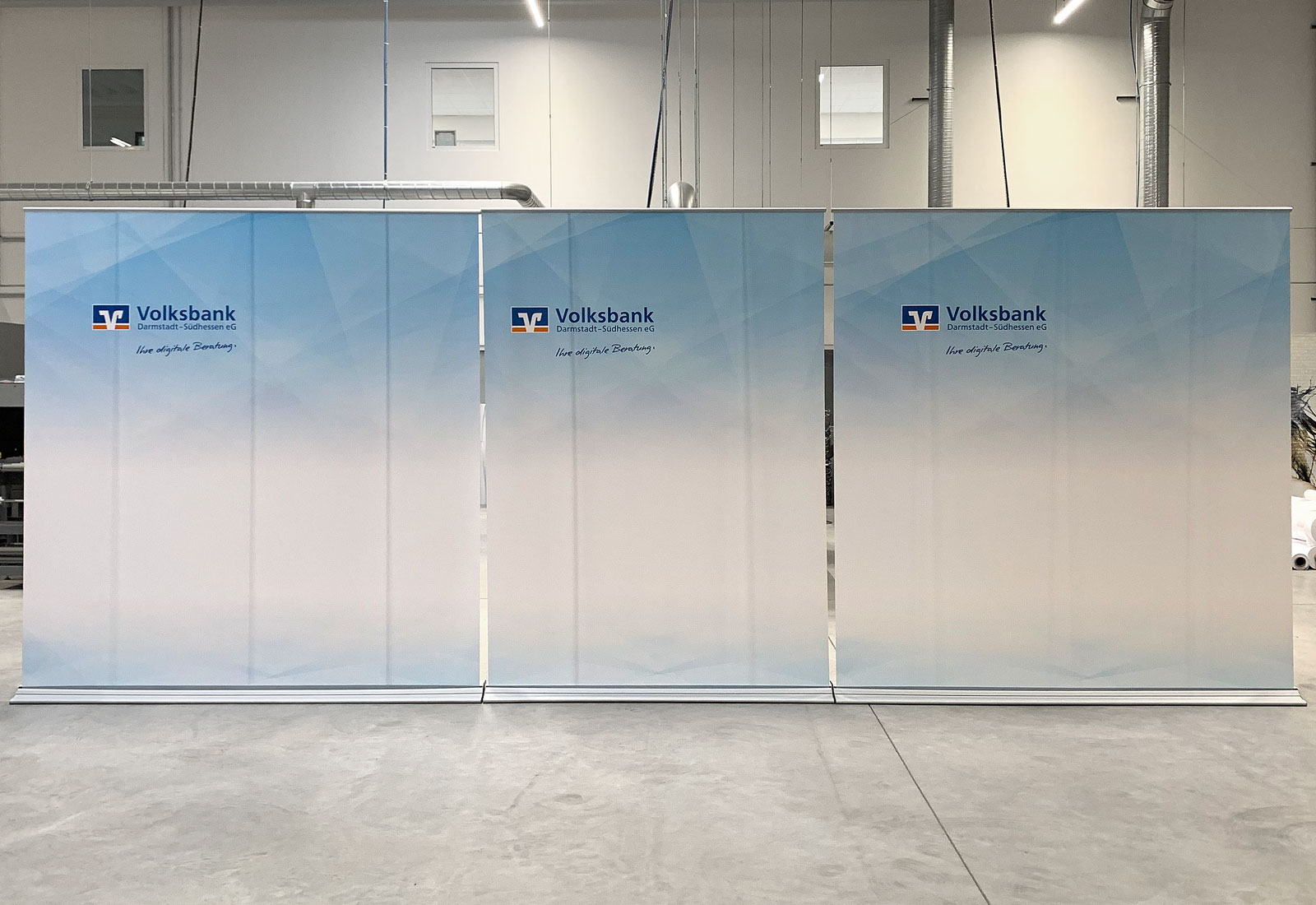 Wenn Sie für Ihre Online-Pressekonferenz Rückwände benötigen, die innerhalb weniger Minuten aufgebaut werden können, sind unsere XXL-RollUps genau das Richtige. Diese megagroßen RollUps gibt es in den Systembreiten von 149 cm, 179 cm, 238 cm und 317 cm. Die mögliche Höhe beträgt dabei immer 250 cm. Werden mehrere Mega RollUps nebeneinander gestellt, wie hier bei der Volksbank Darmstadt-Südhessen zu sehen, kann man auch große Wandabwicklungen realisieren. Nach dem Einsatz sind diese RollUps sekundenschnell abgebaut und werden in gepolsterten Transporttaschen für den nächsten Einsatz sicher verstaut.