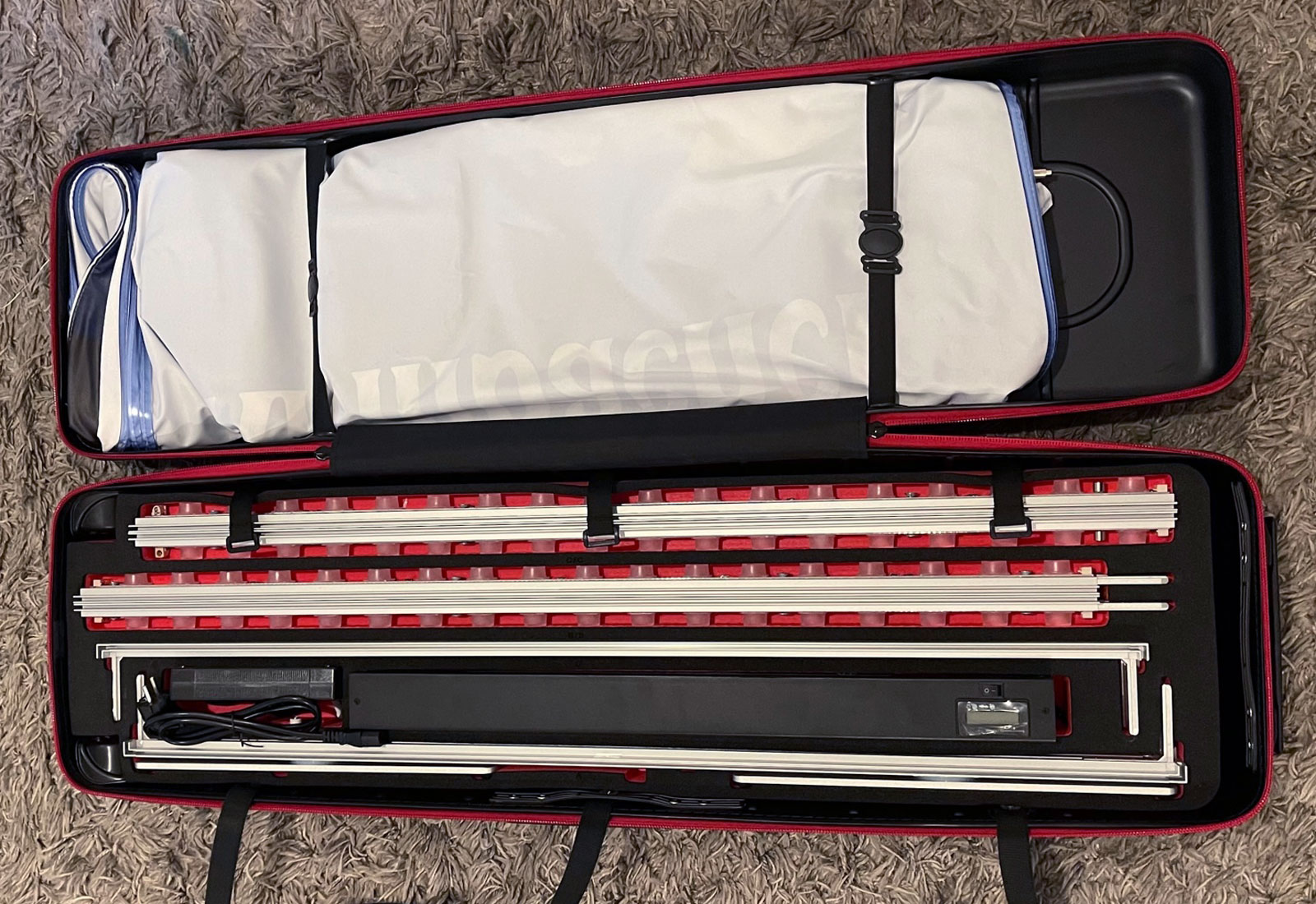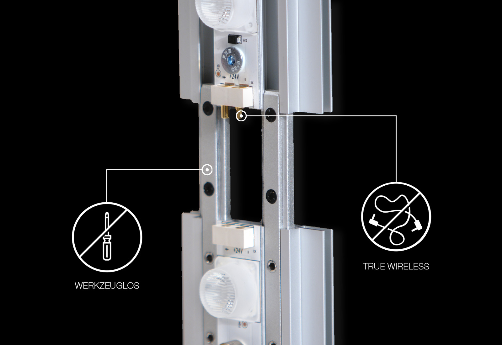 Endlich gibt es ein LED Leuchtdisplay mit integriertem Akku - das neue LED-Display GLOW UP. Ideal für einen kabellosen Einsatz wenn z.B. keine Steckdose bereit steht oder das Leuchtdisplay kabellos mitten in einem Raum platziert werden soll. Wie unsere vielen anderen Leuchtdisplays auch, kann GLOW UP doppelseitig mit individueller Diabespannung versehen werden. Die hocheffizienten LED Module sind in dem Aluminiumprofil des Rahmens bereits einsatzfertig montiert. Die Aluminiumprofile werden zum Aufbau einfach zusammen gesteckt. Die Beleuchtung hat eine Systemleistung von 50 Watt, 12.600 lm und eine Farbtemperatur von 6.500 Kelvin. Der Clou von GLOW UP Battery ist allerdings der integrierte Akku aus einem leistungsstarken Lithium–Ionen Powerpack, der eine Laufleistung von 10 Stunden besitzt. Das LED-Rahmensystem ist in einem praktischen ABS-Transportkoffer mit Rollen verpackt und damit ideal für den stabilen Transport.