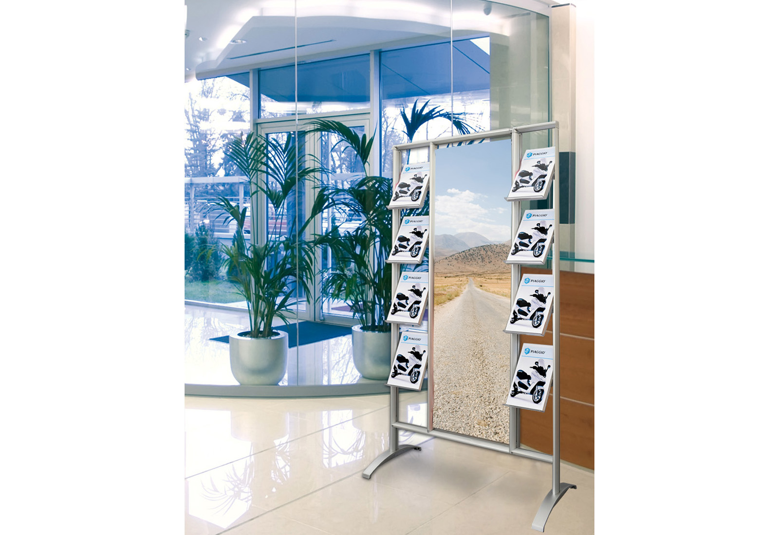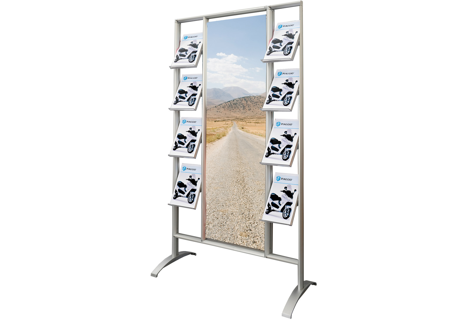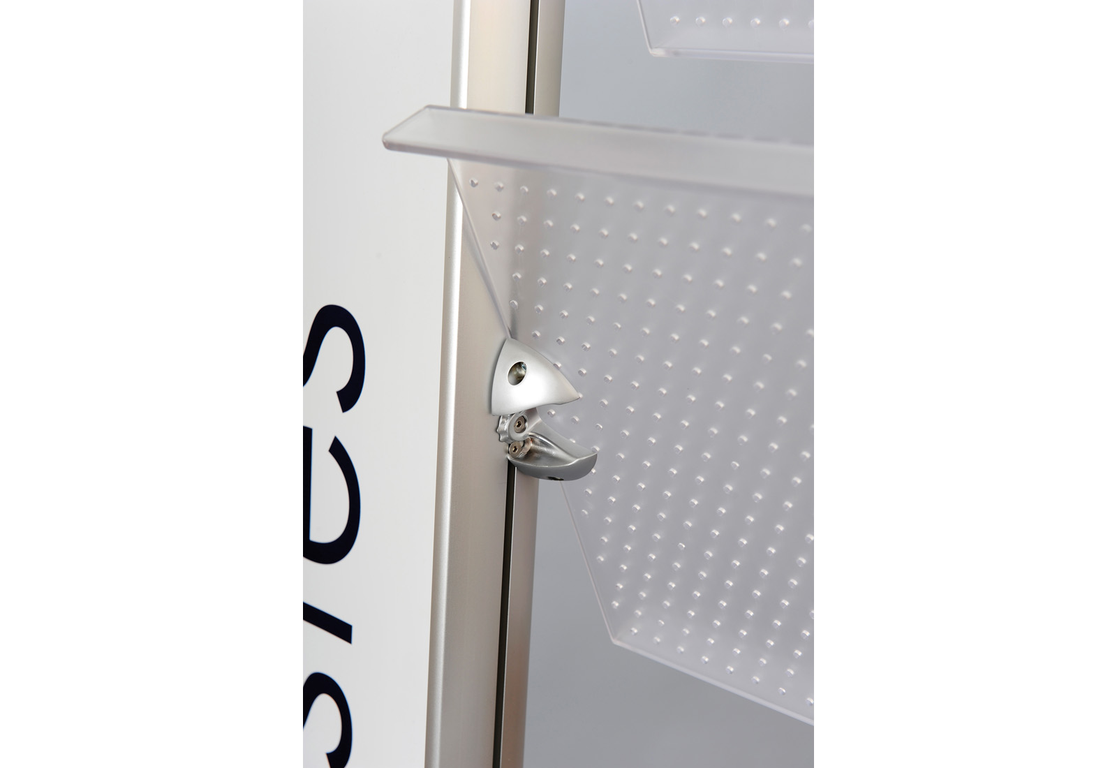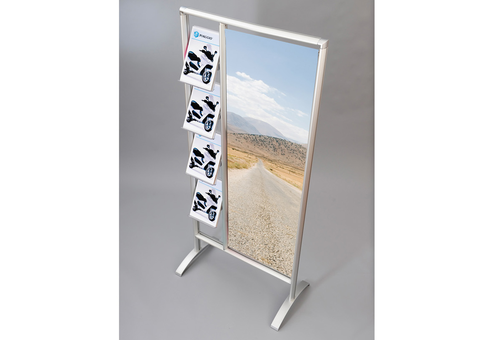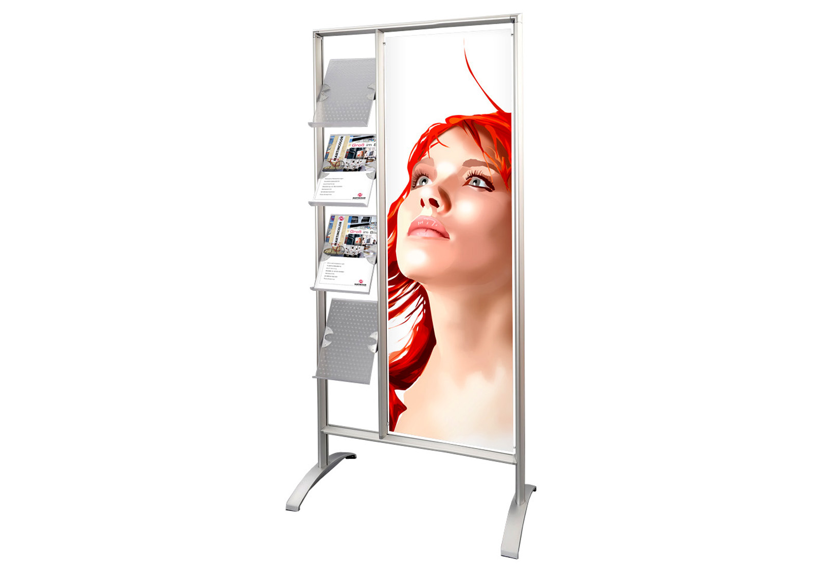 Kombi soistes verbindet Banner- und Katalogpräsentation in einem System. Die integrierten Kunststoffspritzguss-Ablagen sind vierfach neigbar und bieten ausrechend Platz für DIN A4 Prospekte. Für die Befestigung des Grafikdruckes im Format 65 cm x 143 cm schieben Sie einfach die Haltstangen durch den oberen und unteren Hohlsaum des Banners. Die Höhe der Haltestangen ist individuell einstellbar, sodass auch kürzere Banner eingesetzt werden können. Das komplette System wir in einer Transport-Kartonage geliefert.