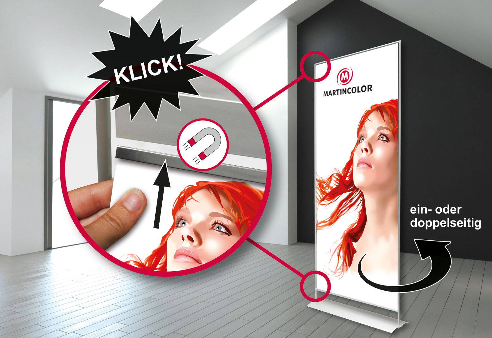 Endlich gibt es ein Bannersystem, dass man so schnell aufbauen kann wie ein RollUp. Und - man kann das Grafikbanner WIRKLICH selber auswechseln! Möglich macht das die patentierte Magnettechnik von myWizard. Mit einem "Klick" wird das mit einer Metallleiste versehene, individuell bedruckte Banner in das myWizard-Profil gestreckt. Fertig! So macht ein Motivwechsel richtig Spaß und ist sekundenschnell erledigt. Das System ist in Höhen (163 cm, 203 cm) und drei Breiten (60 cm, 85 cm, 100 cm) lieferbar. Der Aufbau des Grundsystems ist kinderleicht und erfolgt durch einfache Steck- & Schraubverbindungen. Durch die hochwertigen Materialien ist MyWizard besonders stabil und strapazierfähig. Standfuß und Systemrahmen sind aus silber eloxiertem Aluminium gefertigt.