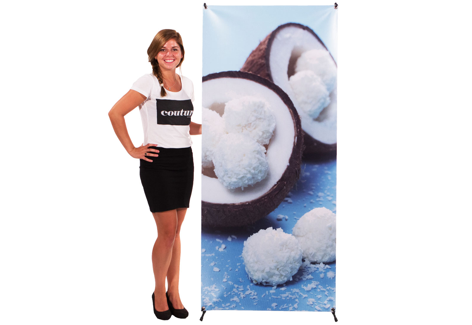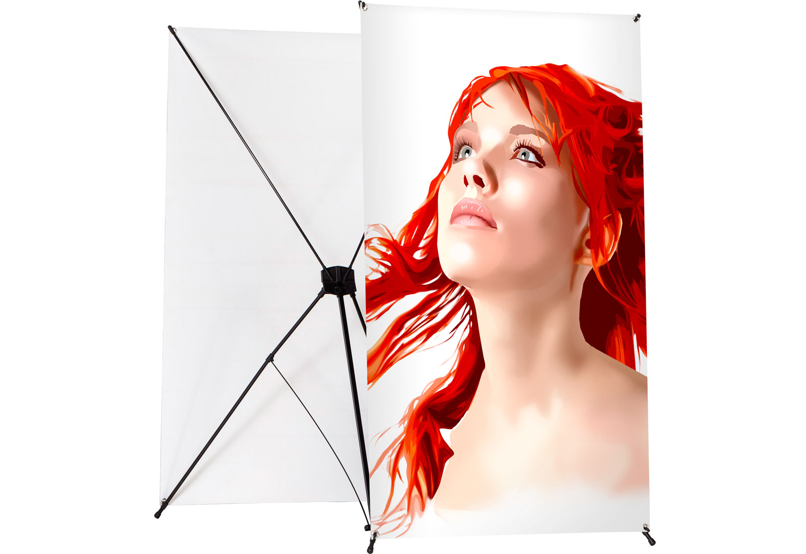 Das X-Banner ist ideal für den sekundenschnellen Grafiktausch, denn das geöste Grafikbanner wird einfach an den vier Eckpunkten in die vorstehenden Halter eingehakt. Die Halterungen können nach Belieben verstellt werden damit die Bannerhöhe flexibel ist und das Banner straff eingespannt werden kann. Das System besteht aus einem faltbaren Aluminium-/Kunststoff-Gestänge und ist für Bannergrößen 60x160 cm, 80x180 cm, 100x200 cm sowie 120x200 cm lieferbar. Eine praktische Transporttasche ist inkludiert.