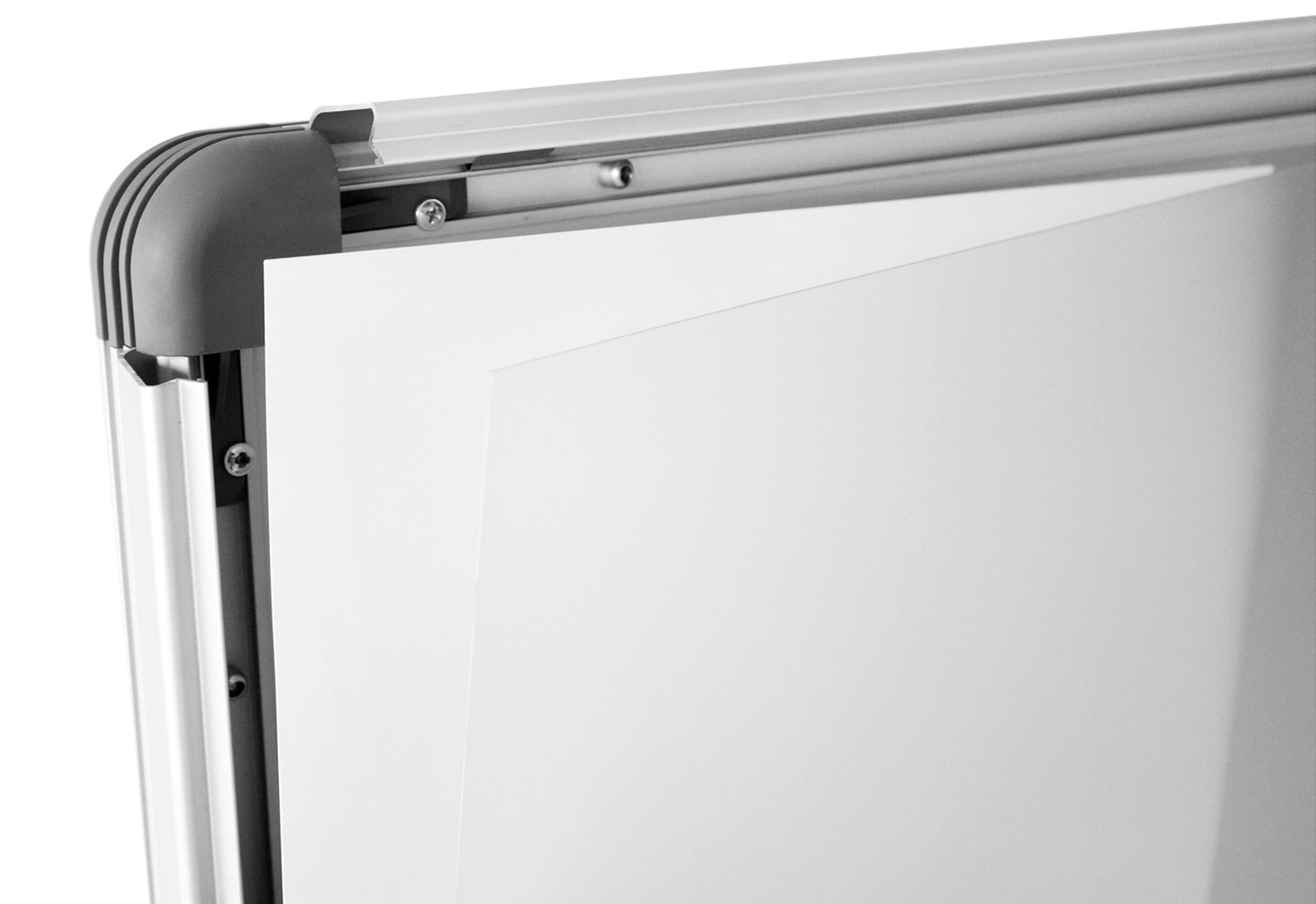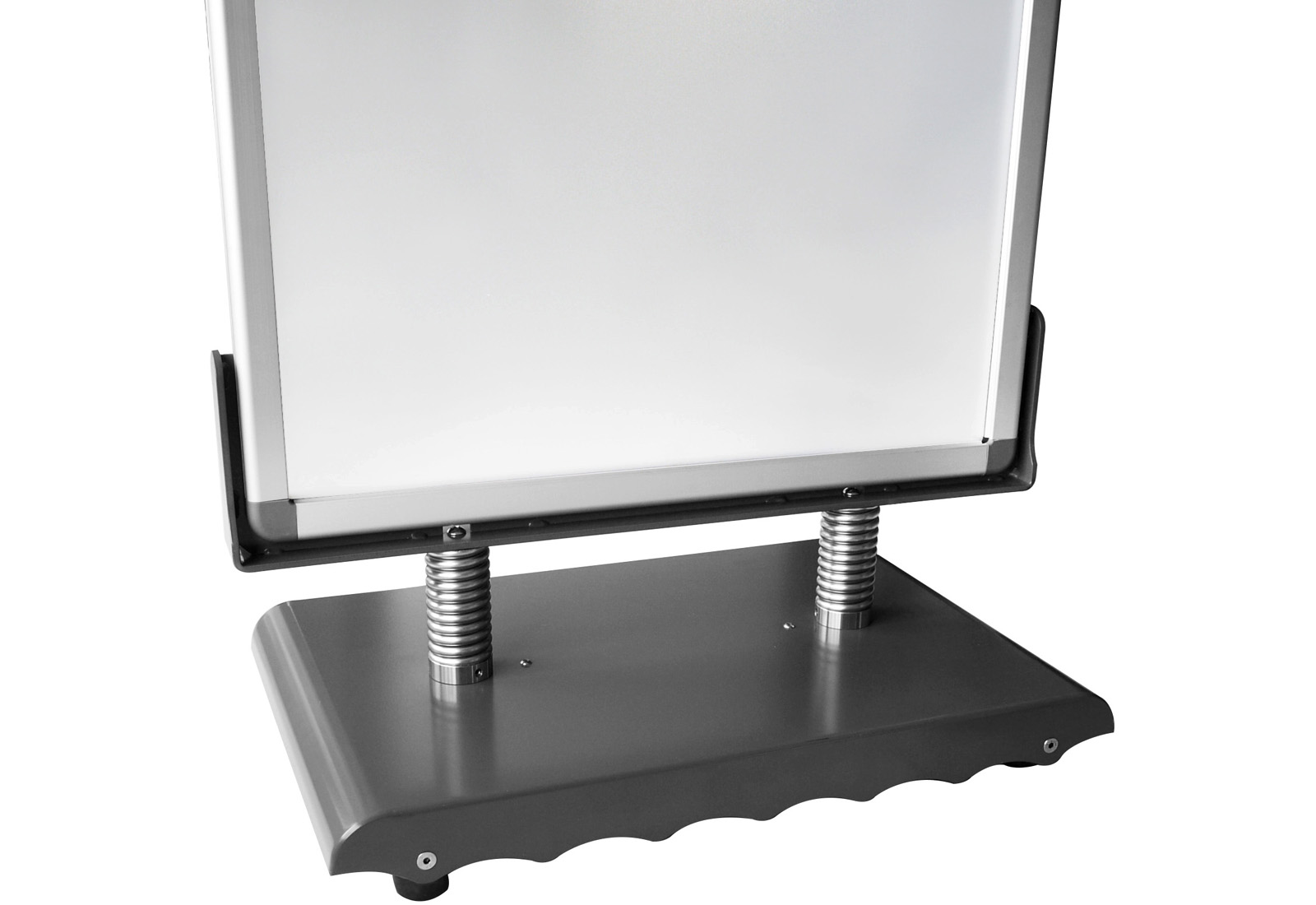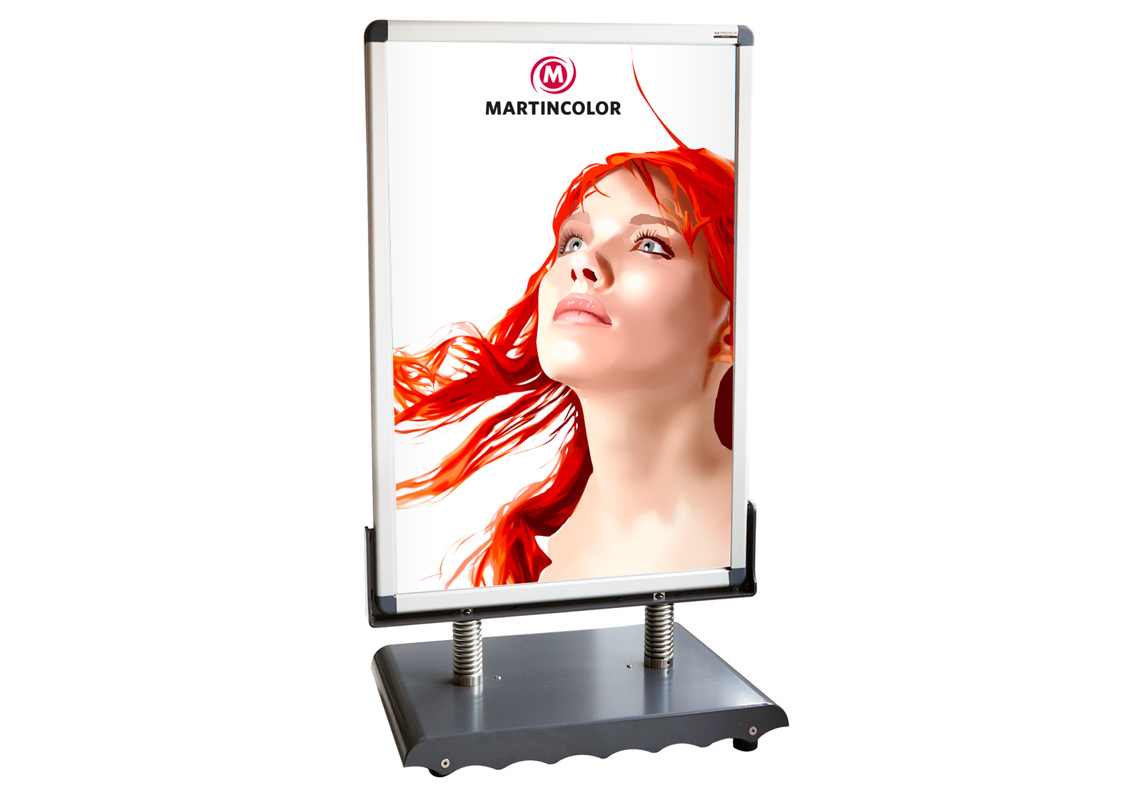 Clip Car ist ein stabiler Klapprahmen, auch für den Outdoor-Bereich. Die in den Kundenstopper eingesetzten Plakate befinden sich unter einer Spritzwasser geschützten UV-Schutzfolie. Der doppelseitig mit Plakaten bestückbare Kundenstopper hat ein überaus ansprechendes Design und verfügt über eine clevere Transport-Technik. Clip Car einfach hochklappen und schon lässt sich das Display auf den Vollgummirollen in Position bringen. 2 Räder sind lenkbar für einfaches manövrieren. Zugeklappt steht Clip Car unbeweglich, da die Feststellbremse aktiviert ist.