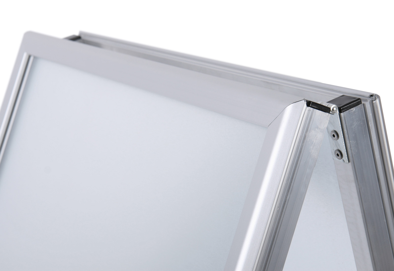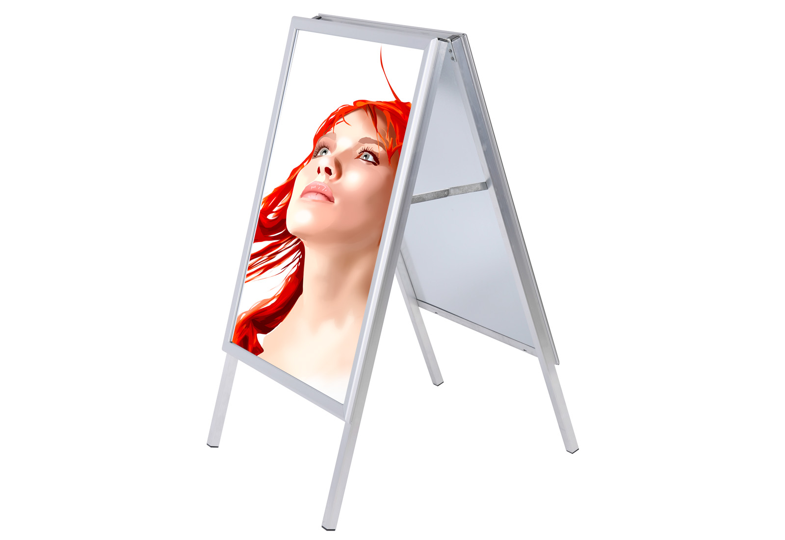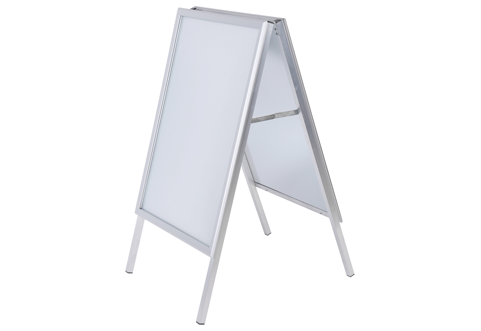 Der doppelseitiger Kundenstopper mit Gehrungs-Klapprahmen (Ecken abgerundet) ist sehr stabil mit 25 x 25 mm starkem Standprofil ausgestattet. Die doppelseitig aufmontierten 32-mm-Klapprahmen bestehen rückseitig aus einer extrem schlagfesten, rostfreien Metallwand. Der Plakatständer ist wetterbeständig mit integriertem Wasserablauf im Unterprofil und UV-stabilisierter, nicht reflektierender Abdeckfolie. Auf Wunsch auch lieferbar in fast allen RAL-Farben. Aufsatzschild, passende Prospektkörbe und Schreibtafeln sind optional erhältlich. Mögliche Formate: DIN A0, DIN A1, DIN A2, 50 x 70 cm, 70 x 100 cm.